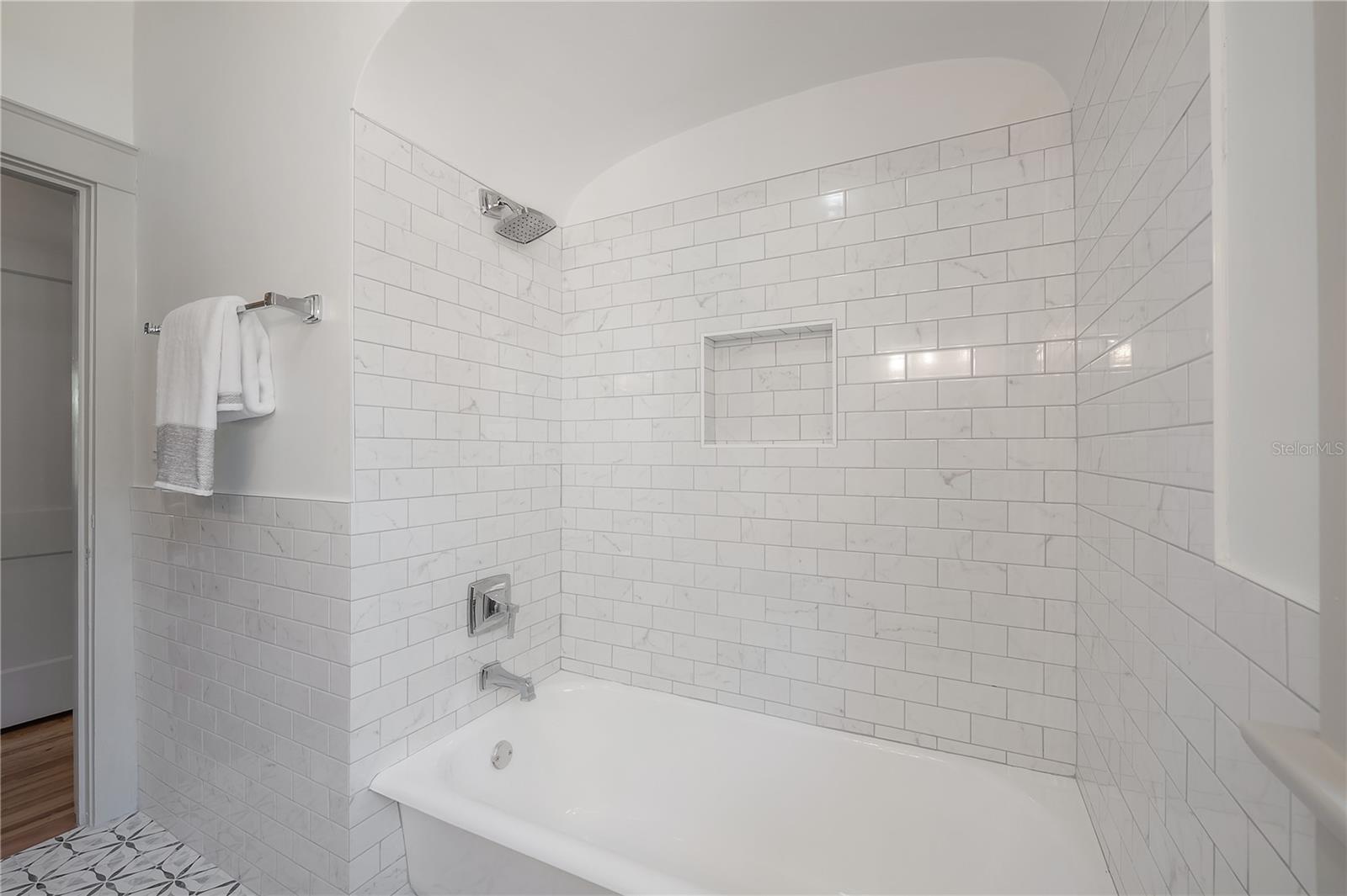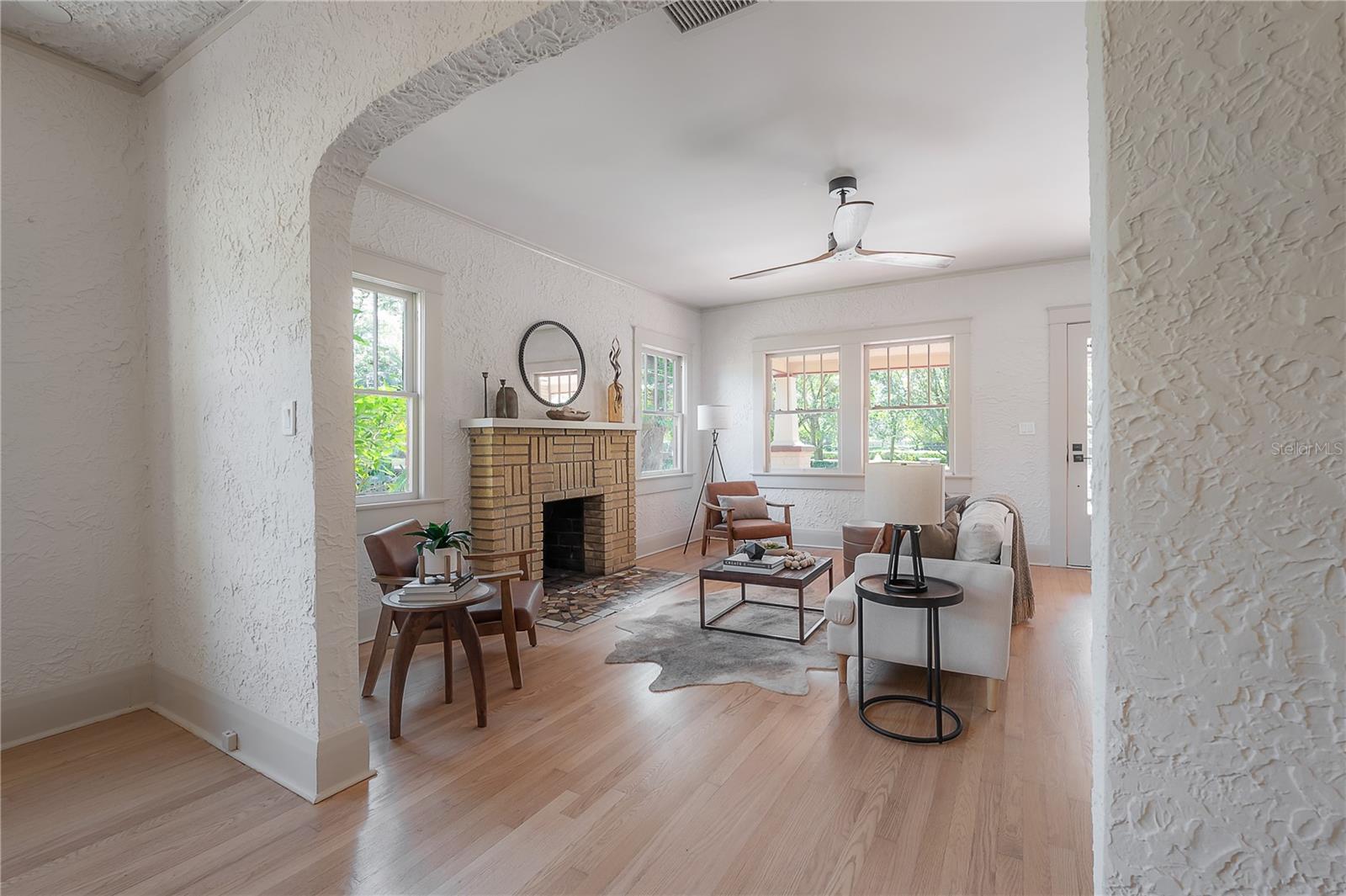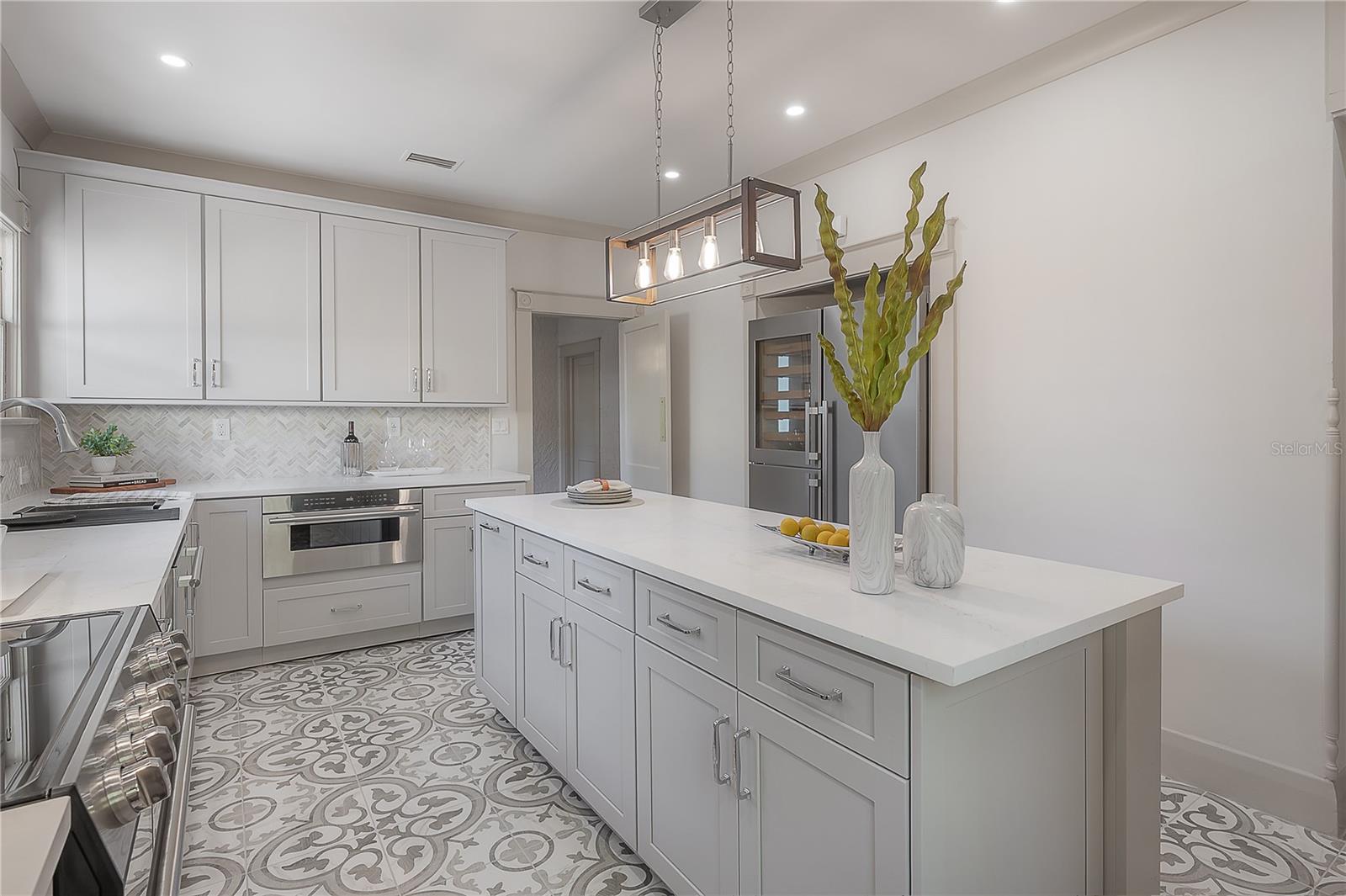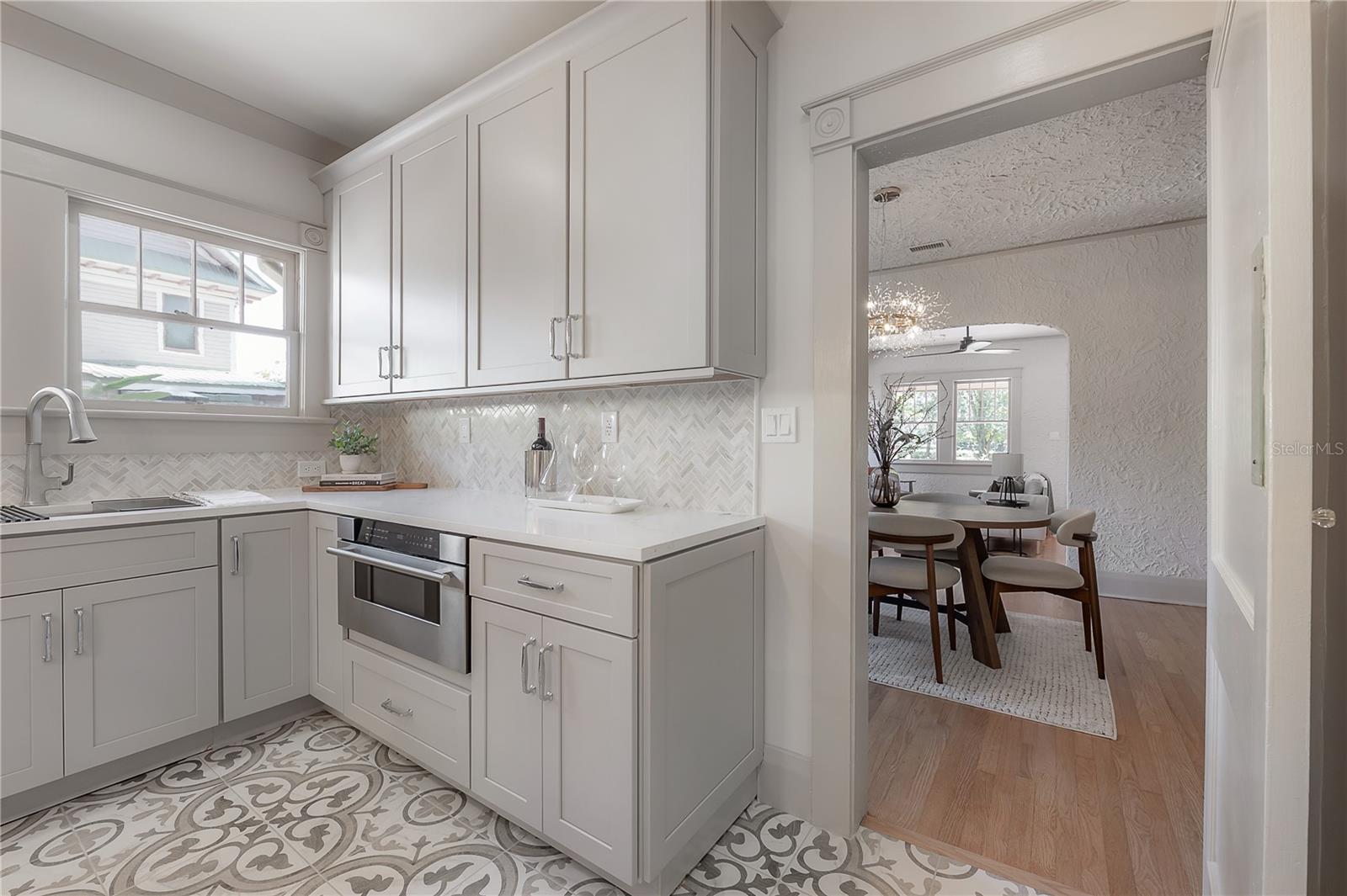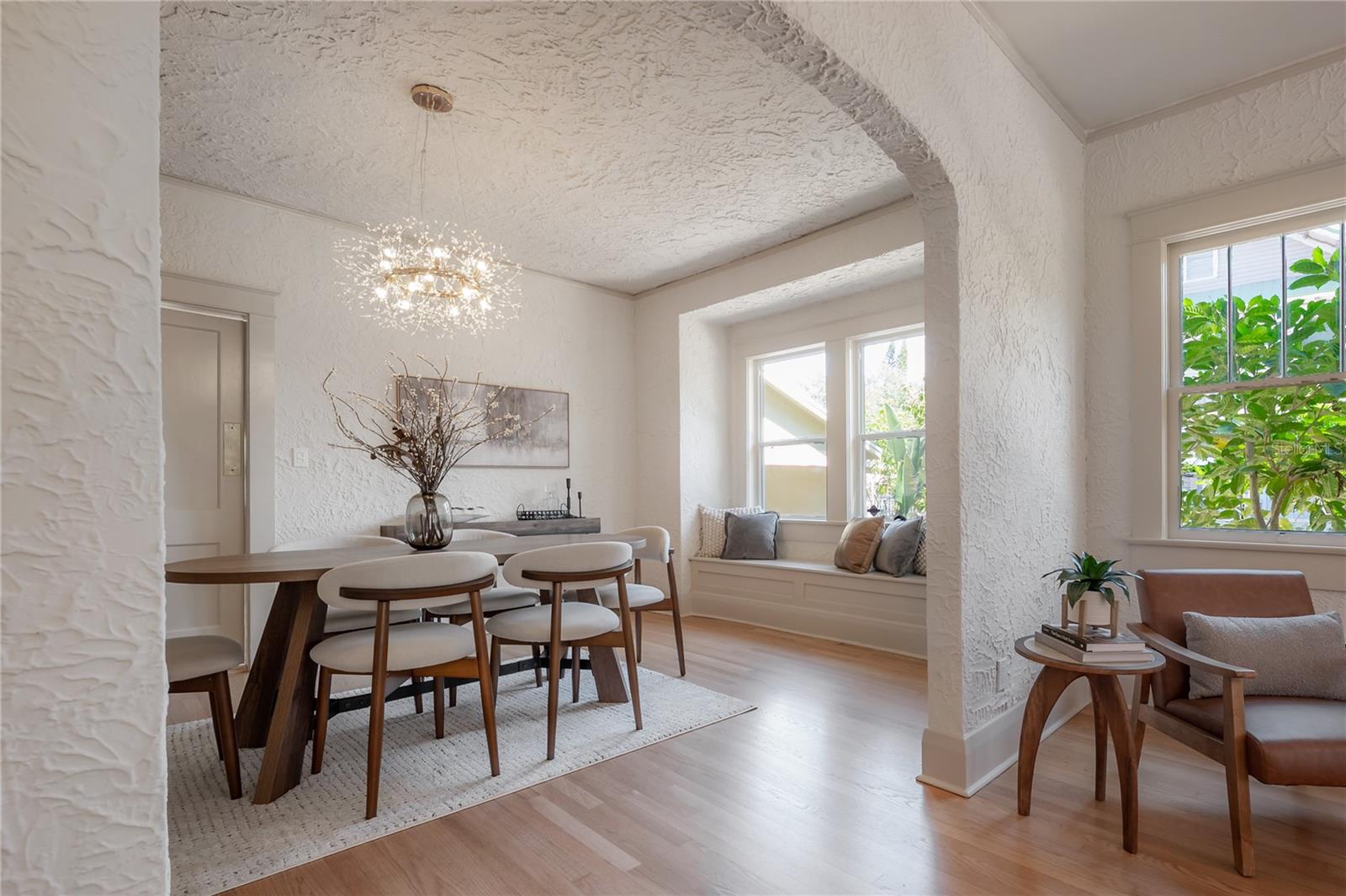 Welcome to your dream bungalow in the heart of the Seminole Heights Historic District! Every detail has been thoughtfully updated to create a warm, inviting, and elevated living experience. A charming front porch and refreshed front deck set the tone the moment you arrive, leading into a light-filled interior where restored original wood floors and Spanish-style textured walls add character throughout. The open living and dining areas flow seamlessly into the fully renovated chef’s kitchen featuring all-wood soft-close cabinetry, quartz countertops, herringbone backsplash, and premium Forno and Liebherr appliances including an induction range, hood, microwave drawer, and refrigerator with built-in wine storage. This 3-bedroom, 2-bath home also includes a bright office/sunroom with French doors. The primary suite offers a beautifully updated bath with designer tile and modern fixtures, while the hall bath blends charm with a refreshed vanity, patterned flooring, and a restored original cast-iron tub. Outside, enjoy a serene backyard framed by mature bamboo, paver walkways, and a patio, along with a detached shed with electricity and a covered carport for flexible use and storage. With its prime location near the Seminole Heights Garden Center and minutes from Tampa’s best restaurants, parks, and amenities, this move-in-ready bungalow perfectly balances historic charm with modern comfort.