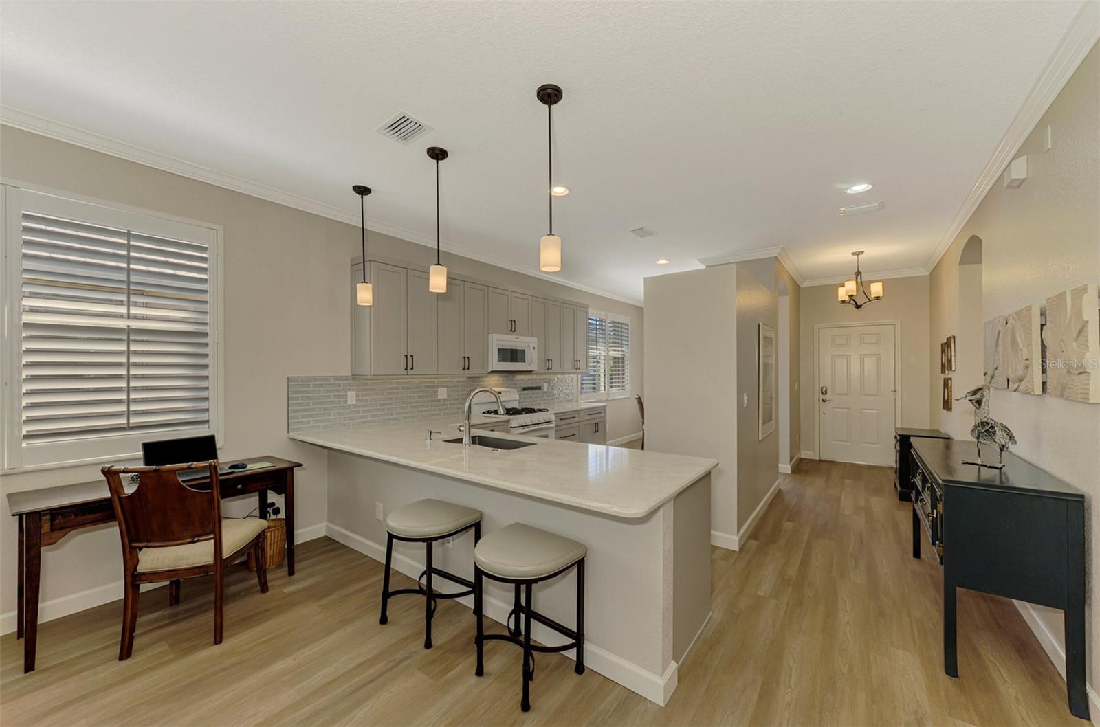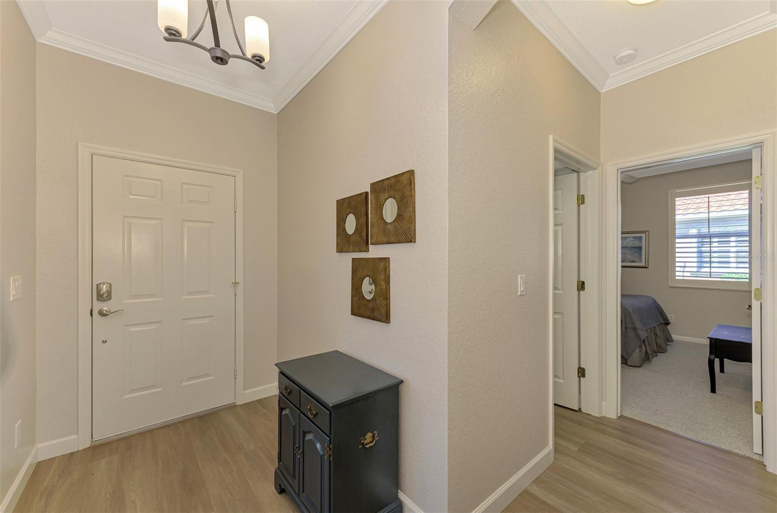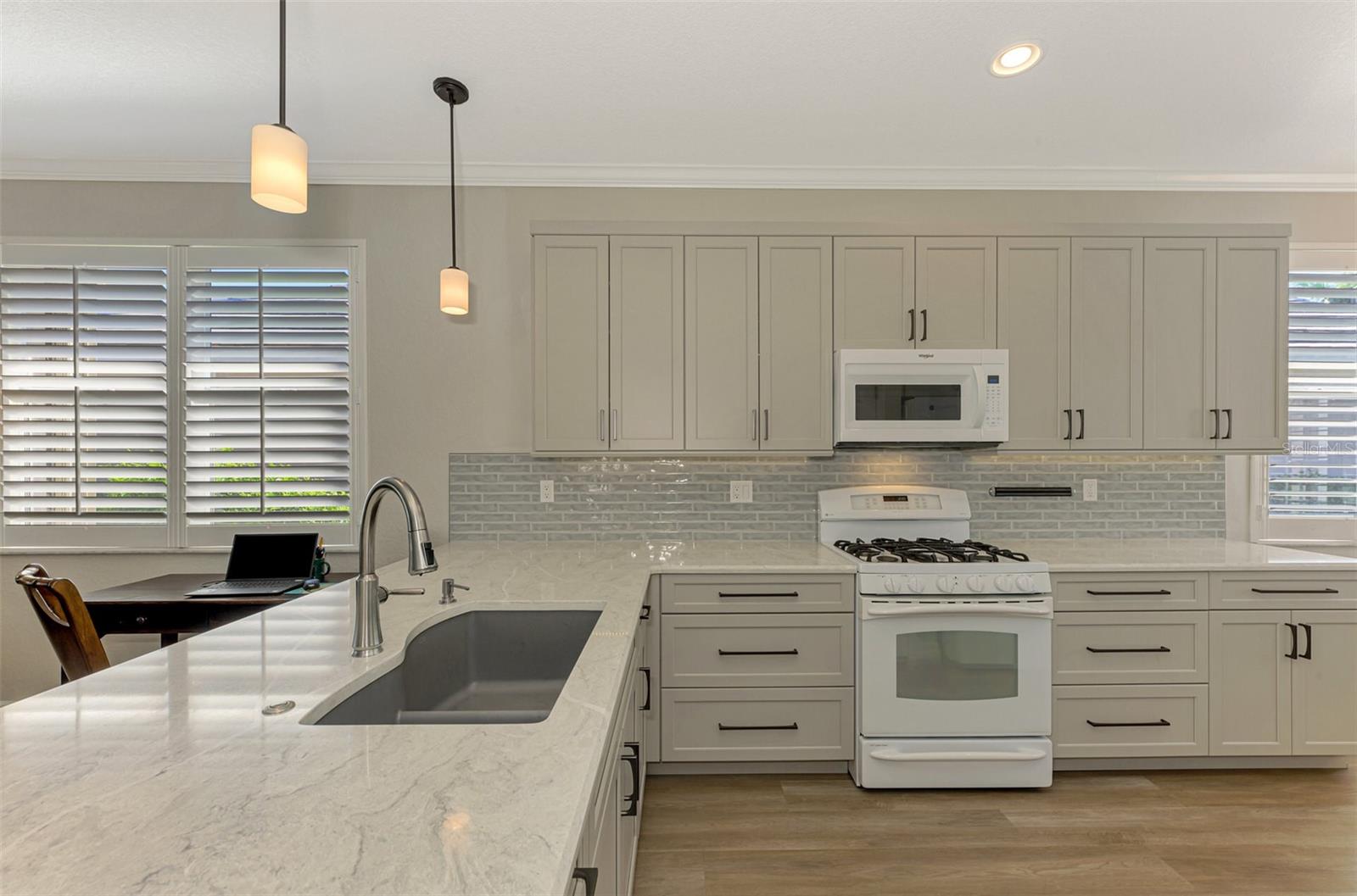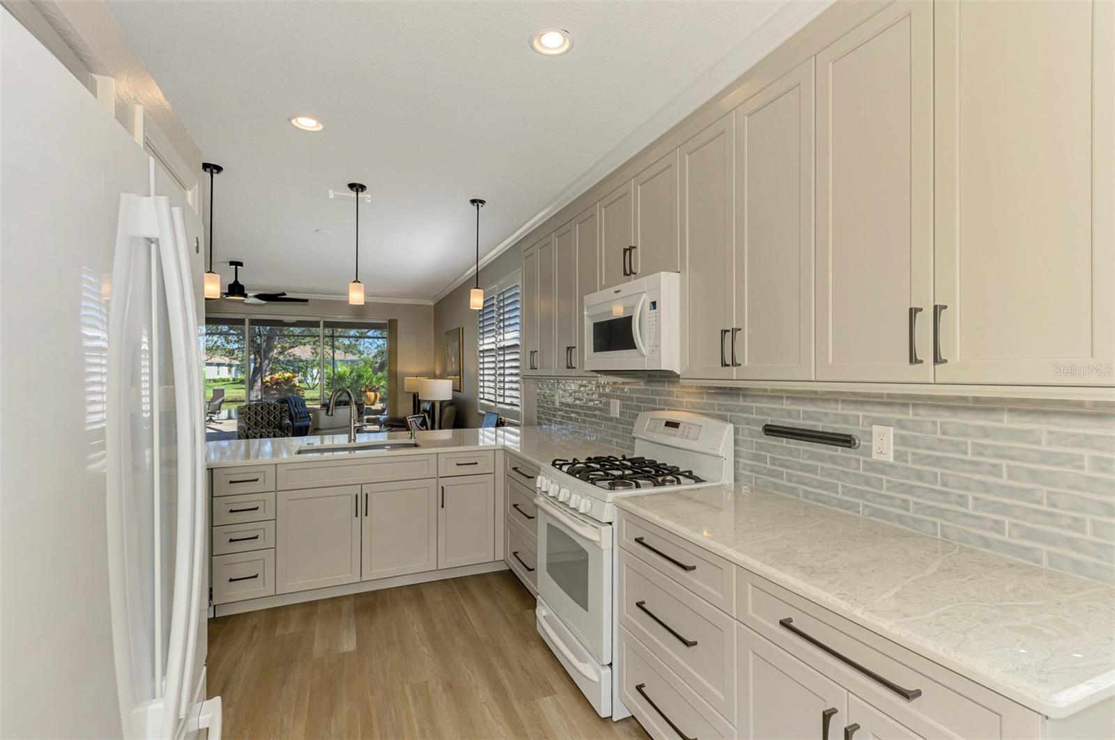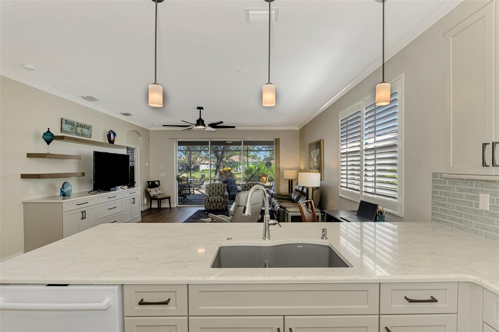 This FULLY REMODELED home with today’s MODERN TRENDS is a SHOWSTOPPER- From the home’s inviting curb appeal and well-maintained landscaping to its expansive outdoor lanai, this 3 Bedroom 2 Bathroom home is ready for you to move right in! The expansive lanai for relaxation and entertaining features a heated oversized spa with decorative tile accents and a planter, all conveniently controlled with electronic settings. Surrounded by Florida’s natural beauty, the home offers serene water views that provide a peaceful and private retreat. Inside, the updated interior strikes the perfect balance between modern style and everyday comfort. Highlights include quality cabinetry, sleek quartz countertops and replaced appliances, complemented by upgraded luxury vinyl floors, a stylish tiled backsplash and a custom-built entertainment center. Plantation shutters, crown molding and other charming details add character throughout. The primary bedroom features a renovated bathroom with an expansive Roman walk-in shower and two closets for extra storage. The third bedroom offers versatility with a built-in desk and a Murphy bed, making it ideal for a home office or guest space. Adding even more value, this home includes a 2023 NEW METAL ROOF for peace of mind. Nestled in the resort-style, gated community of Riverwood, this home is perfectly situated to enjoy all the amenities and activities the neighborhood provides. Residents love the tree-lined walking and biking paths, tennis and pickleball courts, a lap and resort-style pool with a hot tub, fitness center, and a variety of social activities and classes at the Activity Center. Golf enthusiasts can take advantage of the Riverwood Golf Club’s Par 72 Championship course, while pet owners will appreciate the R.O.M.P. Dog Park. Members can also enjoy access to the exclusive Beach Club on Manasota Key (membership based on availability). Conveniently located between Sarasota and Fort Myers on Florida’s stunning West Coast, Riverwood provides easy access to boating, cultural events, dining, shopping, and the gorgeous beaches of Southwest Florida. This home is the ideal blend of relaxed living and stylish upgrades. Don’t wait—contact your agent today to view all that this well-appointed Riverwood Home and Community provides.