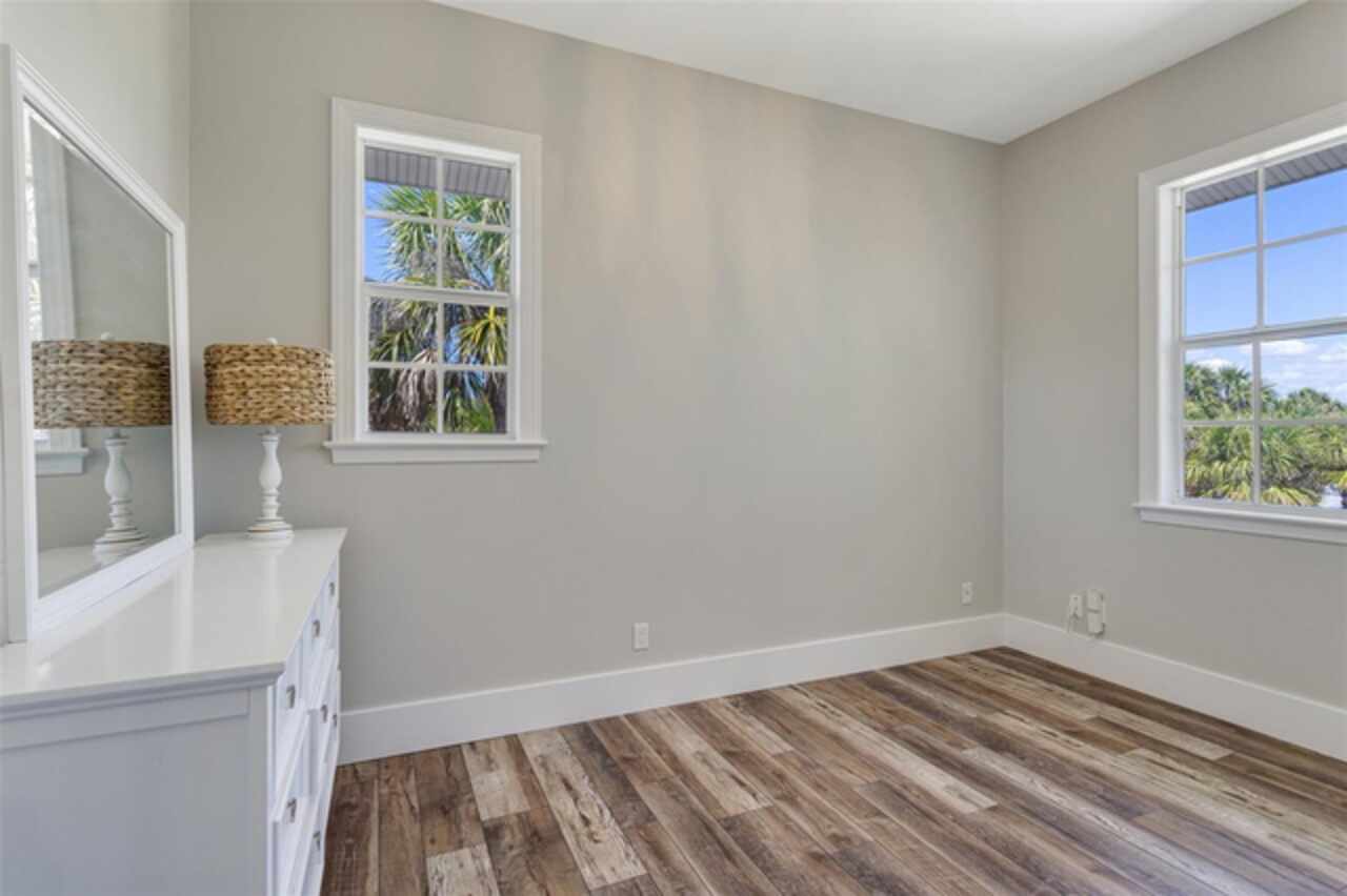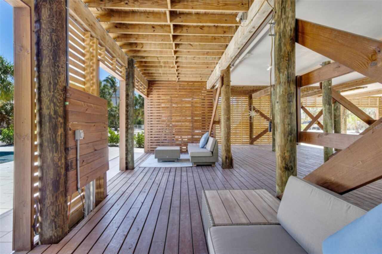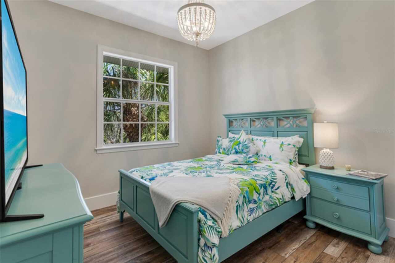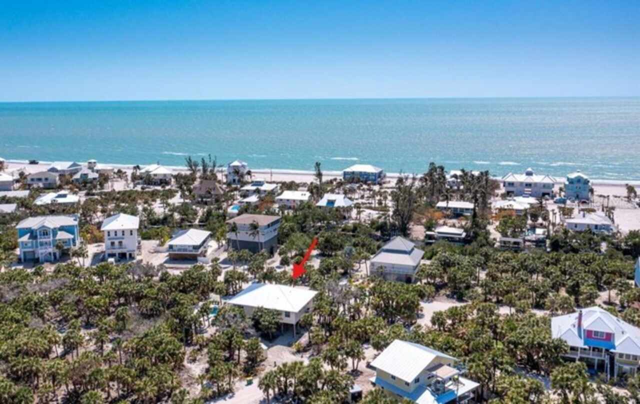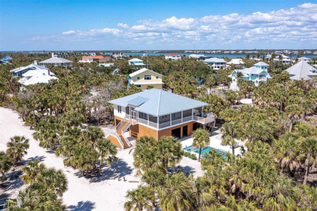 This beautiful 1, 430 sq. ft. home features 3 bedrooms and 2 bathrooms with 10-foot ceilings and many windows for natural light. Being offered with all interior furniture and some outdoor furniture. This home is approximately one block from the beach, where you can enjoy breathtaking sunsets. Palm Island is a peaceful retreat, accessible only via a car ferry, creating a sense of privacy that feels like living in a gated community. Here, you'll experience a step back in time to a truly natural Florida island. The interior of the home was renovated in a coastal modern style, added crab trap and expanded outdoor living space and storage underneath the home all completed in 2022. Additionally, a large new pool was added in 2022, and a new roof with new blown-in insulation was added in 2023. This home is within easy walking distance to the beach, or you can easily use a golf cart to get there. Speaking of the beach, it offers fantastic treasures like shells and shark's teeth, and you’ll often find it nearly empty when you visit.