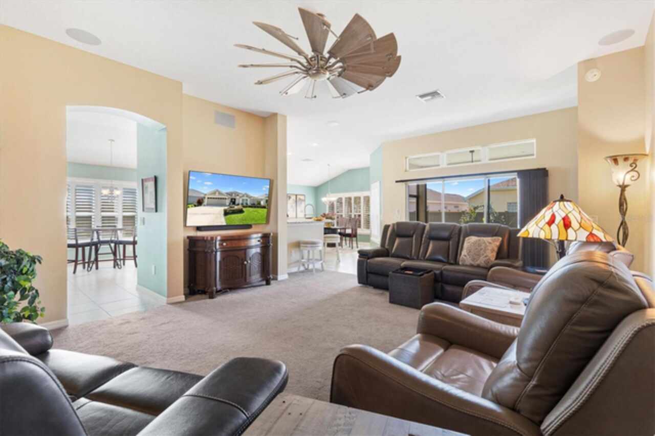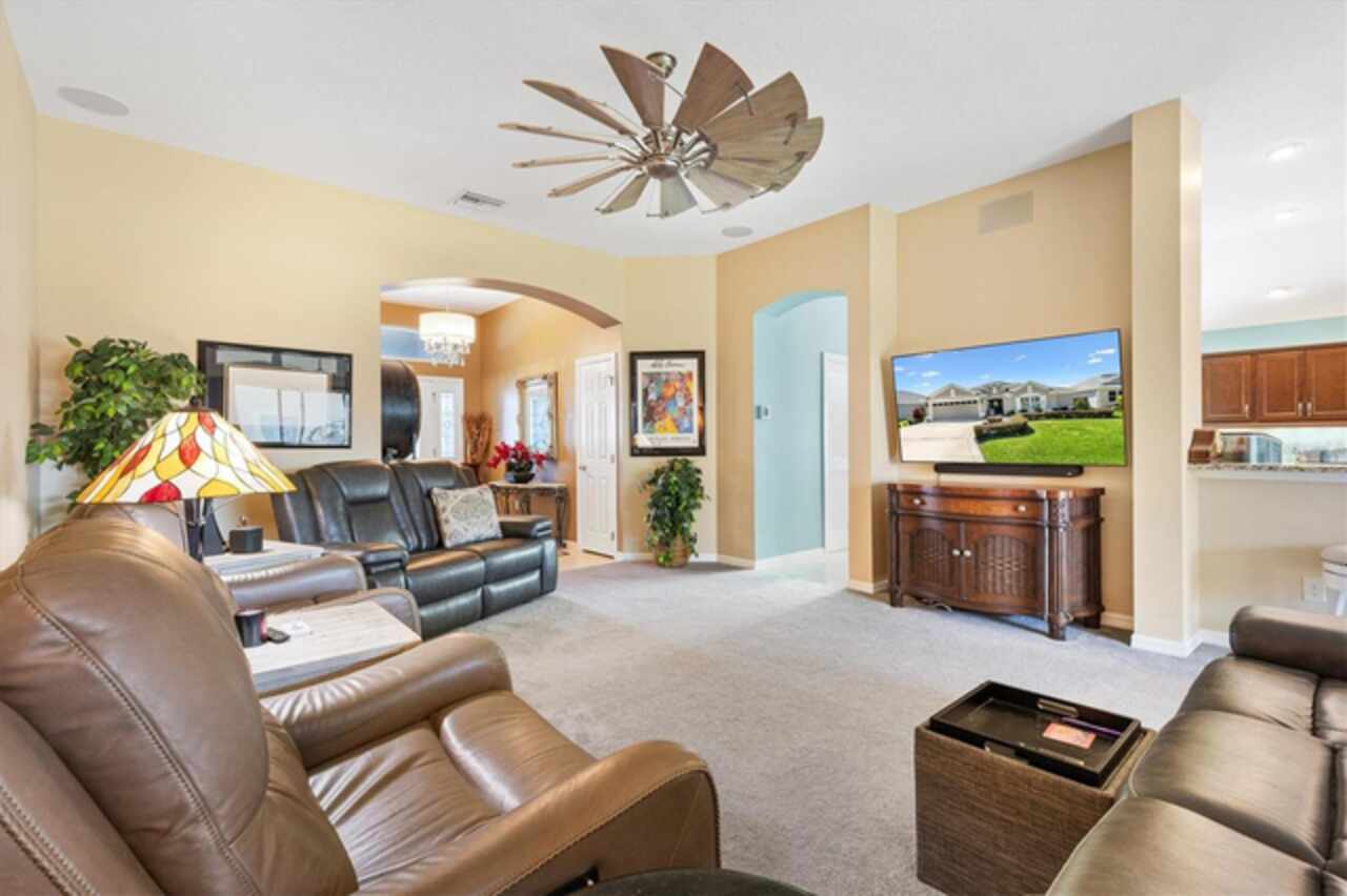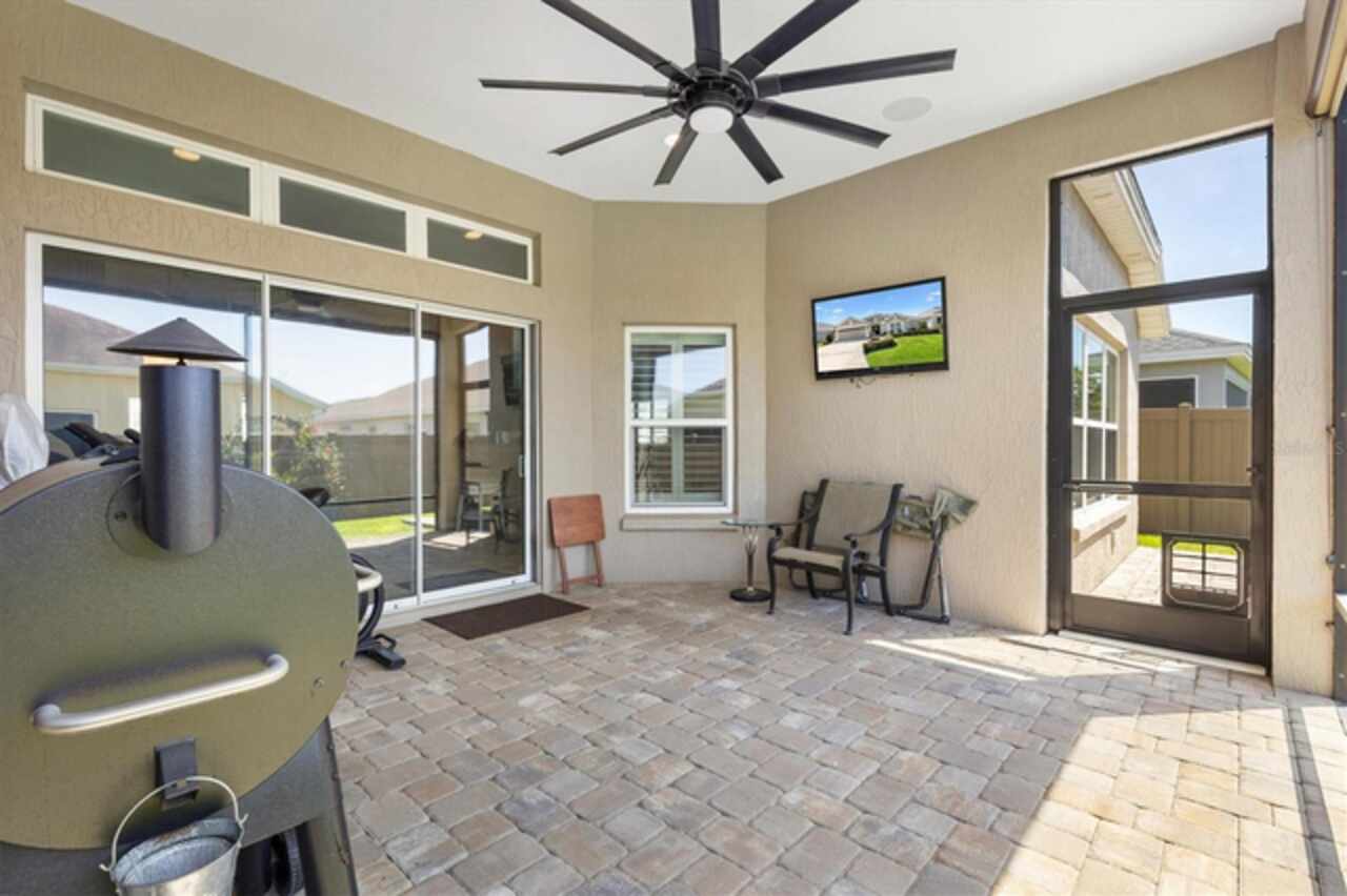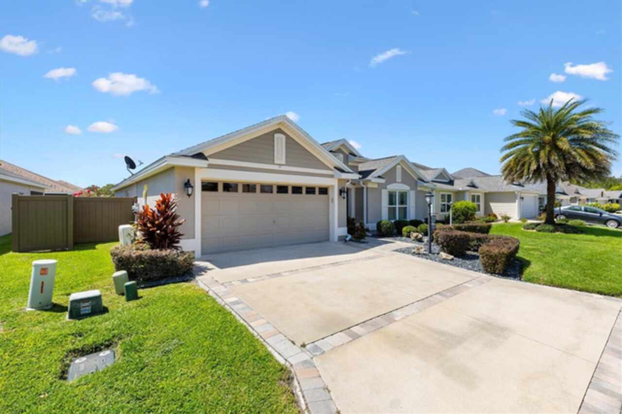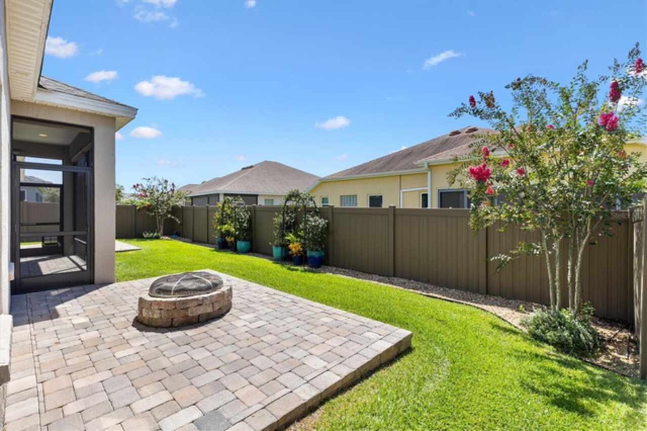 Veranda with Privacy Courtyard • Upgraded 3-Bedroom Holly Model • Move-In Ready. Don't miss this beautifully upgraded Holly Veranda located in the desirable Village of Fenney in The Villages, Florida. Designed for privacy and comfort, this 3-Bedroom, 2-Bathroom Veranda home features a courtyard wall that creates a private outdoor retreat, perfect for relaxing or entertaining. Step inside to discover a spacious and thoughtfully designed floor plan with elegant upgrades throughout. The large kitchen is ideal for everyday living and hosting gatherings, showcasing a curved peninsula, center work island, built-in desk, granite countertops, and pull-out shelving for practical convenience. The dining room is separate from the living area, creating defined yet connected spaces for entertaining and relaxation. The Primary Suite offers two walk-in closets with custom built-ins and a luxurious ensuite bath featuring a Roman shower, split dual vanities, and a separate water closet. The guest suite is located on the opposite side of the home for privacy, with the second and third bedrooms thoughtfully separated by the guest bath. The third bedroom features a tray ceiling and walk-in closet, making it a versatile space for guests or an office. Enjoy outdoor living at its best. Just beyond the screened lanai, you’ll find two patios, including one with a custom hardscape fire pit—perfect for quiet evenings or entertaining under the stars. The private courtyard wall adds a sense of seclusion rarely found in veranda homes, while still allowing open-air enjoyment of the Florida lifestyle. The laundry room is generously sized, with a cabinet-enclosed utility sink, folding station, and upper cabinetry for extra storage. The air-conditioned garage ensures comfort and practicality year-round. Other highlights include neutral color palette, high ceilings, gas utilities, gutters, and added insulation for energy efficiency. This home is move-in ready, meticulously maintained, and loaded with thoughtful upgrades that elevate both style and function. Perfectly situated in one of the most picturesque and natural settings in The Villages, the home is conveniently located near some of Fenney’s best amenities: Blue Heron Postal & Recreation Center (0.6 mi), Fenney Grill (0.6 mi), Spanish Moss Sports Pool & Recreation Center (0.8 mi), and Red Fox & Gray Fox Executive Golf Courses (1.2 mi).This upgraded Holly Veranda delivers the rare combination of privacy, convenience, and elegant design, all within easy reach of dining, recreation, and golf. Discover why the Village of Fenney is one of The Villages’ most sought-after neighborhoods, where nature, lifestyle, and comfort blend perfectly.