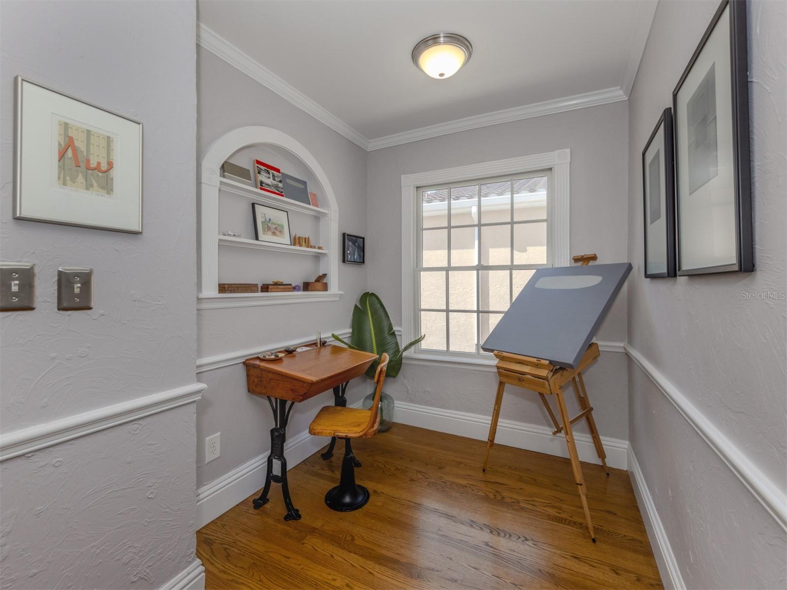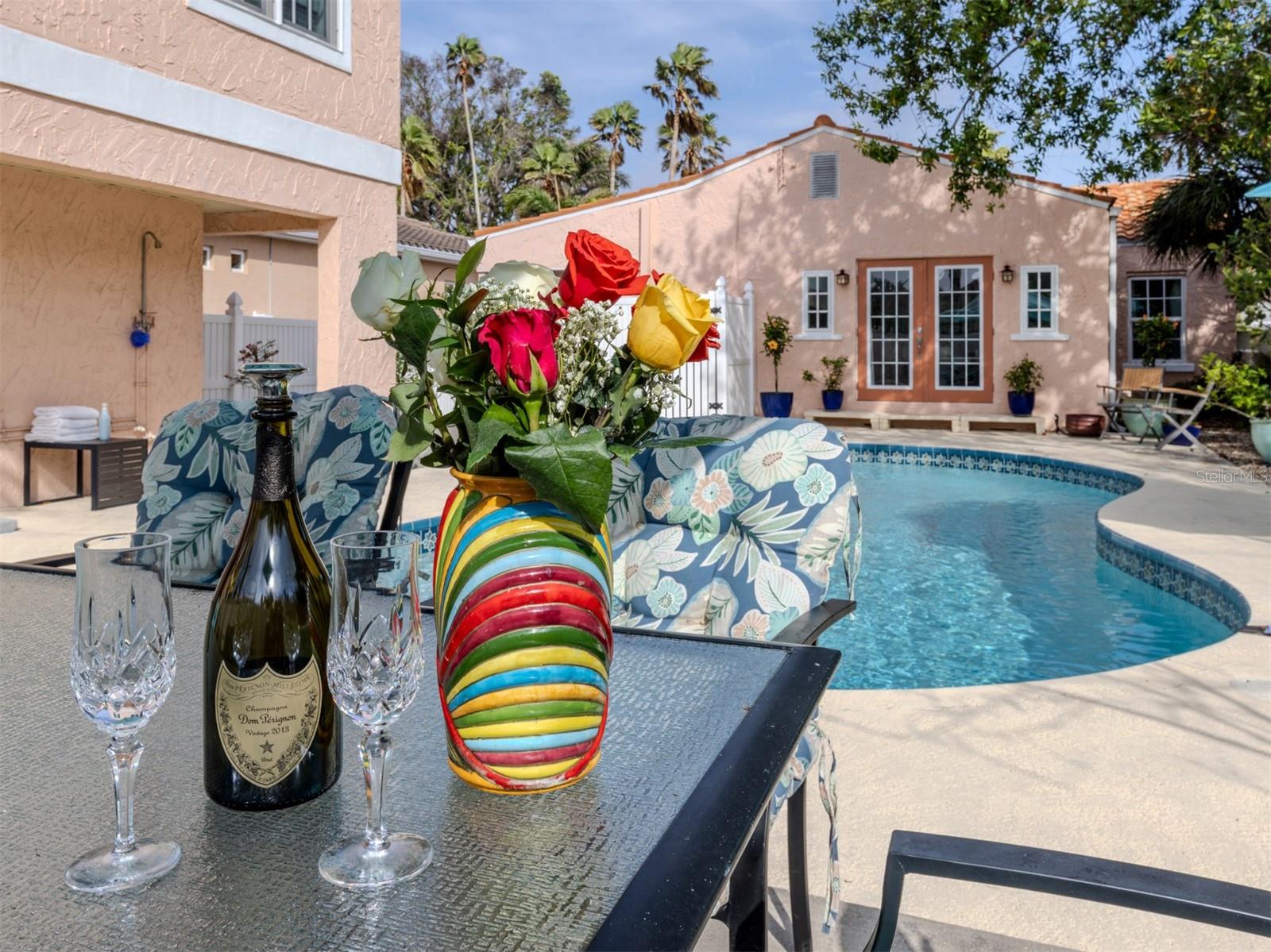 Welcome to one of Venice Island’s charming homes, ideally on one of its desirable streets. With an effective build date of 1995, this beautifully updated Mediterranean residence has been tastefully updated while preserving its character and charm. Just two blocks from shopping and restaurants on Venice Avenue and six blocks from the Gulf beaches, this home offers the best of coastal living. The main house features a thoughtful split floor plan with three bedrooms and two full baths. Architectural details abound, and arched doorways, refinished hardwood floors, built-in display shelves and an original fireplace add warmth and sophistication throughout. The living area flows into the sunlit primary suite through French doors and provides a peaceful retreat with its sitting area, cozy fireplace, and a renovated en-suite bath featuring elegant finishes. The spacious, updated kitchen offers granite countertops, stainless steel appliances and abundant cabinetry. Enter the lovely second bedroom through a hallway adjacent to the kitchen. A lovely state-of-the-art full bath stands between the second and third bedroom used as an office, adding flexibility to the home’s design. Go outside to a private fenced backyard surrounded by tropical landscaping. A heated swimming pool invites relaxation year-round, complemented by an outdoor shower with hot and cold water, ideal after a day at the beach. This tranquil space is ideal for reading, entertaining or simply soaking up the Florida sunshine. Completing the property is a standalone guest house next to the pool at rear of the property. It features a small kitchen, full bath and laundry room. A large second-floor suite boasts rows of windows, hardwood floors and wrought iron details that offer endless versatility. Use it as an art studio, gym, yoga room, game space or in-law suite. Flooded with natural light, it provides comfort and privacy for guests or extended family. Additional highlights include impact-resistant windows throughout and solar panels to enhance energy efficiency and reduce utility costs. This exceptional property captures the essence of Venice Island living, classic charm, modern upgrades and a premier location near beaches, dining and shopping. Schedule your private showing today and experience life in this timeless Mediterranean gem in the heart of Venice Island.