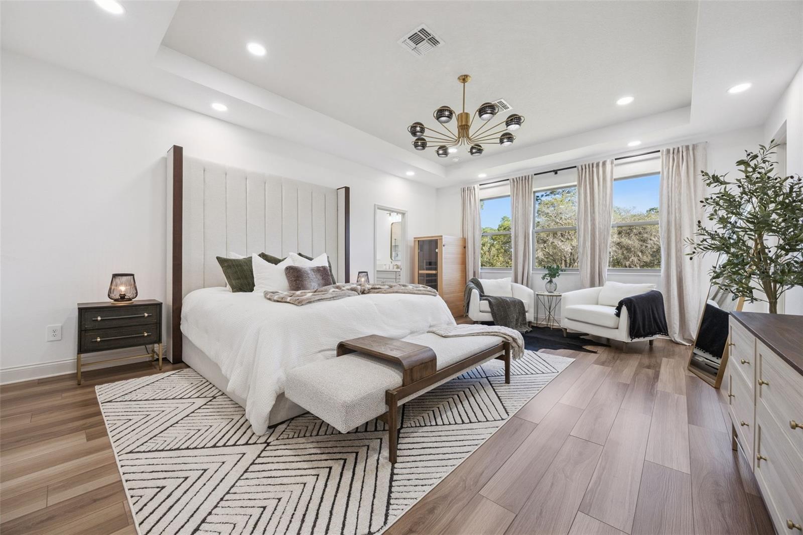 This stunning 5-bedroom, 4-bathroom home is one of the most extensively upgraded properties in the community, offering designer finishes, smart-home enhancements, and peaceful conservation views. Built in 2022 by MI Homes, It has been finished with over $80, 000 in additional custom designer upgrades since its construction. This residence showcases beautiful quartz countertops, a striking marble backsplash, 42” cabinetry, premium GE appliances, a 9+ ft waterfall island, a custom-built butler’s pantry, oversized custom-built master closet, premium upgraded recessed lighting, designer chandeliers and pendants, a dual wine/beverage cooler, under-cabinet lighting, luxury vinyl plank flooring throughout both levels and much, much more! The home welcomes you with a dramatic double-height foyer featuring a sculptural chandelier, a custom geometric feature wall, and warm wood architectural framing—every sightline revealing intentional design. The open living and dining areas are filled with natural light and offer unobstructed conservation views where you can enjoy your morning coffee while watching the wildlife that frequent the property. A first-floor guest suite—complete with a Murphy bed and a full bathroom—provides exceptional flexibility, perfect for visiting guests or to use as a dedicated home office for remote work. Upstairs, you’ll find a spacious loft, a generously sized family room, custom closets in the secondary bedrooms, and an additional private guest suite with a feature headboard, custom lighting and its own en-suite bath. The primary retreat is a true sanctuary. This expansive suite features a tray ceiling, elevated lighting, and a private balcony overlooking serene conservation views. There is plenty of room for a cozy sitting area, ideal for morning coffee or evening relaxation. The fully customized dream closet is a standout luxury feature—designed with pant racks, velvet-lined jewelry storage, belt racks, built-in drawers, and tailored shelving, offering boutique-level organization. Additional upgrades include a full suite of smart-home amenities: 360° 4K HD cameras, keyless & remote entry controlled by the touch of a button on an app, MyQ Wi-Fi garage access, and a whole-house SpringWell water filtration system. The 3-car tandem garage provides abundant storage, space for a home gym, three ceiling-mounted racks, and a 240V EV charging outlet. The backyard offers tranquil conservation views with ample room for a future pool or outdoor oasis. Located in a beautiful private gated community and zoned for top-rated Seminole County schools, this home offers true turnkey luxury. Seller open to fully furnished sale with an acceptable proposal. Schedule your viewing today!
