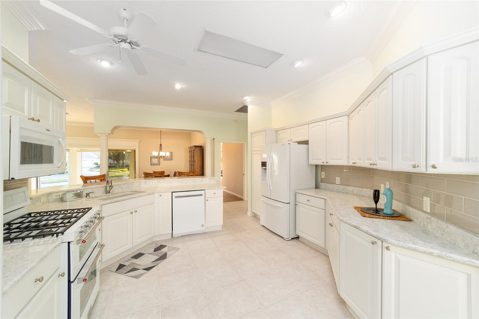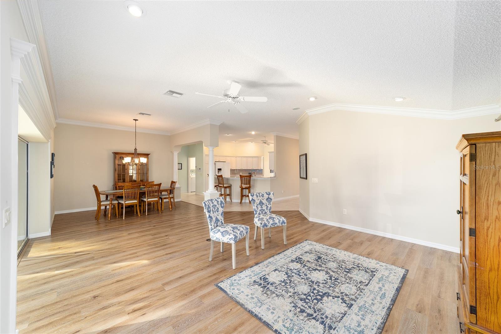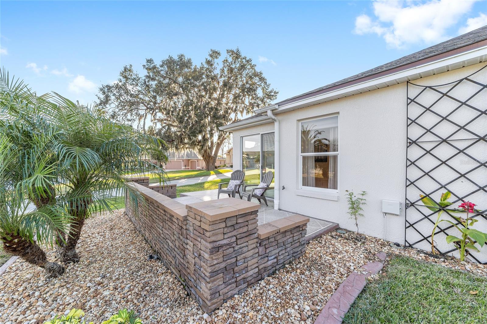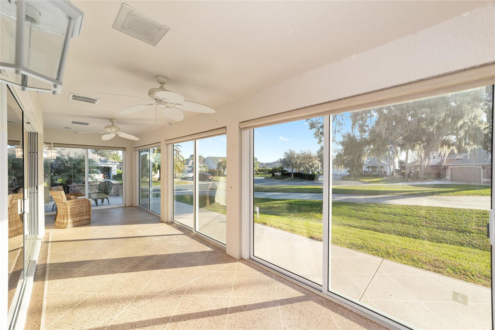|The BOND is PAID on this LOVELY EXPANDED GARDENIA, with an extra deep golf cart garage in the highly sought out village of Glenbrook. Located on an oversized, PROFESSIONALLY LANDSCAPED corner lot, this IMMACULATE home is just waiting for its new owner! The spacious, open concept interior is light and bright and offers a 2' expansion to the living room, guest bedrooms, guest bath, and the lanai! STACK-BACK glass sliders open from the living room area to the screened lanai. Crown molding throughout. Plus, remote control shades! No direct neighbors behind and does have a peek-a-boo view of Glenview golf course. A beautiful brick paver side patio makes for a great spot to relax or BBQ. The home has neutral tile throughout the kitchen, utility room and guest bath. Luxury vinyl plank in the living room and dining room as well as the master bedroom. Carpet in the 2 bedrooms. The kitchen offers fresh bright cabinetry with crown molding, QUARTZ countertops, plantation shutters, a space saver microwave, newer gas range and refrigerator, as well as pull out drawers. The master bedroom provides access to the screened lanai and to dual walk-in closets and a master bath with double sinks, a vanity area and remodeled shower. The guest area of the home features 2 expanded bedrooms, (front bedroom with bay window does not have a closet), along with an expanded guest bath with a tiled shower/tub combination. The driveway is also expanded and is wide enough to park 6 cars! Storage options include a secret James Bond style climate-controlled room in the garage as well as free standing metal lock and key storage containers. This home has an inside laundry room with Maytag washer/dryer, sink and more storage. Also, don't worry about the big-ticket items, A/C replaced in 2024 with a Trane, and ROOF was replaced in 2021. The Village of Glenbrook is ideally situated near Spanish Springs and Lake Sumter town squares. Saddlebrook Recreation Center along with 2 executive golf courses, an adult swimming pool, 4 softball diamonds, Polo Fields and Glenview Championship Golf and Country Club are just minutes away! Easy access to 466 with abundant shopping, dining, banking, medical facilities, and the new COSTCO! Call today to set up your private showing!