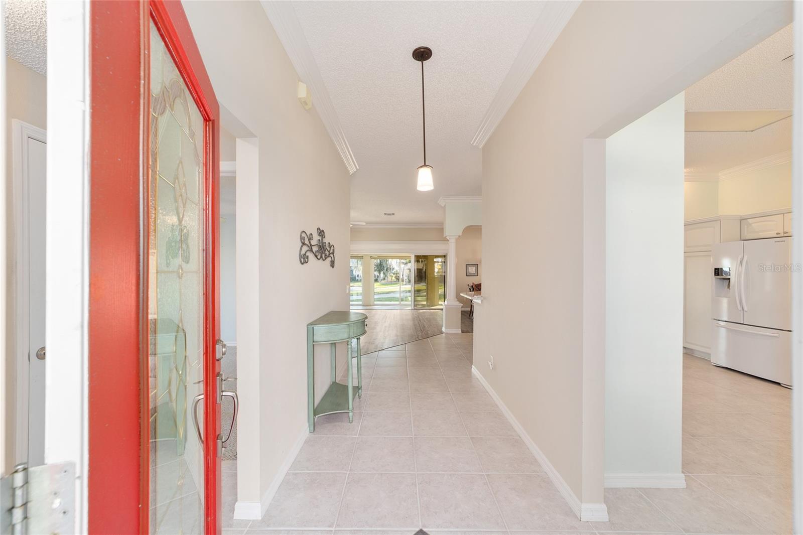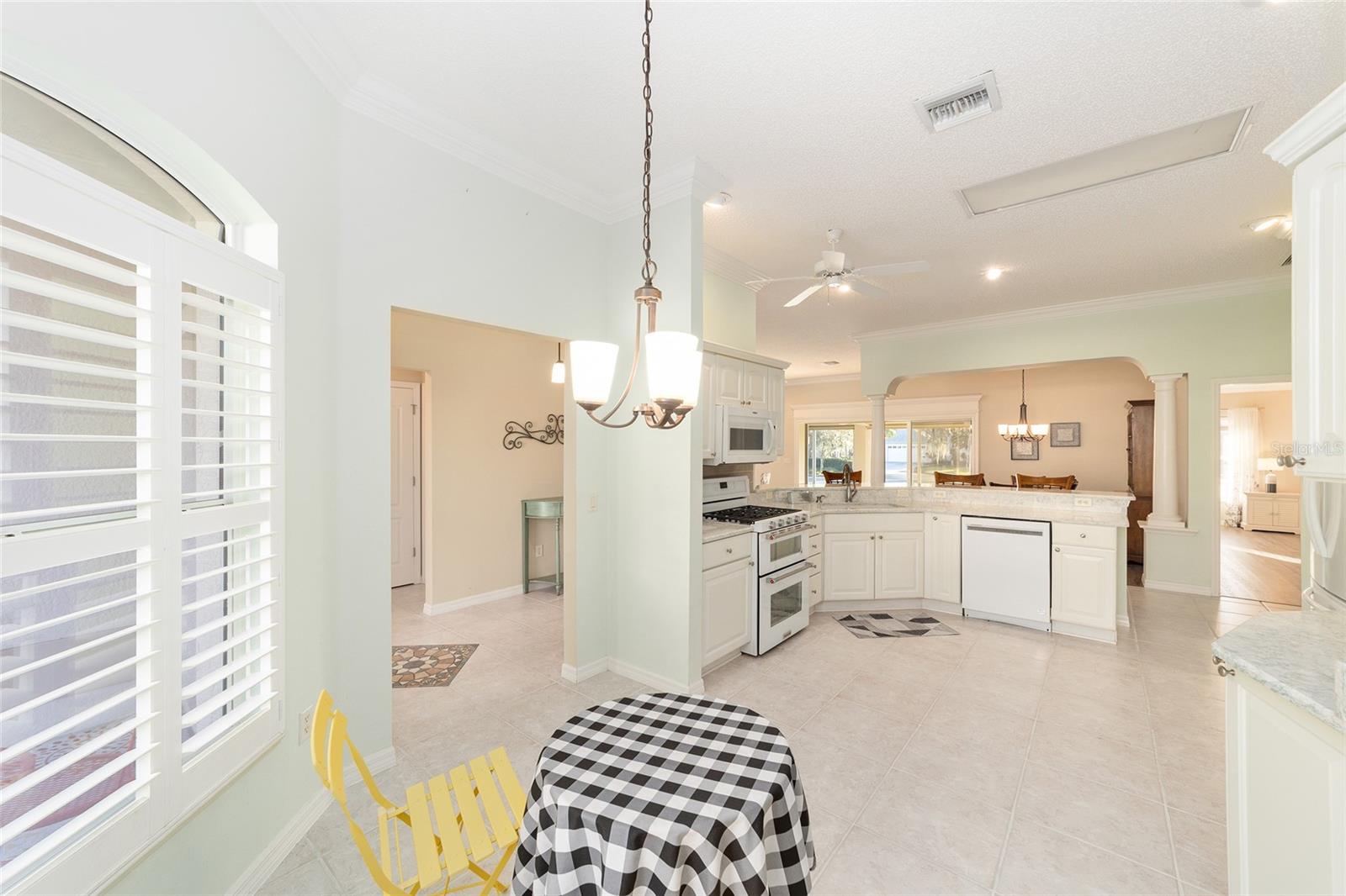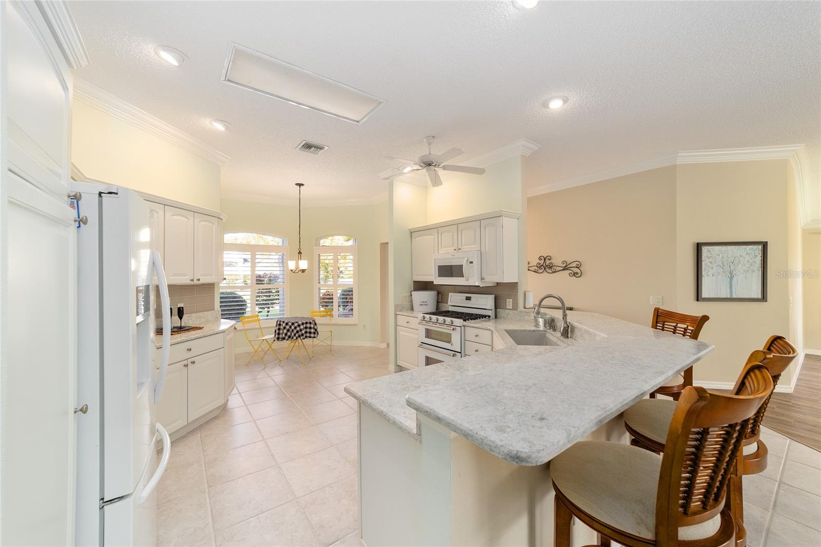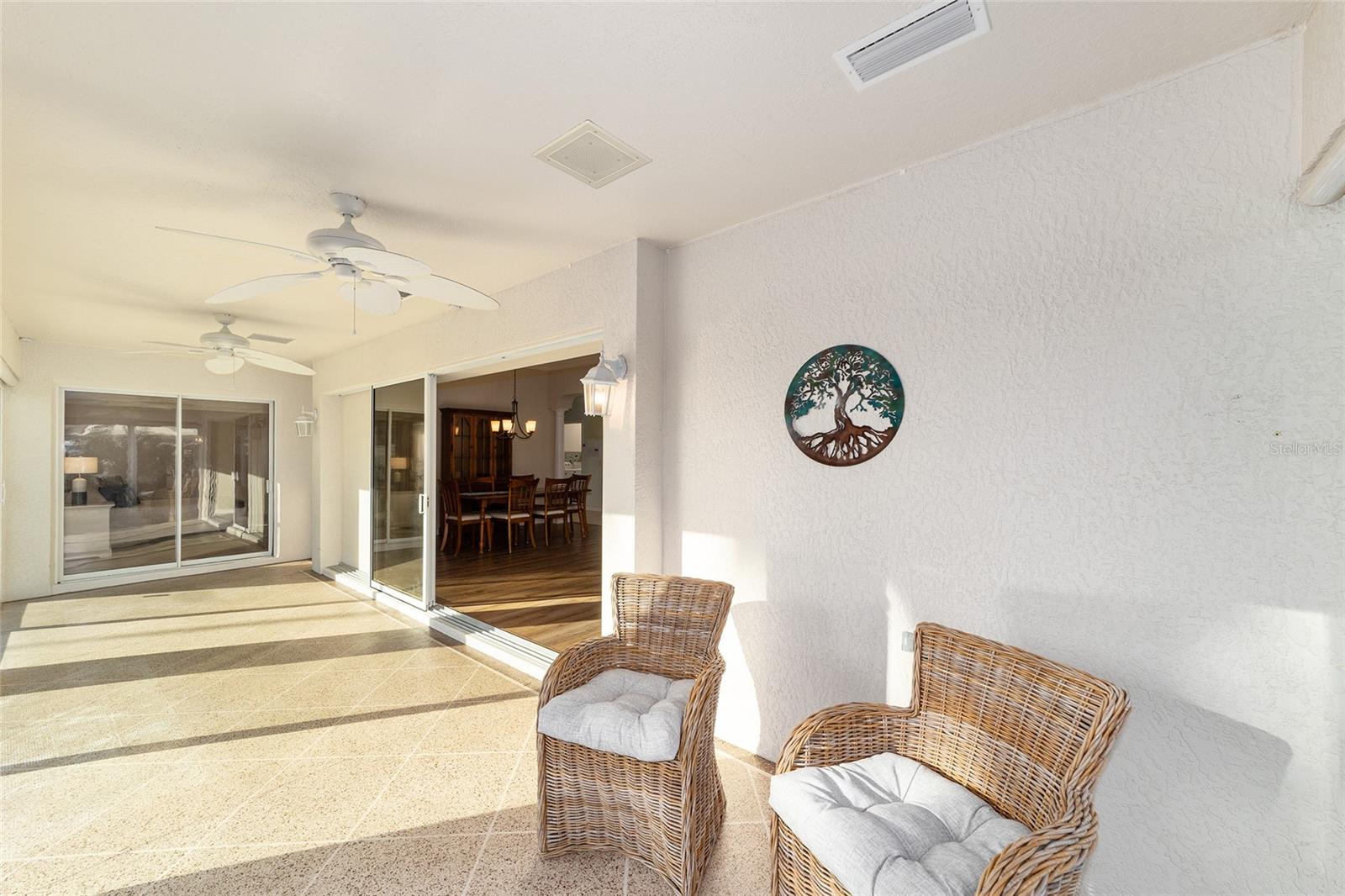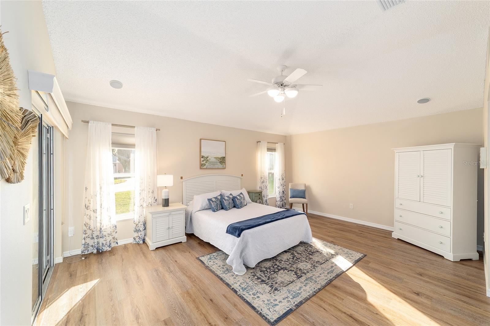 |The BOND is PAID on this LOVELY EXPANDED GARDENIA, with an extra deep golf cart garage in the highly sought out village of Glenbrook. Located on an oversized, PROFESSIONALLY LANDSCAPED corner lot, this IMMACULATE home is just waiting for its new owner! The spacious, open concept interior is light and bright and offers a 2' expansion to the living room, guest bedrooms, guest bath, and the lanai! STACK-BACK glass sliders open from the living room area to the screened lanai. Crown molding throughout. Plus, remote control shades! No direct neighbors behind and does have a peek-a-boo view of Glenview golf course. A beautiful brick paver side patio makes for a great spot to relax or BBQ. The home has neutral tile throughout the kitchen, utility room and guest bath. Luxury vinyl plank in the living room and dining room as well as the master bedroom. Carpet in the 2 bedrooms. The kitchen offers fresh bright cabinetry with crown molding, QUARTZ countertops, plantation shutters, a space saver microwave, newer gas range and refrigerator, as well as pull out drawers. The master bedroom provides access to the screened lanai and to dual walk-in closets and a master bath with double sinks, a vanity area and remodeled shower. The guest area of the home features 2 expanded bedrooms, (front bedroom with bay window does not have a closet), along with an expanded guest bath with a tiled shower/tub combination. The driveway is also expanded and is wide enough to park 6 cars! Storage options include a secret James Bond style climate-controlled room in the garage as well as free standing metal lock and key storage containers. This home has an inside laundry room with Maytag washer/dryer, sink and more storage. Also, don't worry about the big-ticket items, A/C replaced in 2024 with a Trane, and ROOF was replaced in 2021. The Village of Glenbrook is ideally situated near Spanish Springs and Lake Sumter town squares. Saddlebrook Recreation Center along with 2 executive golf courses, an adult swimming pool, 4 softball diamonds, Polo Fields and Glenview Championship Golf and Country Club are just minutes away! Easy access to 466 with abundant shopping, dining, banking, medical facilities, and the new COSTCO! Call today to set up your private showing!