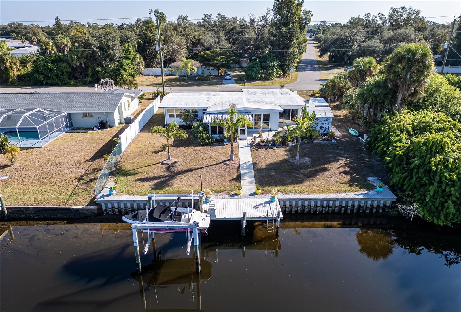 Gulf Access Waterfront Gem in Port Charlotte – No HOA, Boat & RV Ready! Live the Ultimate Florida Dream in This Beautifully Updated 3-Bedroom, 2-Bath Waterfront Home Perfectly Positioned on a Deep-Water Canal with Fast Gulf Access! Boaters Will Love the Newer 10, 000 lb Boat Lift, Newer Concrete Seawall, and Wide Canal Frontage That Makes Docking and Launching Effortless – Your Boat Can Be in the Gulf in Minutes. Step Inside to Vaulted Ceilings and an Open-Concept Layout with Plenty of Natural Light. The Heart of the Home Is the Stunning Custom Kitchen Featuring a Massive Center Island, Solid-Surface Countertops, Plenty of Cabinetry, and Stainless Appliances – Perfect for Entertaining While Enjoying Serene Water Views. The Kitchen Flows Seamlessly into the Spacious Great Room, Separate Dining Area, and Bright Florida Sunroom That Overlooks the Canal, Creating the Perfect Spot for Morning Coffee or Sunset Cocktails! The Split-Bedroom Floor Plan Offers Privacy, with a Generous Primary Suite That Includes Dual Closets and an En-Suite Bath. Two Additional Guest Bedrooms Are Well-Sized and Share a Beautifully Appointed Second Bath. Outside, Enjoy a Fully Fenced Yard, a Separate Concrete Driveway with Full RV Hookups! Plenty of Sapce for Boat or RV Parking, Plus a Large Storage Shed for All Your Gear. True Gulf Access, Newer Lift and Seawall, RV-Ready Accommodations, No HOA Fees or Restrictions, and Peaceful Canal-Front Living – Bring Your Boat, Your RV, and Your Flip-Flops – Your Waterfront Lifestyle Starts Here! Schedule Your Private Showing Today Before It’s Gone!