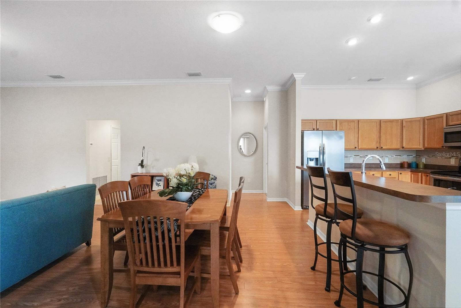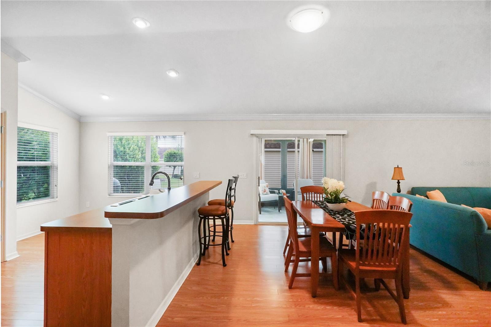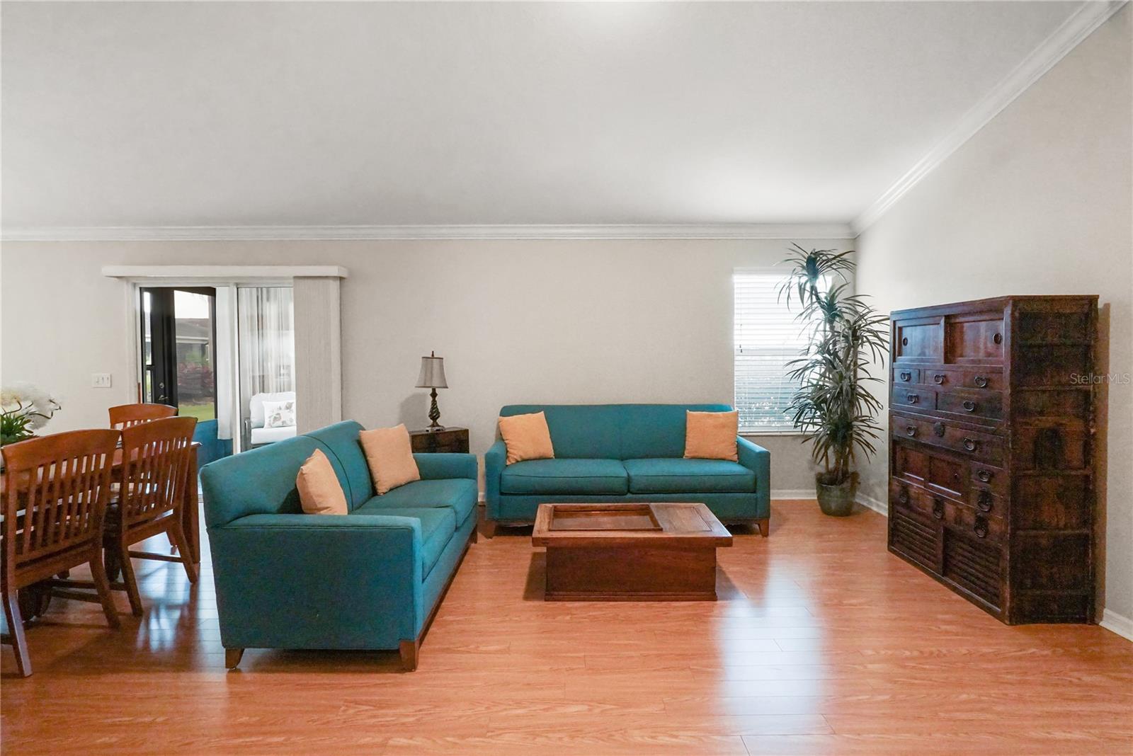 Welcome to this popular At Ease floor plan in The Village of Charlotte featuring 3 bedrooms, 2 bathrooms, and a 2-car garage. Designed with an open layout and volume ceilings, this home offers a bright and spacious feel throughout. The main living areas—including the living room, dining room, and kitchen—feature beautiful wood laminate flooring for easy care and style. Enjoy the comfort of an enclosed and tiled lanai, which faces the side of the home for complete privacy—perfect for relaxing with your morning coffee or entertaining guests. Thoughtful upgrades include crown molding, double-pane Low E windows, a front storm door, and gutters, adding both function and value. The HVAC was replaced in 2025. Located in a highly desirable area, this home is just minutes from Colony Shopping Plaza, Neighborhood Wal-Mart, and Brownwood Paddock Square, offering convenient access to shopping, dining, and entertainment. Don’t miss your chance to make this beautifully maintained At Ease model your next home in The Villages!