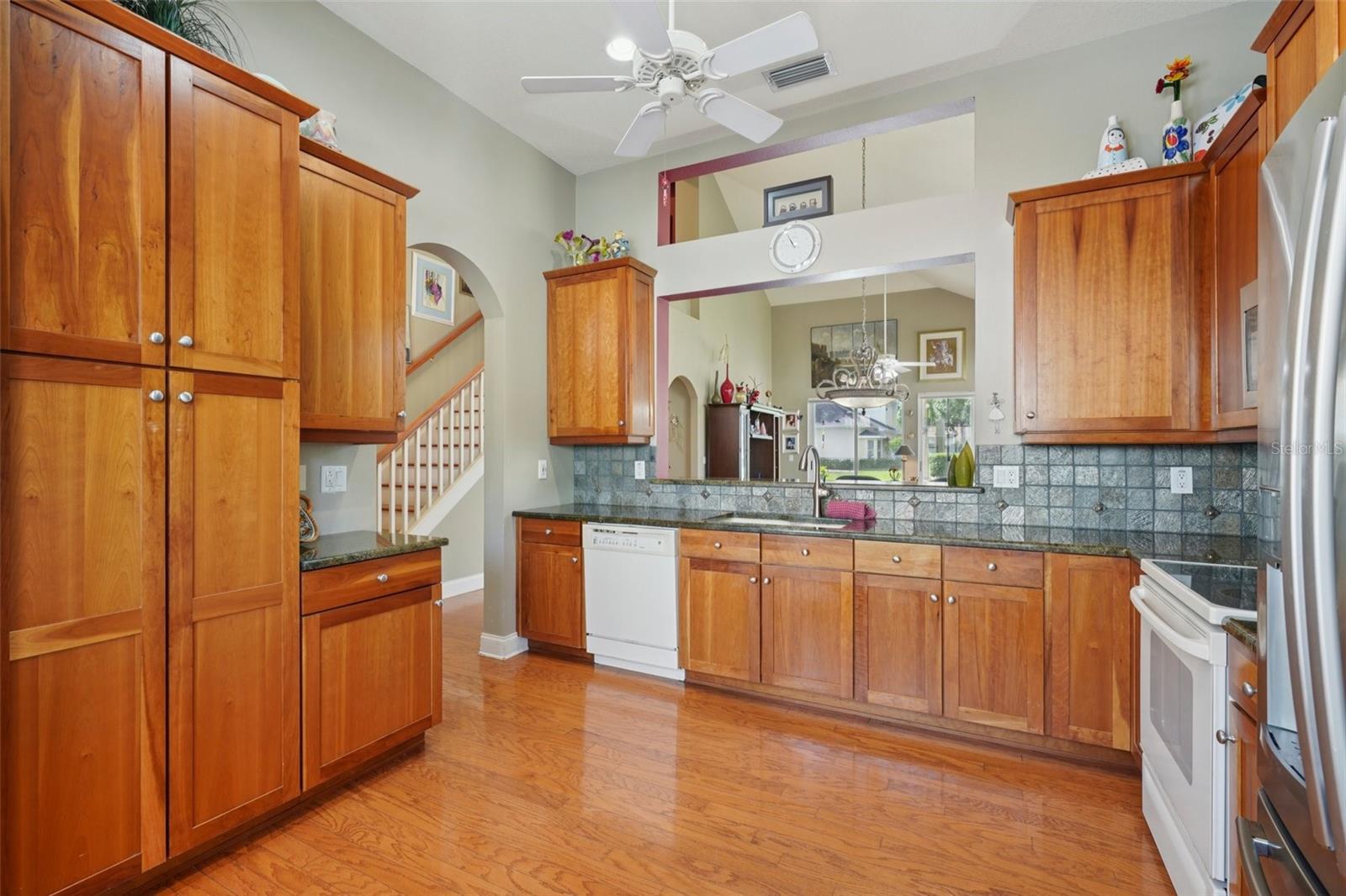 Built-in Features, High Ceilings, Living Room/Dining Room Combo, Open Floorplan, Primary Bedroom Main Floor, Solid Wood Cabinets, Stone Counters, Thermostat, Walk-In Closet(s), Window Treatments