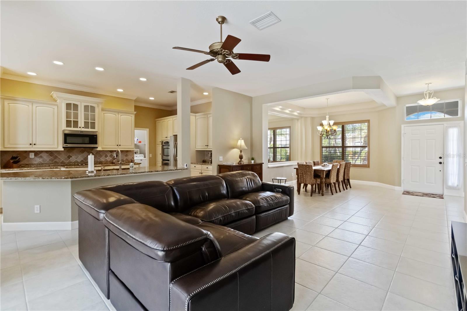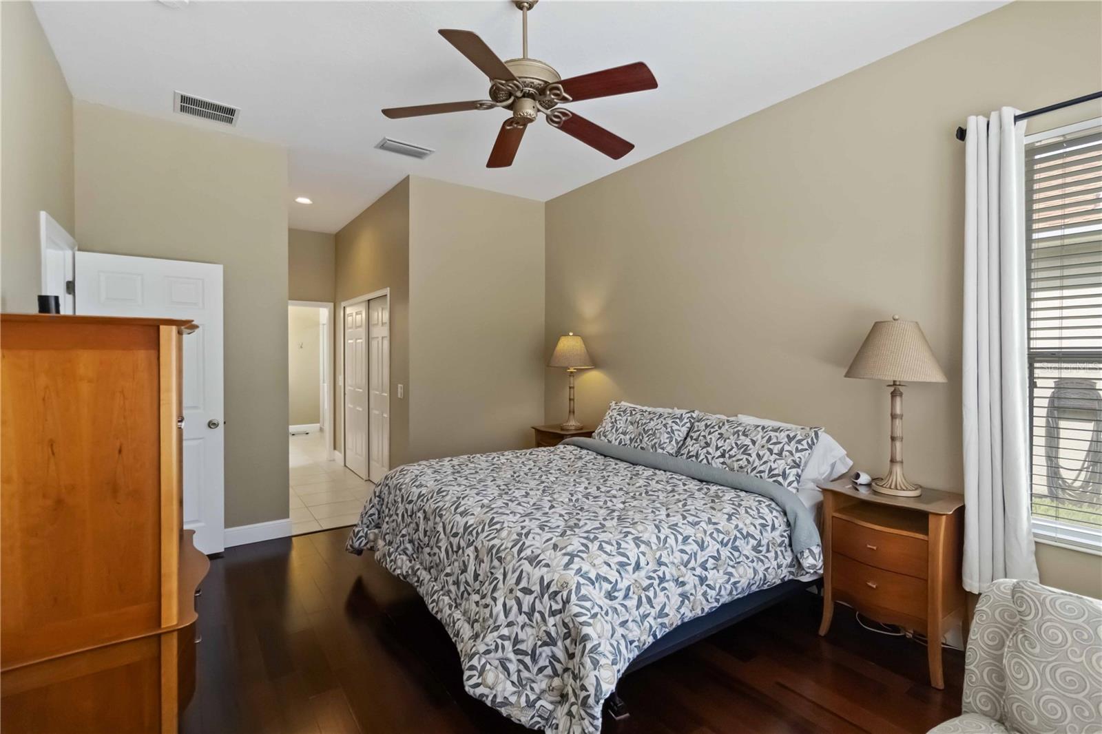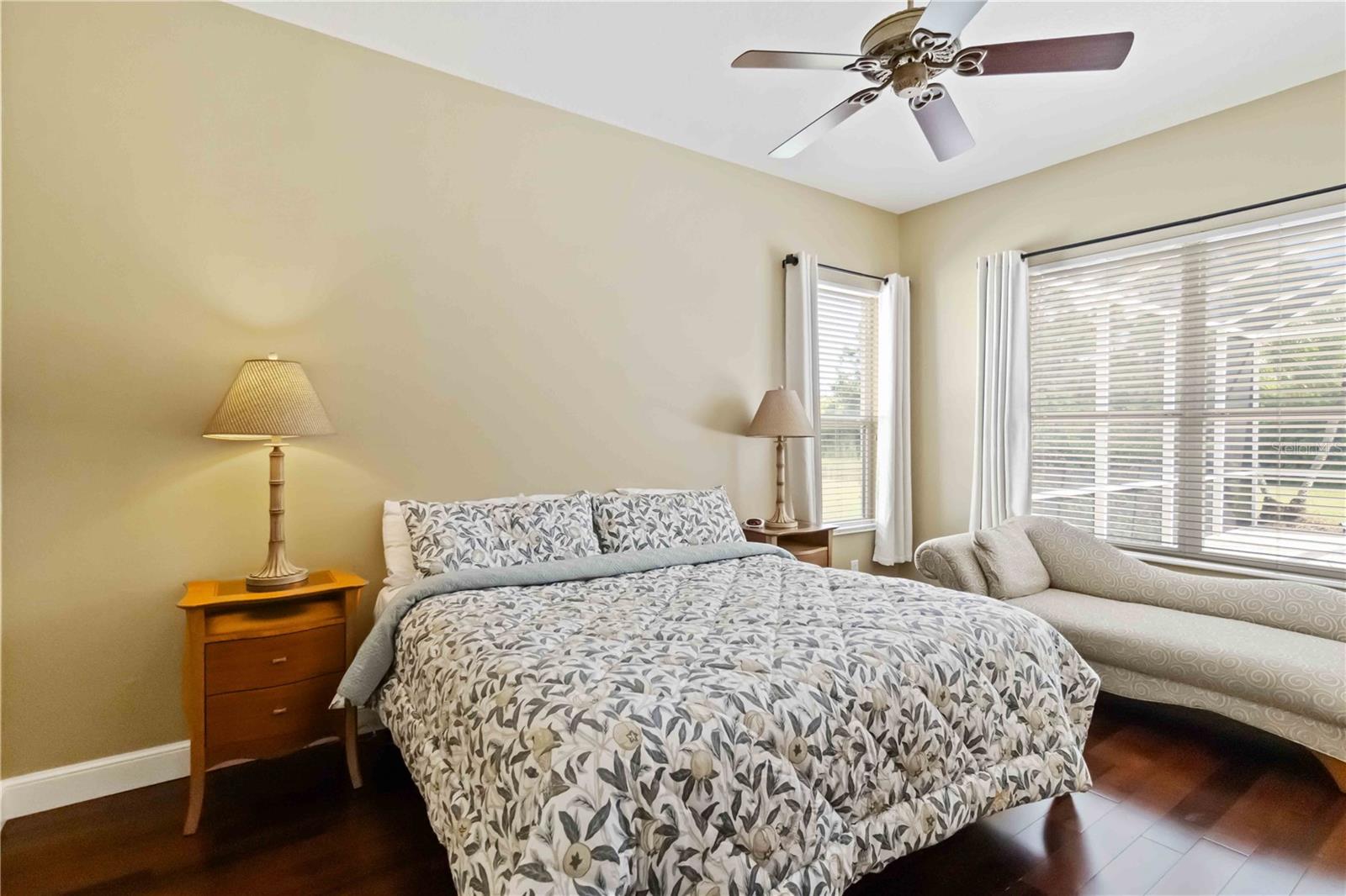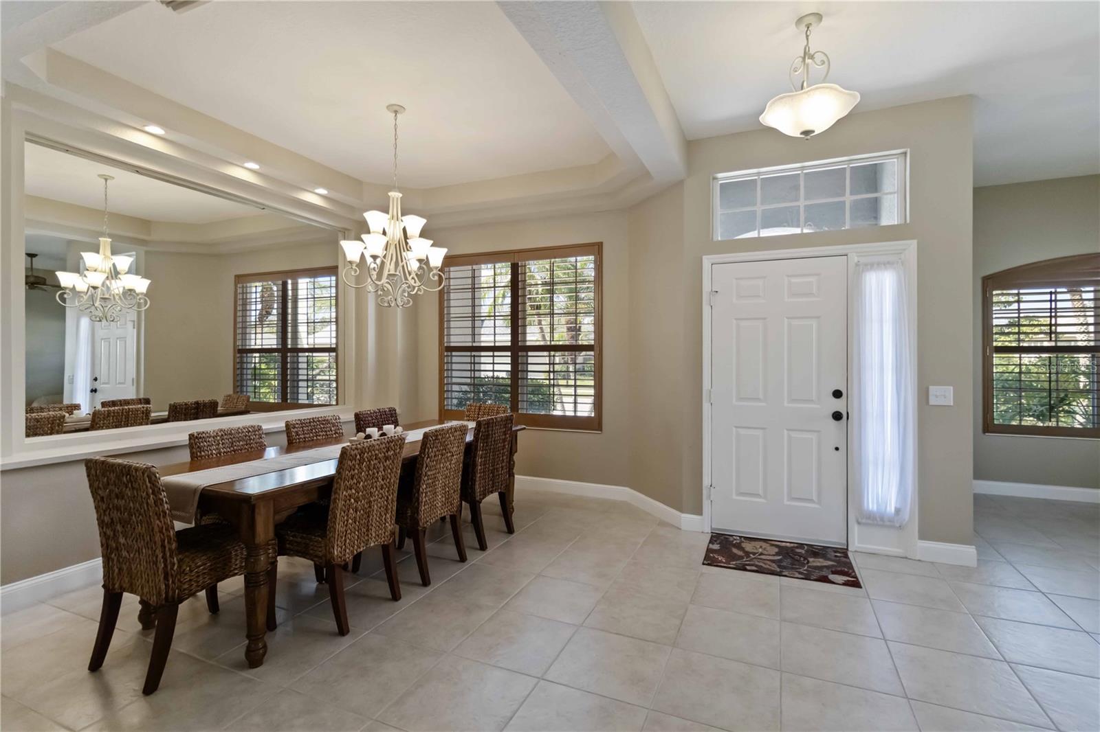 Nestled within a secure, gated community, this beautifully updated, 3-bedroom, 2-bathroom residence offers the perfect blend of luxury and tranquility. Enjoy the assurance of a brand-new roof, complete with a 20-year warranty, as well as a 7-year warranty on the exterior painting completed 10/10/2025. Interior wood shutters adorn the front windows, adding a touch of classic curb appeal. The moment you enter, you'll be greeted by an open and airy living space, with stylish tile flooring throughout the main areas that flows seamlessly into the elegant, formal dining area. Just off the dining room, a large sitting area provides an ideal spot for relaxation , entertaining or a home office. The heart of the home is the chef-inspired kitchen, boasting upgraded cabinetry, gleaming granite countertops, and a double oven. All appliances are included even the fridge in the garage , making this home a truly turn-key. Bedrooms are finished with warm hardwood flooring, while seven ceiling fans throughout the home provide comfort and air circulation. Custom window treatments and curtains add a touch of sophistication. Step outside to your private maintenance free yard where a stunning oversized paver lanai and a refreshing pool create a true outdoor oasis for endless entertainment and relaxation. Most furnishings are also available for purchase, offering a seamless transition into your new home.