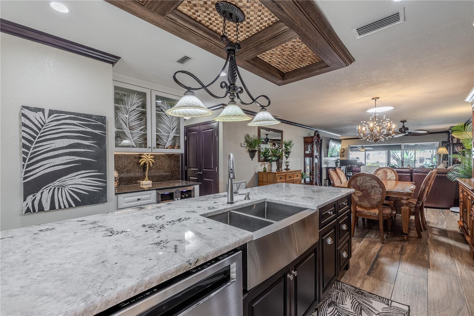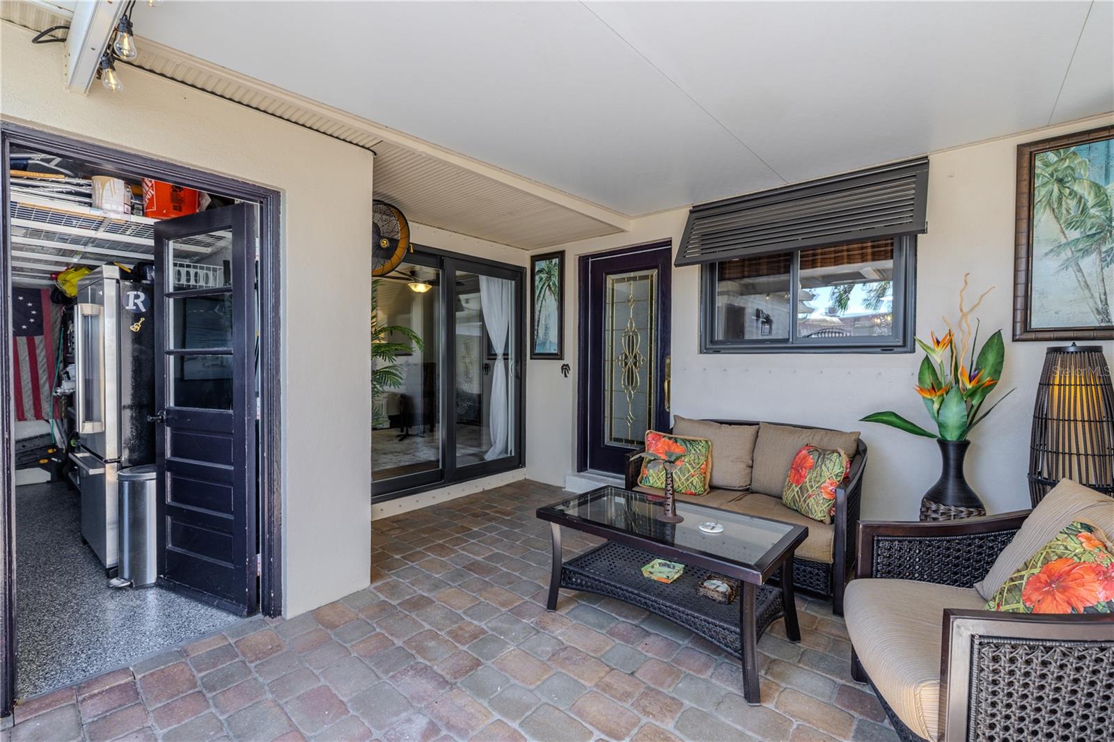 STUNNING WATERFRONT VILLA! Welcome to this beautifully upgraded villa that embodies the ease and charm of coastal Florida living. Designed with care and attention to detail, it provides a perfect balance of comfort, elegance, and function. A private brick-paver courtyard surrounded by tropical landscaping welcomes you home. The space feels peaceful and inviting, with room for a grill or café table and a wall-mounted fan to keep the air cool while you relax outdoors. The decorative glass front door opens to a bright, open-concept interior filled with natural light and a warm coastal feel. Ceramic tile floors flow throughout, creating a polished and cohesive look. Crown molding adds subtle character, and recessed lighting gives each room a soft, even glow. A kitchen window overlooks the courtyard, connecting the indoor and outdoor spaces beautifully. The kitchen blends timeless design with modern convenience. A large granite island provides seating, storage, apron sink with garbage disposal (2020), touch faucet (2025) and built-in outlets. Custom cabinetry and under-cabinet lighting highlight the craftsmanship. The Dacor refrigerator (2020), Sharp under-counter microwave (2025), double built-in oven (2025), dishwasher (2025), and induction range (2021) create a kitchen ready for both everyday living and entertaining. The sleek range hood, pot filler, and dual-zone wine and beverage refrigerator add thoughtful touches, while the built-in TV nook keeps the space relaxed and functional. The dining area flows naturally into the living room, where wide sliding glass doors open to the canal and fill the space with light. The open layout feels spacious yet cozy, ideal for gatherings or quiet evenings at home. The primary suite is a calm retreat with two closets, including one with custom built-ins. The ensuite bathroom feels like a spa with split vanities, stone counters, lighted mirrors, and custom water faucets that complete the designer look. The rainfall shower and jetted soaking tub create the perfect place to unwind, while the built-in linen storage and private water closet add convenience. The second bedroom is versatile, featuring both a walk-in and standard closet. Sliding glass doors installed in 2020 open to the front courtyard, and the retractable screen allows fresh air in during cooler months. The nearby bathroom continues the home’s cohesive style with a frameless shower, stone vanity with copper sink, and built-in storage. At the back of the home, the bonus room overlooks the canal and provides a comfortable space to read, relax, or entertain. Built-in shelving, a fireplace, a TV area, and a storage closet add flexibility. Through the glass doors, the composite deck completed in 2022 extends the living area outdoors, creating a peaceful place to enjoy canal views and breezes from sunrise to sunset. The private dock includes a 16, 000-pound oversized boat lift for up to a 36-foot vessel, 50-amp shore power, remote color-changing railing lights, and a lighted pedestal that casts a soft glow across the water at night. Additional updates include a new roof (2025), leased water softener (2020), and water heater (2020). Located in the gated 55+ community of Boca Ciega Point, residents enjoy a friendly, active lifestyle with access to a clubhouse, shuffleboard, pool, tennis courts, and 24-hour security. Just minutes from the beaches, this home reflects the comfort, quality, and serenity that define the best of Florida living.
