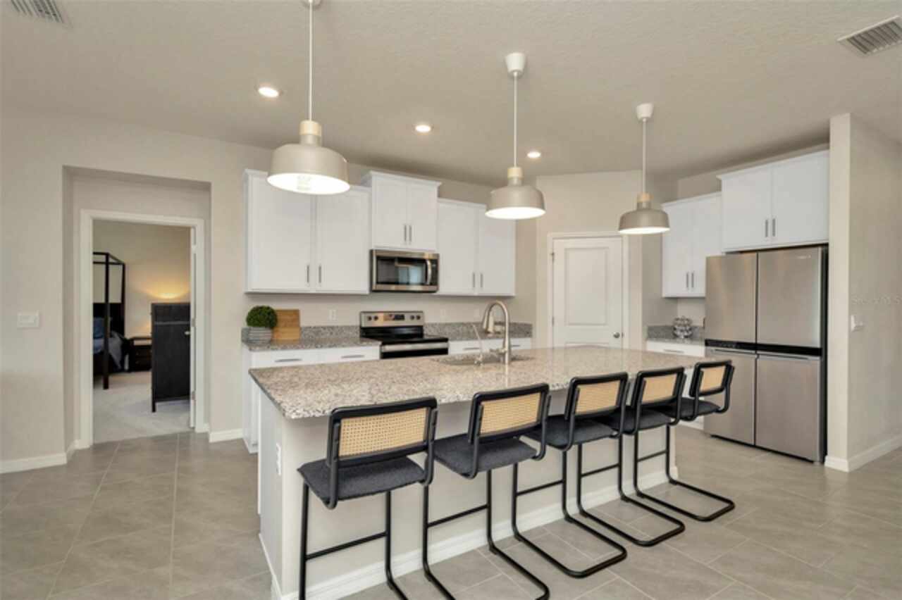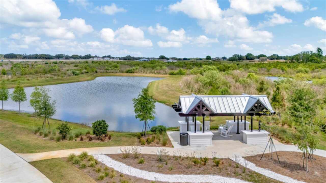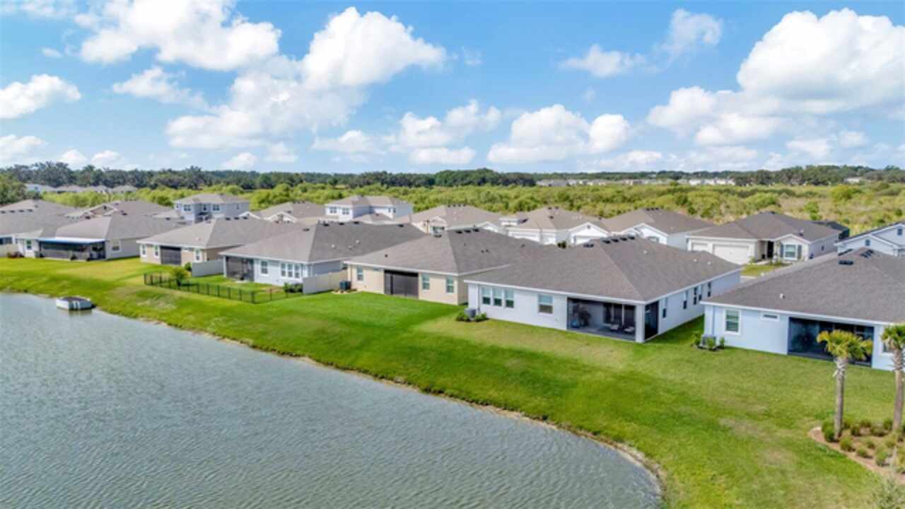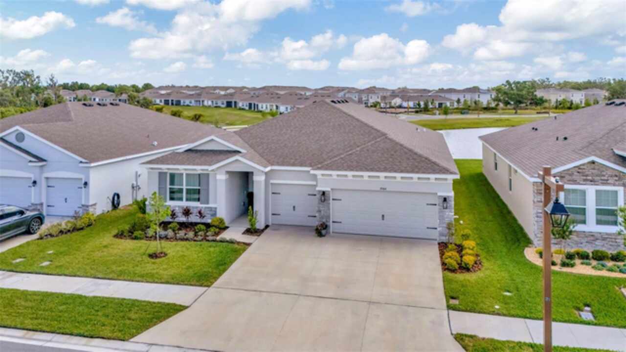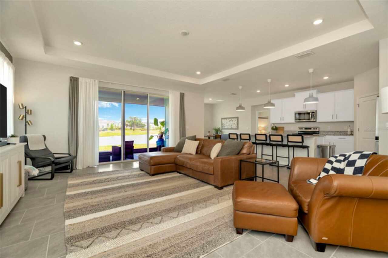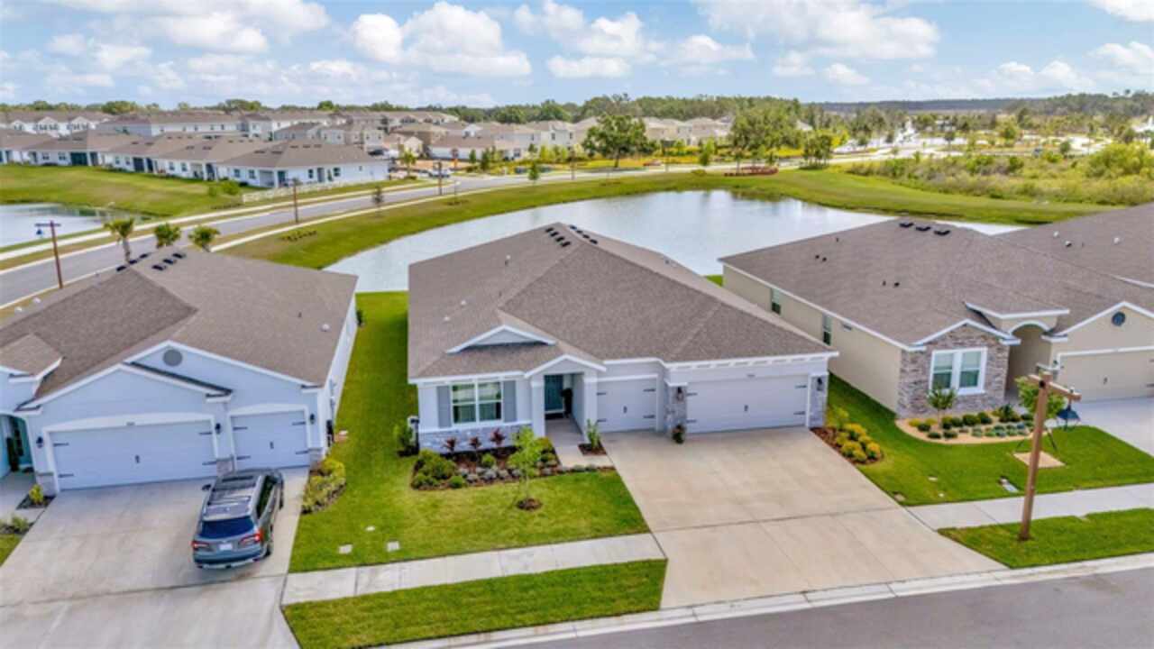 SELLER OFFERING UP TO $10K IN CONCESSIONS WITH APPROVED OFFER!! NEW EXTERIOR PAINTING JUST COMPLETED!! Do you really want a "NAKED" New Build OR would you prefer a beautifully maintained turn-key home that has been DRESSED with custom blinds, window treatments, cabinet handles, interior eggshell paint, pendant lighting and so much more! This home is NOT in a flood zone. This immaculate and spacious one-level Camden floor plan with in-law suite on a premium water view lot offers nearly 2, 800 sq feet of modern multi-generational or single family living. Featuring 4 bedrooms, 3.5 bathrooms and a 3-car garage. This home boasts an immense amount of natural light in the main living areas with tall ceilings and an open floor plan. The primary bedroom features tray ceilings, an ensuite bath with a soaking tub, separate shower, dual sinks, toilet closet, and a spacious walk-in closet. More updates you won't find from the builder include a Solar powered Water Softener, Diamond Profile Concrete garage floor, most main areas and two bathrooms re-painted with neutral SW eggshell paint, pendant lighting over kitchen island, window treatments throughout, and screened lanai. You won't get these upgrades in a new build which will save you money at move-in. Bedrooms 2 & 3 are near the front of the home and share a private Jack N Jill bathroom. Home features a 3-way split bedroom floor plan. Large fourth bedroom is part of the next-gen area and features custom walk-in closet, ensuite bathroom with walk-in shower, a separate living area, kitchenette with upper and lower soft-close cabinets, quartz countertops, full size sink, and full size refrigerator. Perfect for an in-law suite! Multi-slide sliding doors in the great room open up to a covered & screened lanai with upgraded no-see-um 20/20 screening and picture view of the water...Perfect for watching beautiful sunrises over the water!! The main kitchen boasts a large island, walk-in pantry, new faucet, and newer appliances. The irrigation system for lawn and landscaping is set up through the economical reclaimed water system. Home is located just down the street from the Amenity Center featuring a lap pool & a resort style pool with water slide, 24-hour fitness center, playground, basketball court, and dog park!! Pickleball courts coming soon in next phase. Located in a quiet and serene neighborhood with walking trails, this home is part of an active community along with great access to I-4, making it an easy commute to Tampa, Orlando, and Lakeland. Transferable structural home warranty.