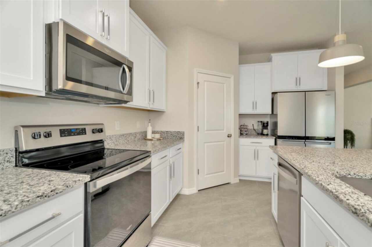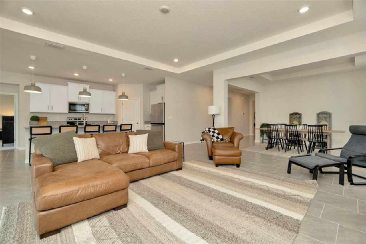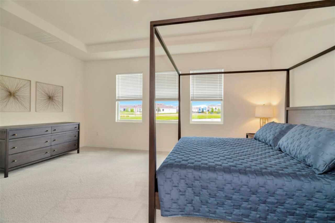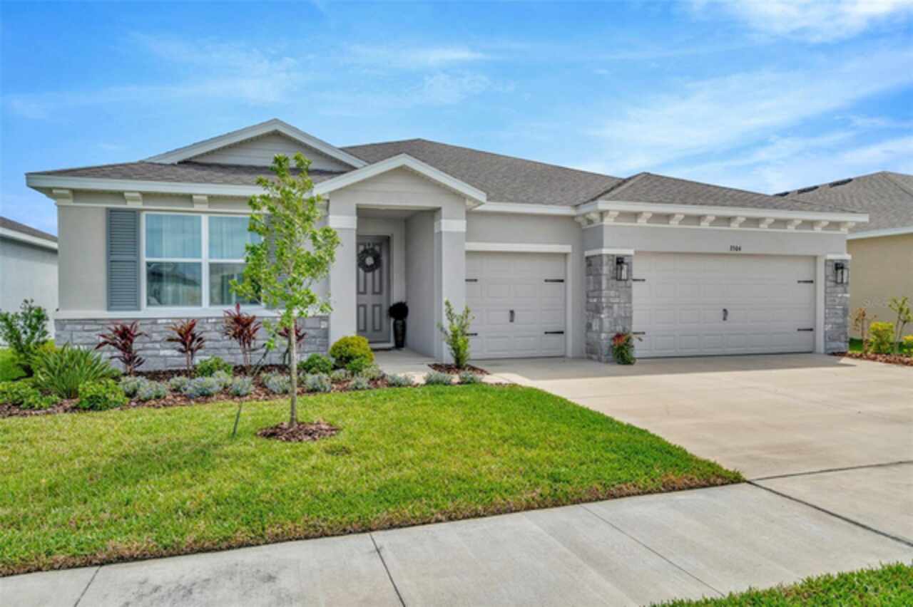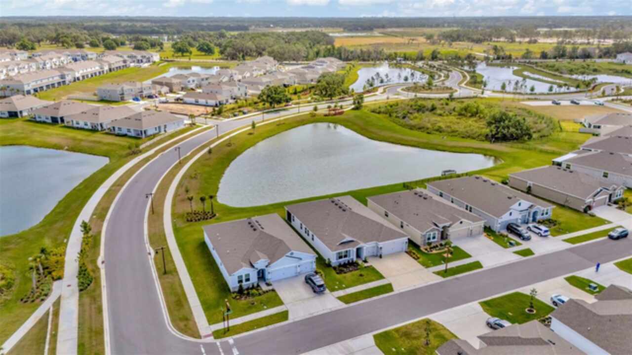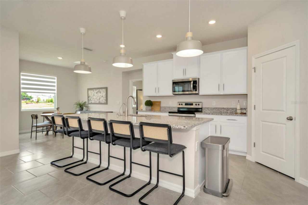 SELLER OFFERING UP TO $10K IN CONCESSIONS WITH APPROVED OFFER!! NEW EXTERIOR PAINTING JUST COMPLETED!! Do you really want a "NAKED" New Build OR would you prefer a beautifully maintained turn-key home that has been DRESSED with custom blinds, window treatments, cabinet handles, interior eggshell paint, pendant lighting and so much more! This home is NOT in a flood zone. This immaculate and spacious one-level Camden floor plan with in-law suite on a premium water view lot offers nearly 2, 800 sq feet of modern multi-generational or single family living. Featuring 4 bedrooms, 3.5 bathrooms and a 3-car garage. This home boasts an immense amount of natural light in the main living areas with tall ceilings and an open floor plan. The primary bedroom features tray ceilings, an ensuite bath with a soaking tub, separate shower, dual sinks, toilet closet, and a spacious walk-in closet. More updates you won't find from the builder include a Solar powered Water Softener, Diamond Profile Concrete garage floor, most main areas and two bathrooms re-painted with neutral SW eggshell paint, pendant lighting over kitchen island, window treatments throughout, and screened lanai. You won't get these upgrades in a new build which will save you money at move-in. Bedrooms 2 & 3 are near the front of the home and share a private Jack N Jill bathroom. Home features a 3-way split bedroom floor plan. Large fourth bedroom is part of the next-gen area and features custom walk-in closet, ensuite bathroom with walk-in shower, a separate living area, kitchenette with upper and lower soft-close cabinets, quartz countertops, full size sink, and full size refrigerator. Perfect for an in-law suite! Multi-slide sliding doors in the great room open up to a covered & screened lanai with upgraded no-see-um 20/20 screening and picture view of the water...Perfect for watching beautiful sunrises over the water!! The main kitchen boasts a large island, walk-in pantry, new faucet, and newer appliances. The irrigation system for lawn and landscaping is set up through the economical reclaimed water system. Home is located just down the street from the Amenity Center featuring a lap pool & a resort style pool with water slide, 24-hour fitness center, playground, basketball court, and dog park!! Pickleball courts coming soon in next phase. Located in a quiet and serene neighborhood with walking trails, this home is part of an active community along with great access to I-4, making it an easy commute to Tampa, Orlando, and Lakeland. Transferable structural home warranty.