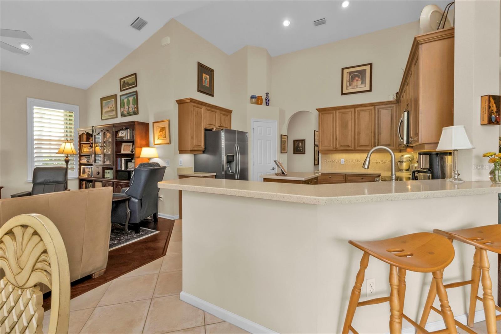 Cathedral Ceiling(s), Ceiling Fans(s), Eat-in Kitchen, High Ceilings, Kitchen/Family Room Combo, Open Floorplan, Solid Surface Counters, Solid Wood Cabinets, Split Bedroom, Vaulted Ceiling(s), Walk-In Closet(s), Window Treatments