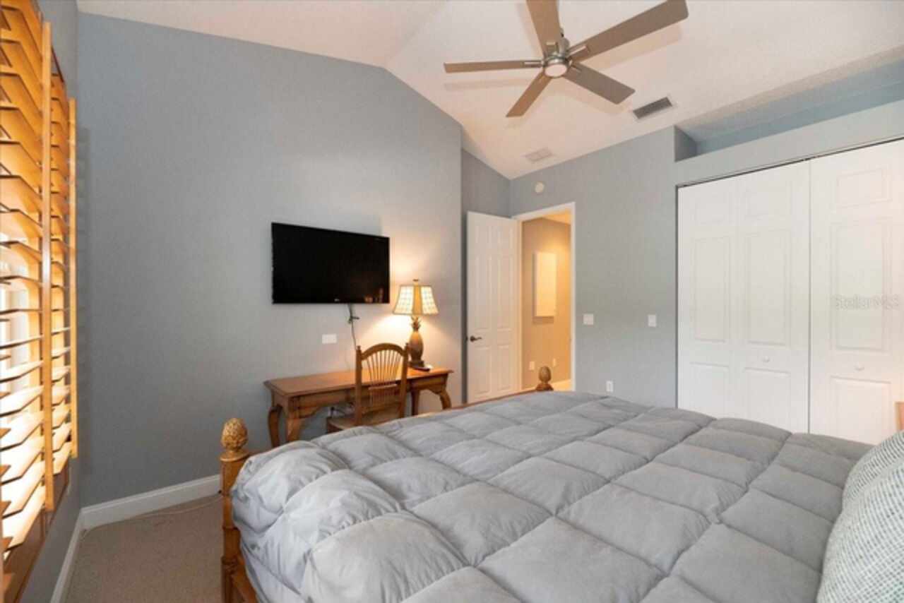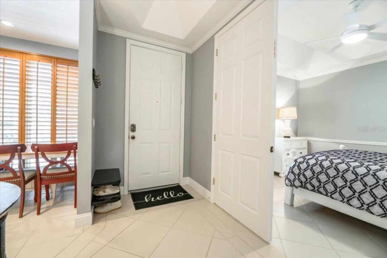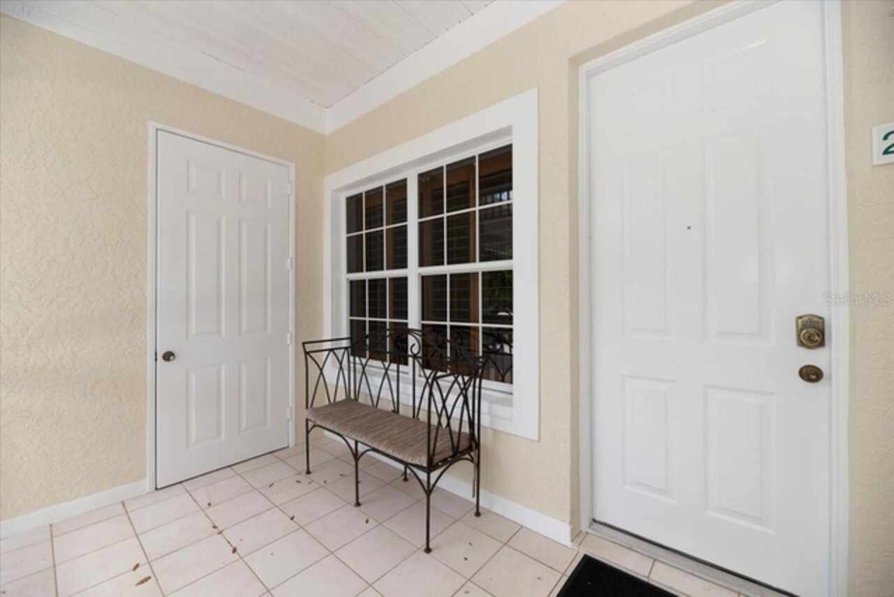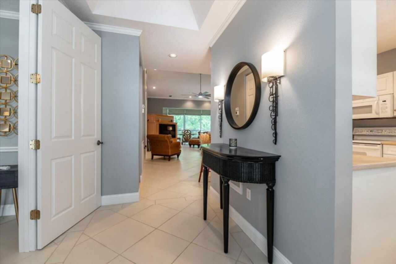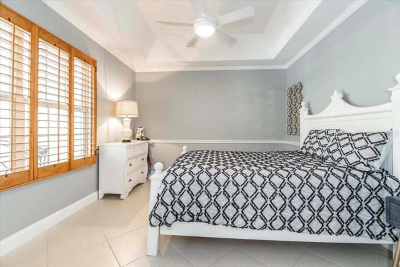Motivated Seller! This beautifully maintained and thoughtfully updated villa, located within the secure gates of Bollettieri Villas at IMG Academy, presents an exceptional opportunity for those seeking both convenience and functionality. With three spacious bedrooms, three full bathrooms, and an additional bonus room ideally suited for a 4th bedroom, home office, study, or gym, this residence offers over 2, 000 square feet of refined living. The villa is partially furnished and designed for comfort, with cathedral ceilings throughout most rooms, plantation shutters, and remote-controlled Roman shades that blend style with convenience. The living area opens to tranquil views of the surrounding preserve, offering a serene backdrop of privacy and natural beauty. A new canvas awning with a metal frame is scheduled for installation at the end of June, providing the rare luxury of three covered parking spaces—a feature seldom found in the community. Interior upgrades include an HVAC system (2015) with humidistat and ultraviolet purification to support air quality, a custom-built entertainment center with integrated storage and surround sound, and a fully renovated primary bath featuring a jetted Kohler tub, Silestone wall accent, and a walk in shower with glass enclosure. Crown molding, soffit lighting, diagonal 18”x18” tile flooring, and Silestone surfaces throughout the kitchen and baths all contribute to the home's understated sophistication. Recent updates in 2023 include fresh interior paint, updated ceiling fans, and new light fixtures. The gated front balcony provides a safe, private outdoor retreat—perfect for morning coffee or an afternoon with your canine companion. Residents enjoy access to a heated community pool, spa, and fitness room, as well as the convenience of a golf cart shuttle and walkable proximity to the IMG campus. The neighborhood also allows for flexible leasing options, with a one-month minimum rental policy. Just a 10-minute drive to grocery stores and local shopping, and under 30 minutes to the beaches, downtown Sarasota, SRQ Airport, and UTC Mall, this villa offers an ideal blend of comfort, convenience, and quiet sophistication. An especially appealing residence for young athletes and families seeking space, safety, and a strong sense of community.