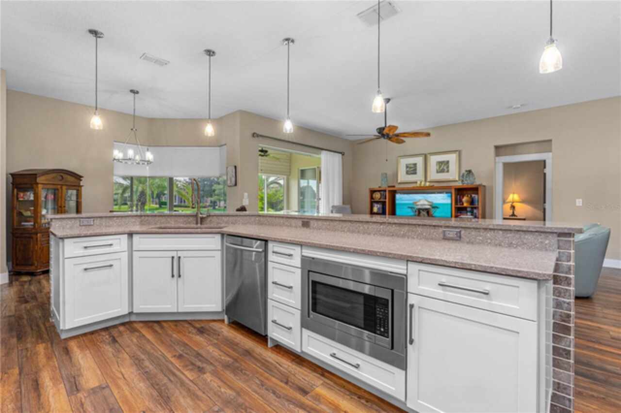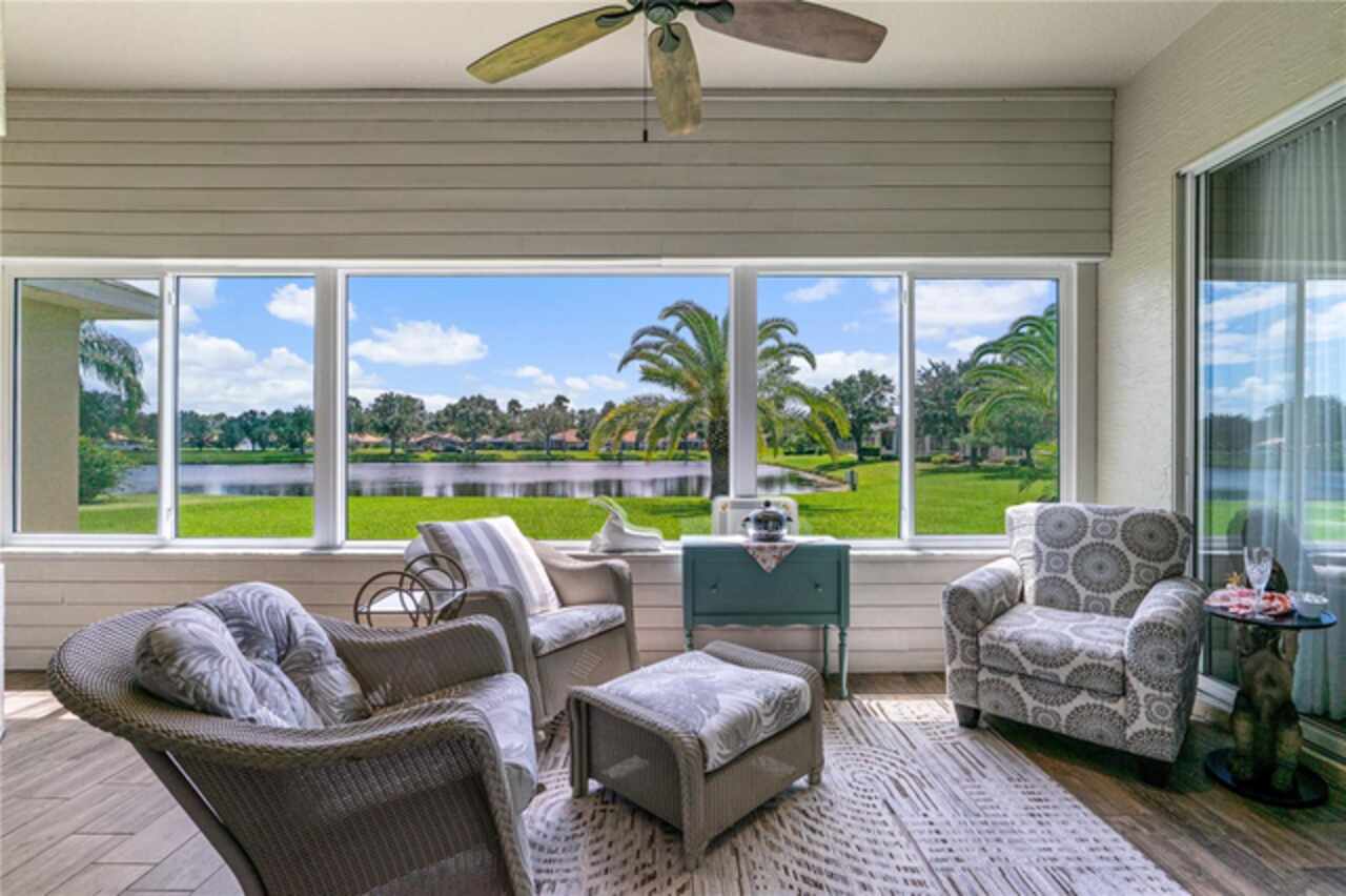 Indulge in the epitome of luxury living with this pristine waterfront residence nestled in the coveted Marisol enclave of the Venetian Bay community. Revel in the exclusivity of a serene cul-de-sac setting. As you approach the home, you are greeted by its stunning curb appeal, highlighted by a side entry two-car garage and charming plantation shutters. Upon entry, the meticulously updated interior captivates with custom drapes, modern fixtures, ceiling fans, and recessed lights that illuminate each space with a warm and inviting glow. Culinary experiences await in the gourmet kitchen, boasting rich wood cabinets with convenient pull-outs, chic tile backsplash, and gleaming stainless steel range hood and appliances. The stone counters and pendant-lit seating area set the stage for intimate meals or entertaining guests, while the infinity window adorned with Hunter Douglas shades offers a panoramic view of the tranquil water beyond. The primary suite is a sanctuary of luxury, complete with a sitting room and sliders opening to a impact glass-enclosed sunroom (updated in 2022), where the beauty of waterfront living can be savored watching different birds, ducks and beautiful sunsets. A stylish wood sliding door reveals an en-suite bathroom, featuring a jetted tub, separate shower, dual sink vanity, and a walk-in closet. Guest accommodations are equally impressive, with a remodeled bathroom showcasing a sleek tile wall, shower, brushed nickel fixtures, and sophisticated lighting. Practicality is not forgotten, with an inside laundry complete with a utility sink. This exceptional property is more than a home; it's a lifestyle. Venetian Bay offers amenities such as dining, a fitness center, a spa, and a golf course. Located conveniently close to beaches, shopping, entertainment, medical facilities, and the Daytona International Speedway, this is the ultimate luxury retreat for the discerning buyer. Most furnishings negotiable. All information is intended to be accurate but cannot be guaranteed.
