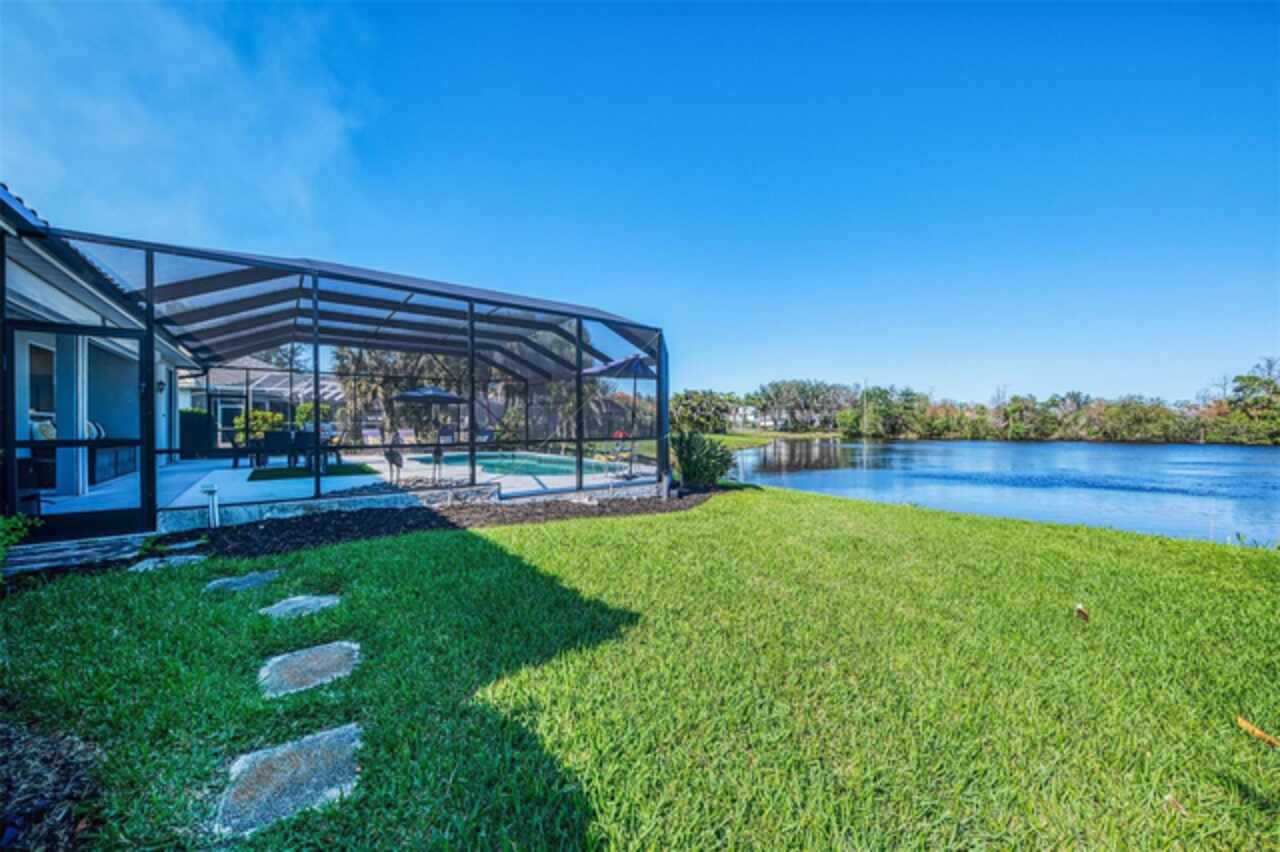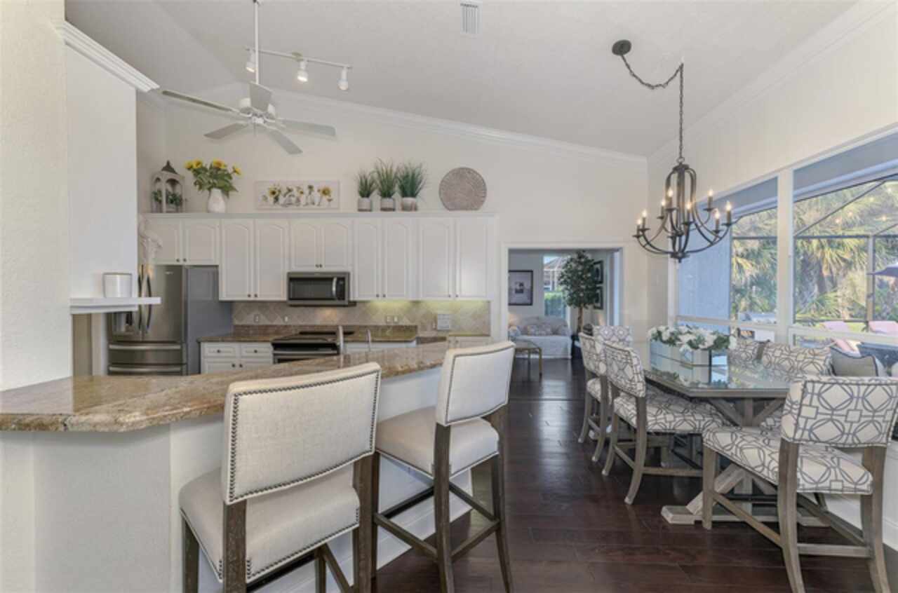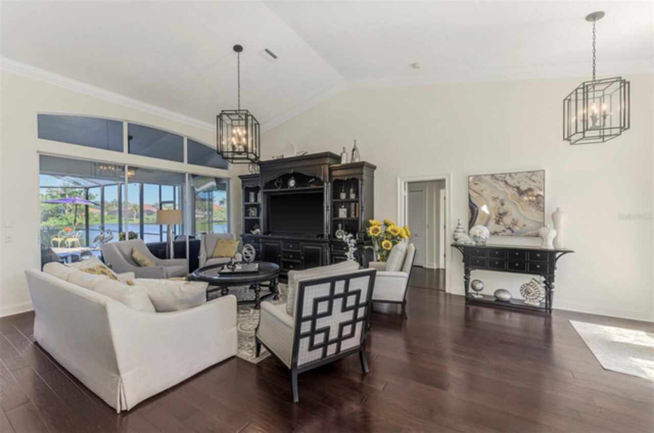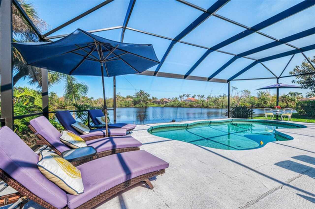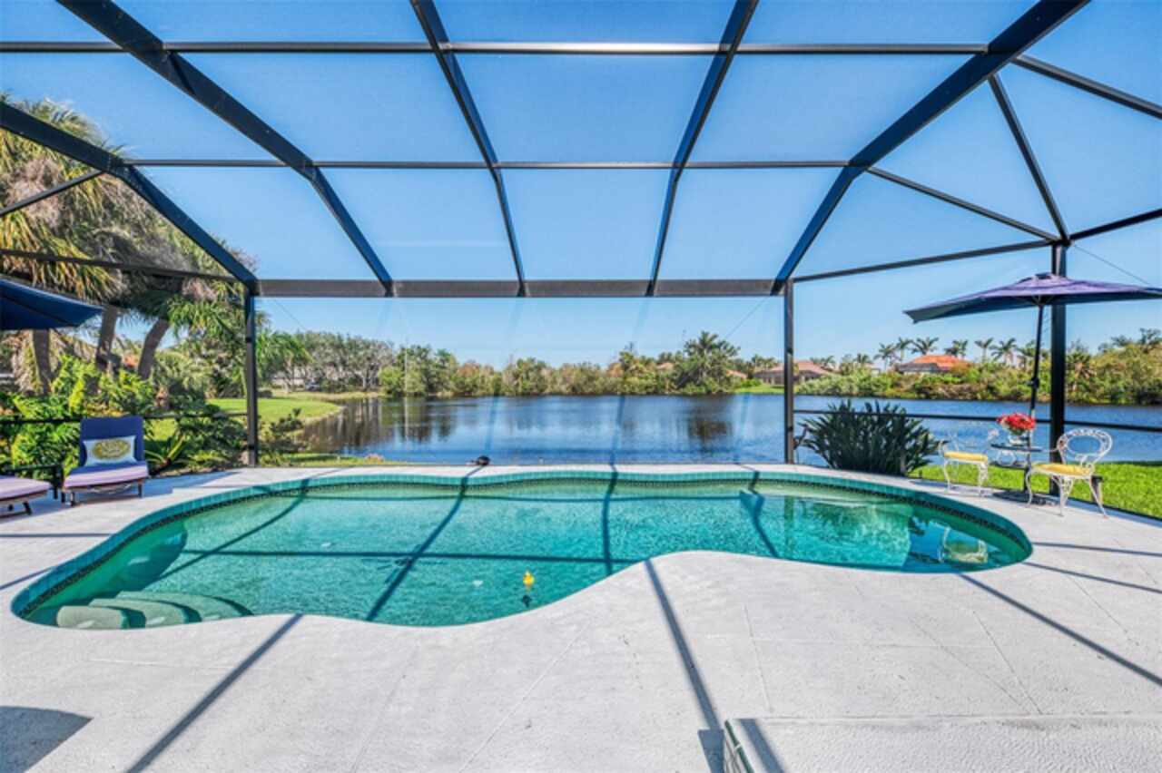Indulge in a lifestyle where the beauty of nature meets the simplicity of living in the delightful community of Riverwood. A impeccably maintained custom Yorktowne estate home in the desired Eagle Trace neighborhood. This well appointed home features stunning hardwood floors throughout the living area into the bedrooms. The formal dining area, enhanced with a most elegant chandelier is ideal for special gatherings while the updated eat in kitchen with wood cabinets, granite counter tops & stainless steel appliances provide for a clutter-free space for casual dining and entertaining. The third bedroom currently used as a media room offers versatility with pocketdoor access into the kitchen area. The sliding glass doors will lead you to the spacious lanai with an inviting pool for year round fun and relaxation. Take in the beautiful water and preserve views from the gorgeous "Cinema" picture screen enclosure . The primary suite, with access to the lanai, includes a walk-in closet, tub and separate shower. A split floor plan provides privacy for you and your guests. Added features include; NEW ROOF (2021), NEW POOL CAGE (2023), HVAC (2021), Hurricane Shutters, crown molding, plantation shutters and modern light fixtures. This is Florida Living at its Best! Don't let this extraordinary opportunity slip away! GOLF CLUB NAMED *TOP 50 US COURSES* *GOLF ADVISOR* *2018*, ACTIVITY CENTER CAMPUS INCLUDES LAP & RESORT STYLE POOL, FITNESS CENTER, PICKLE-BALL COURTS, SMALL AND LARGE DOG PARKS, TENNIS COURTS, LAWN CROQUET, BOCCE COURTS, CRAFT ROOM, LIBRARY AND SOCIAL ACTIVITIES! Additional fees apply for Riverwood Golf Club & Private Beach Club on Manasota Key. Riverwood is Close to Tampa Bay Rays Spring Training Facility, Atlanta Braves Spring Training Facility, Gulf Beaches, Carlotte Harbor, Myakka River, Punta Gorda, Englewood and Boca Grande. Riverwood, a Perfect Blend of Florida's Nature and Resort Lifestyle.