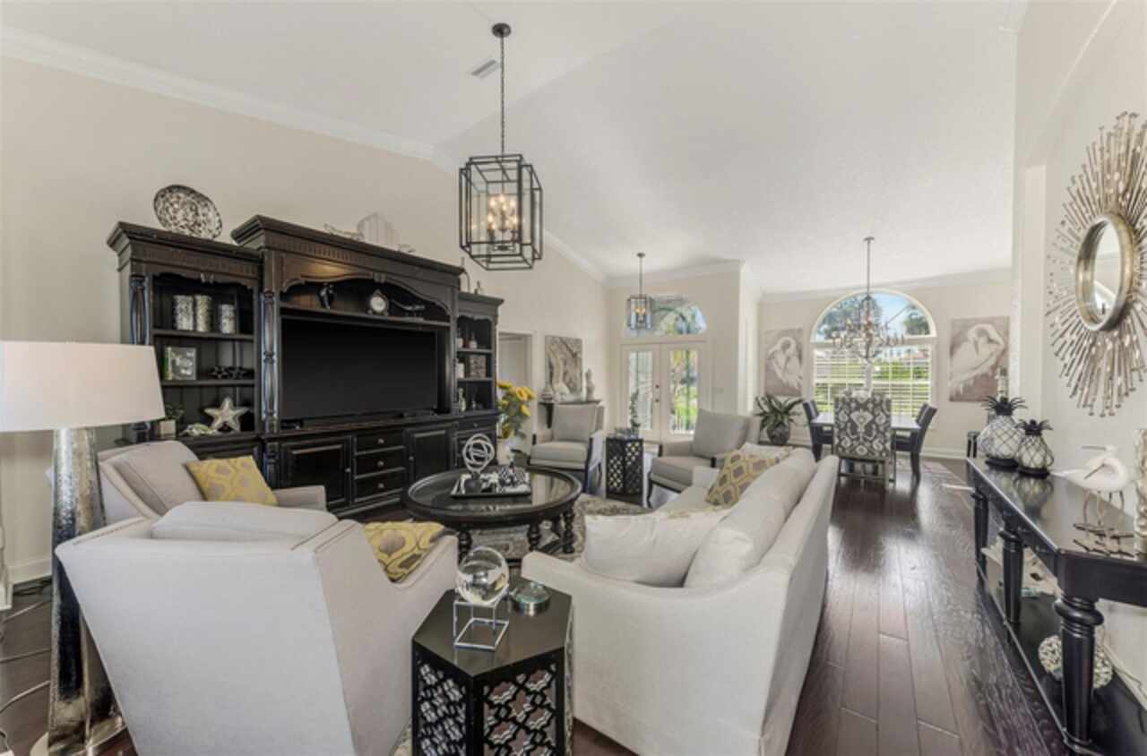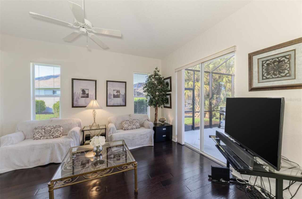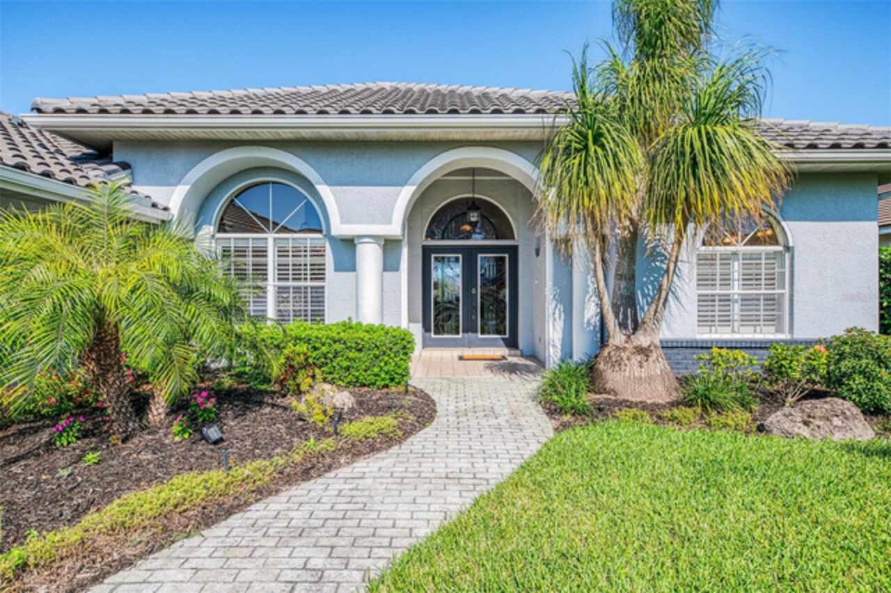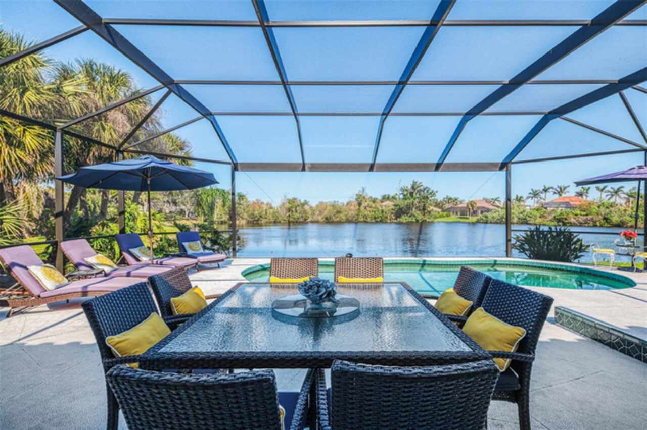 Indulge in a lifestyle where the beauty of nature meets the simplicity of living in the delightful community of Riverwood. A impeccably maintained custom Yorktowne estate home in the desired Eagle Trace neighborhood. This well appointed home features stunning hardwood floors throughout the living area into the bedrooms. The formal dining area, enhanced with a most elegant chandelier is ideal for special gatherings while the updated eat in kitchen with wood cabinets, granite counter tops & stainless steel appliances provide for a clutter-free space for casual dining and entertaining. The third bedroom currently used as a media room offers versatility with pocketdoor access into the kitchen area. The sliding glass doors will lead you to the spacious lanai with an inviting pool for year round fun and relaxation. Take in the beautiful water and preserve views from the gorgeous "Cinema" picture screen enclosure . The primary suite, with access to the lanai, includes a walk-in closet, tub and separate shower. A split floor plan provides privacy for you and your guests. Added features include; NEW ROOF (2021), NEW POOL CAGE (2023), HVAC (2021), Hurricane Shutters, crown molding, plantation shutters and modern light fixtures. This is Florida Living at its Best! Don't let this extraordinary opportunity slip away! GOLF CLUB NAMED *TOP 50 US COURSES* *GOLF ADVISOR* *2018*, ACTIVITY CENTER CAMPUS INCLUDES LAP & RESORT STYLE POOL, FITNESS CENTER, PICKLE-BALL COURTS, SMALL AND LARGE DOG PARKS, TENNIS COURTS, LAWN CROQUET, BOCCE COURTS, CRAFT ROOM, LIBRARY AND SOCIAL ACTIVITIES! Additional fees apply for Riverwood Golf Club & Private Beach Club on Manasota Key. Riverwood is Close to Tampa Bay Rays Spring Training Facility, Atlanta Braves Spring Training Facility, Gulf Beaches, Carlotte Harbor, Myakka River, Punta Gorda, Englewood and Boca Grande. Riverwood, a Perfect Blend of Florida's Nature and Resort Lifestyle.