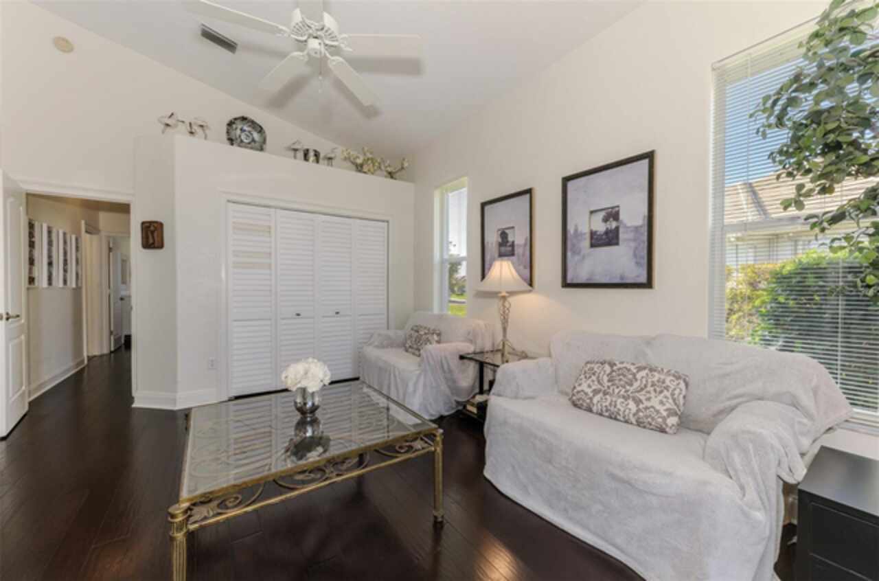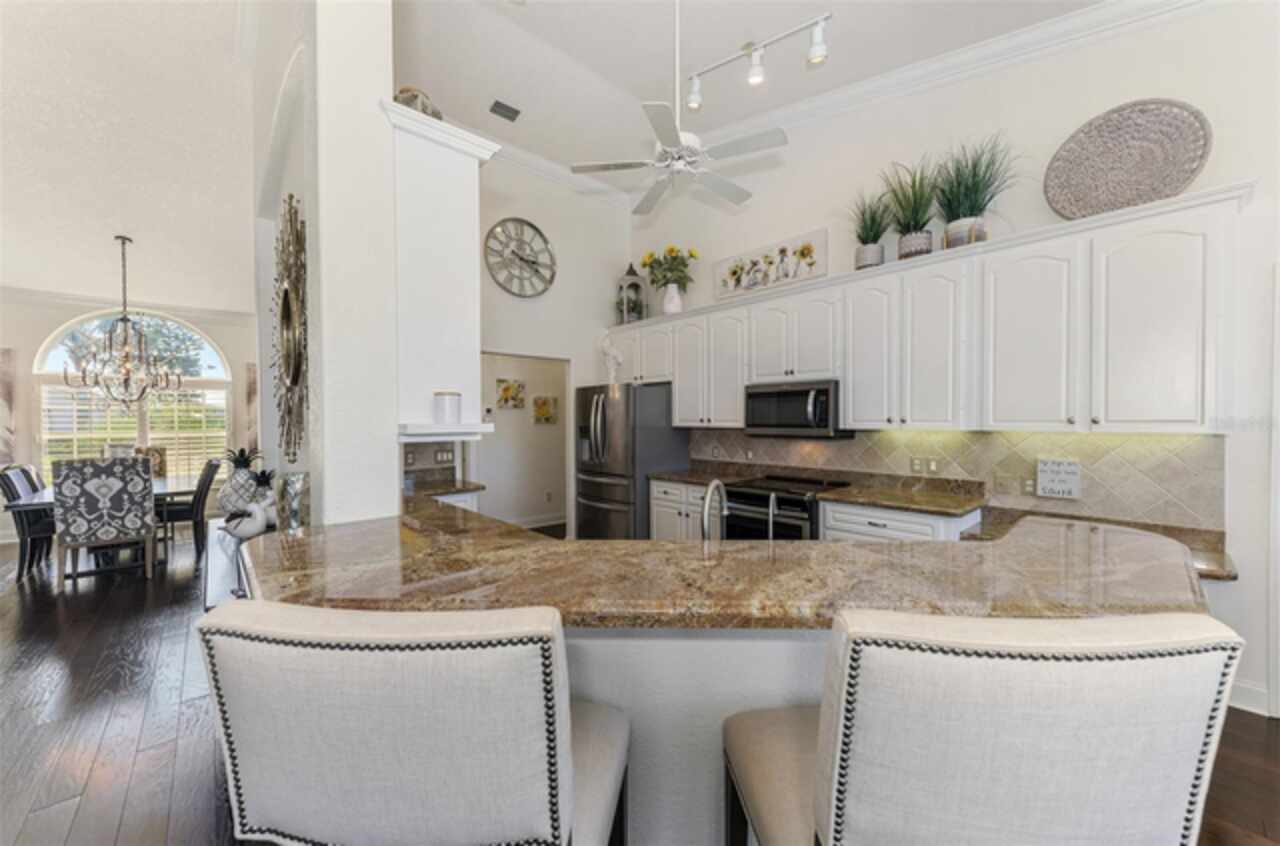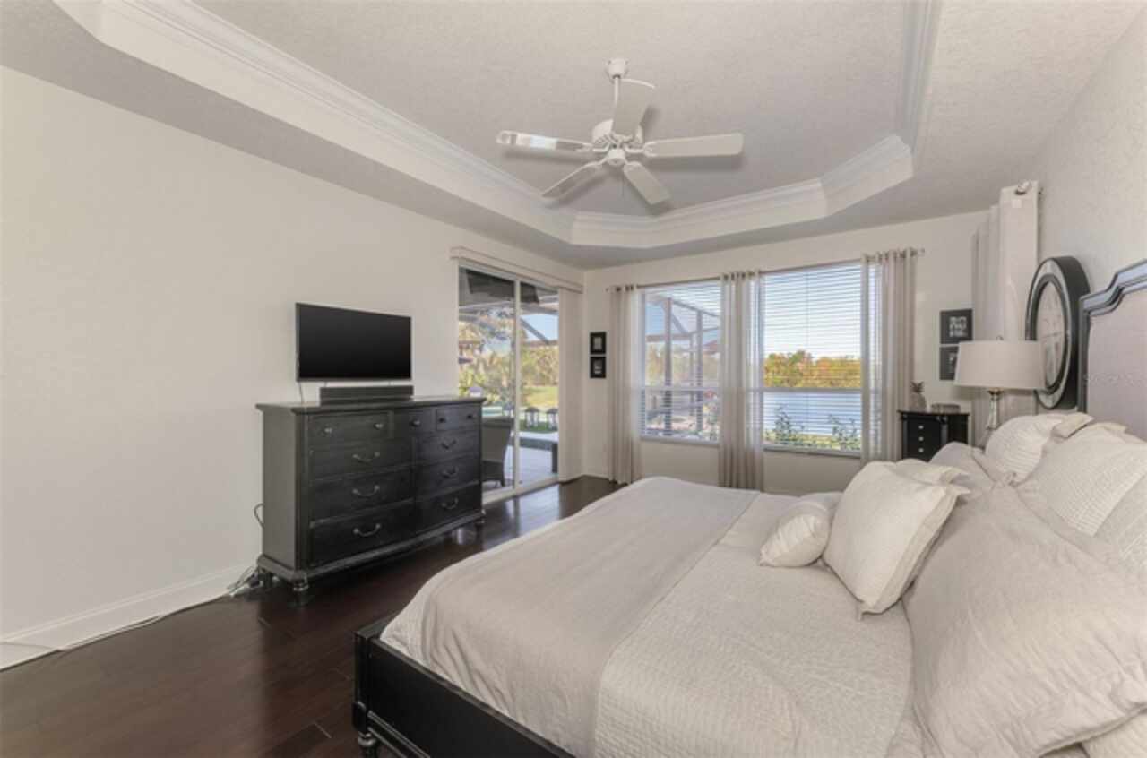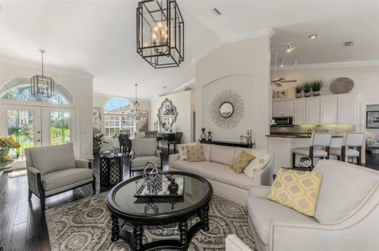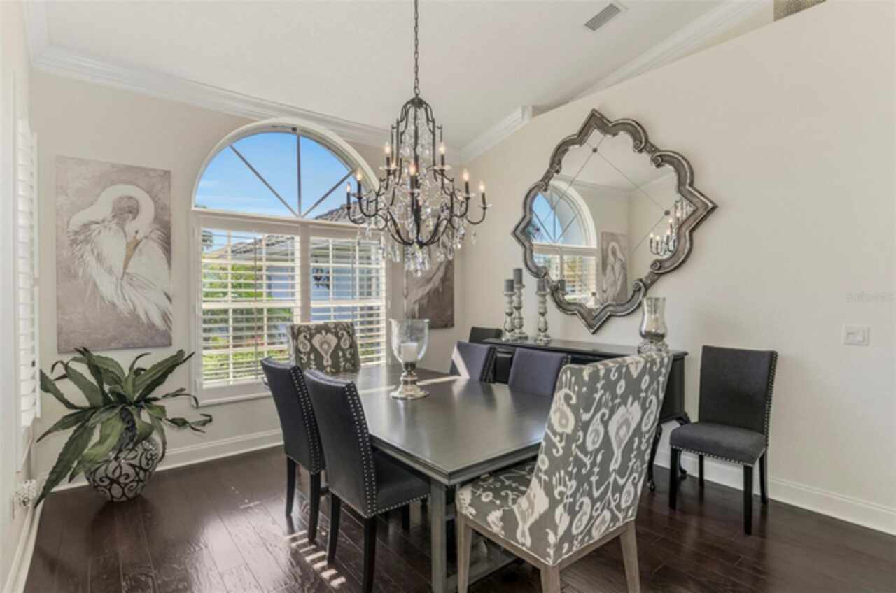 Indulge in a lifestyle where the beauty of nature meets the simplicity of living in the delightful community of Riverwood. A impeccably maintained custom Yorktowne estate home in the desired Eagle Trace neighborhood. This well appointed home features stunning hardwood floors throughout the living area into the bedrooms. The formal dining area, enhanced with a most elegant chandelier is ideal for special gatherings while the updated eat in kitchen with wood cabinets, granite counter tops & stainless steel appliances provide for a clutter-free space for casual dining and entertaining. The third bedroom currently used as a media room offers versatility with pocketdoor access into the kitchen area. The sliding glass doors will lead you to the spacious lanai with an inviting pool for year round fun and relaxation. Take in the beautiful water and preserve views from the gorgeous "Cinema" picture screen enclosure . The primary suite, with access to the lanai, includes a walk-in closet, tub and separate shower. A split floor plan provides privacy for you and your guests. Added features include; NEW ROOF (2021), NEW POOL CAGE (2023), HVAC (2021), Hurricane Shutters, crown molding, plantation shutters and modern light fixtures. This is Florida Living at its Best! Don't let this extraordinary opportunity slip away! GOLF CLUB NAMED *TOP 50 US COURSES* *GOLF ADVISOR* *2018*, ACTIVITY CENTER CAMPUS INCLUDES LAP & RESORT STYLE POOL, FITNESS CENTER, PICKLE-BALL COURTS, SMALL AND LARGE DOG PARKS, TENNIS COURTS, LAWN CROQUET, BOCCE COURTS, CRAFT ROOM, LIBRARY AND SOCIAL ACTIVITIES! Additional fees apply for Riverwood Golf Club & Private Beach Club on Manasota Key. Riverwood is Close to Tampa Bay Rays Spring Training Facility, Atlanta Braves Spring Training Facility, Gulf Beaches, Carlotte Harbor, Myakka River, Punta Gorda, Englewood and Boca Grande. Riverwood, a Perfect Blend of Florida's Nature and Resort Lifestyle.