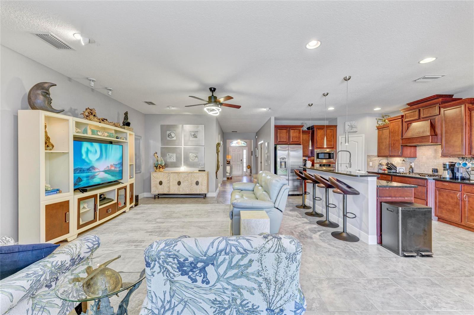 Under contract-accepting backup offers. Nestled on a peaceful cul-de-sac, this stunning 4-bedroom, 2.5-bath home offers serene pond views and a tranquil backyard filled with local wildlife — including ducks, cranes, and the occasional otter. Step inside to find a well-maintained home featuring beautiful neutral tile flooring throughout. The gourmet kitchen boasts abundant cabinetry, generous counter space, a walk-in pantry, and a convenient bar island — perfect for both everyday living and entertaining. The spacious primary suite includes two walk-in closets with built in shelving to help keep everything organized. The luxurious primary bathroom was remodeled in 2019, featuring a soaking tub with 20 relaxing air jets and heated air blower, and the walk-in shower provides multiple shower heads including a rainfall shower, and elegant finishes. Enjoy Florida’s outdoor lifestyle from the expansive screened lanai, complete with a fully equipped outdoor kitchen — ideal for entertaining or relaxing while taking in the breathtaking sunset views over the pond. Recent updates within the last year include a new HVAC system, refrigerator, hot water heater, and automatic garage door opener, providing peace of mind and modern comfort. The home also features a whole-house reverse osmosis system, delivering the highest quality filtered water for drinking, cooking, and bathing. Professionally designed landscape lighting showcases the lush landscaping and enhances the home’s curb appeal both day and night. One of the bedrooms includes a built-in Murphy bed (which conveys with the home); while the closet was removed, it could easily be reinstalled if desired. Ideally located just off University Parkway, you’re minutes from SRQ Airport, downtown Sarasota, shopping, dining, and the area’s world-famous beaches. Experience comfort, beauty, and Florida living at its finest in this exceptional home.