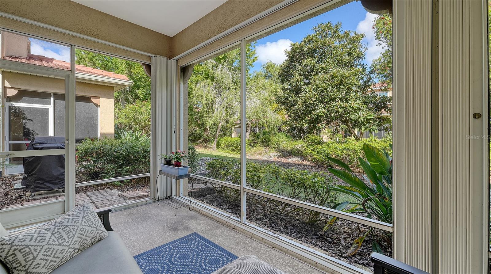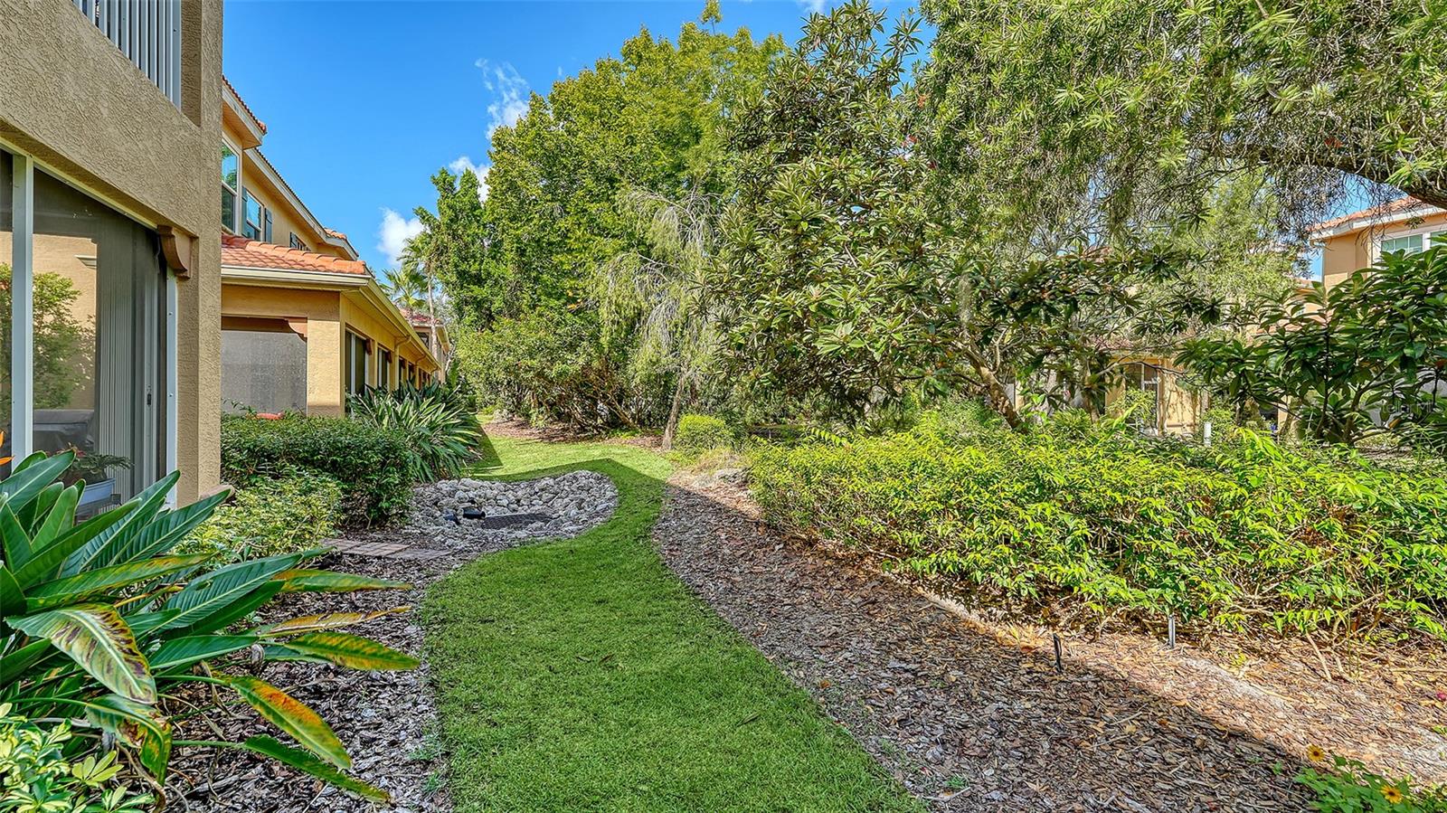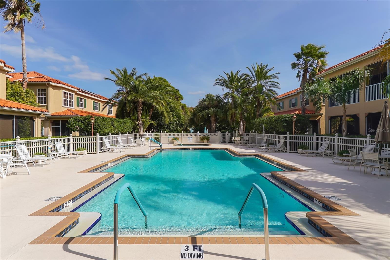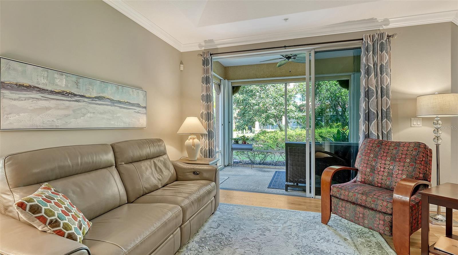 Tropical paradise awaits you. This fabulous, elegant 3BR/2BA 2 car garage first floor unit is fabulous. The beautiful kitchen offers quartz counters, wood cabinets with wood pull outs, snack bar, eat-in area, pantry closet top of the line appliances & canned lighting. Boasting crown moldings, tray ceilings, wood and tile flooring, central vac, huge primary bedroom closet, ship lap accent wall in 2nd Bathroom. Partially furnished, most furniture in Living room, artwork, dining room set, bedroom furniture plus 2 Murphy beds located in bedroom 2 & 3, which create space and storage. Hurricane shutters and impact windows. The spacious Living room and Dining room overlook the huge lanai, then a private oasis including pond with fountain and lush landscaping. The primary bedroom has a coffered ceiling. The primary bath offers a separate soaking tub & shower, plus dual sinks. The barrel tile roof was replaced in 2023 (which is a condominium responsibility). A/C is 4 years young, water heater replaced in 2019. This is not an age restricted community, very friendly 29 units, community pool, spa and pavilion. 2 pets are allowed dog or cats up to 30 lbs. You can’t beat this terrific location right across from Costco, JC Penny, Legacy trail, near the YMCA and just minutes to Siesta Key Beach. See it Today.