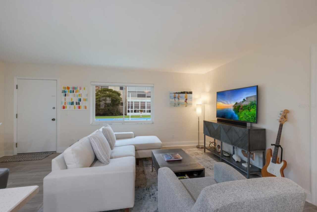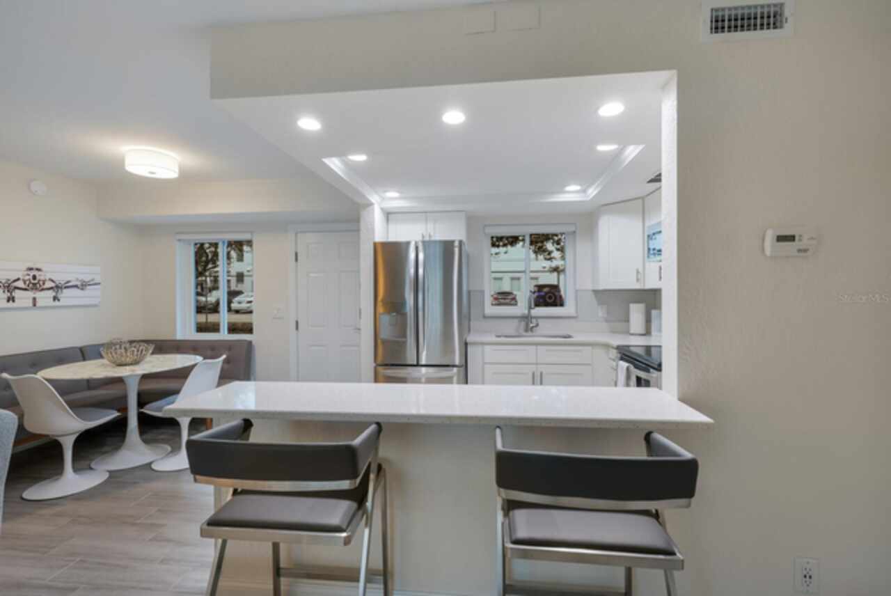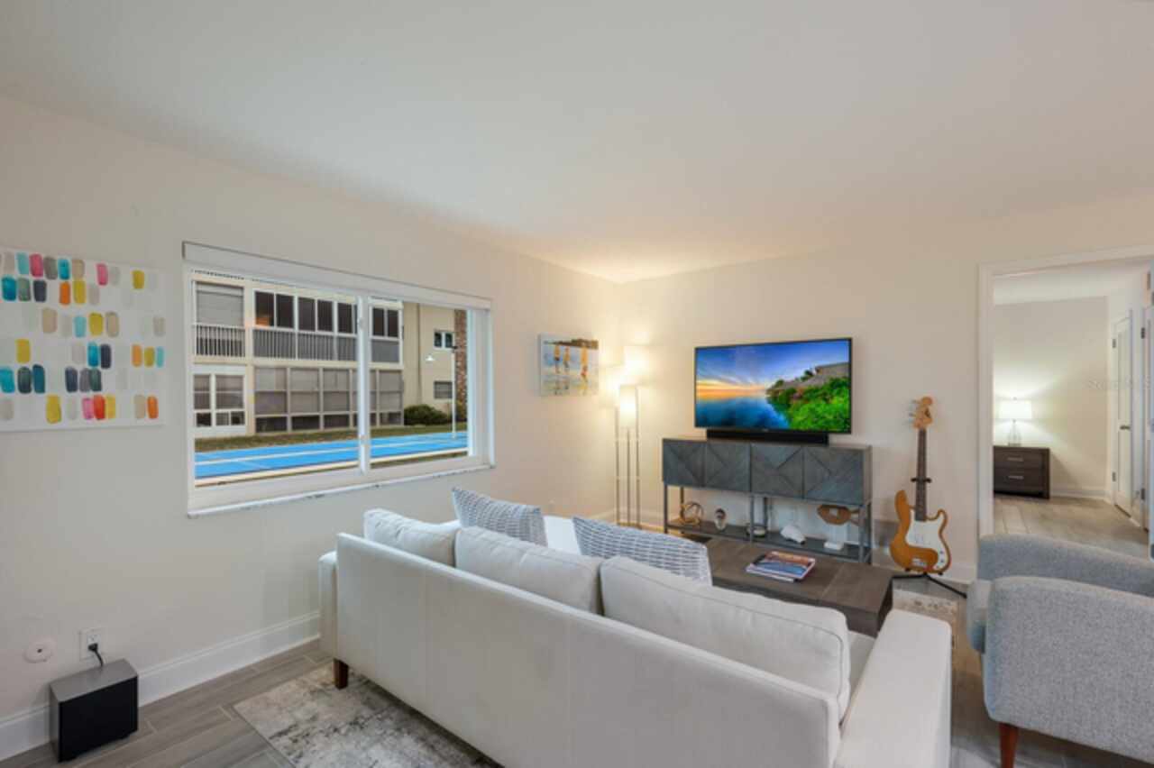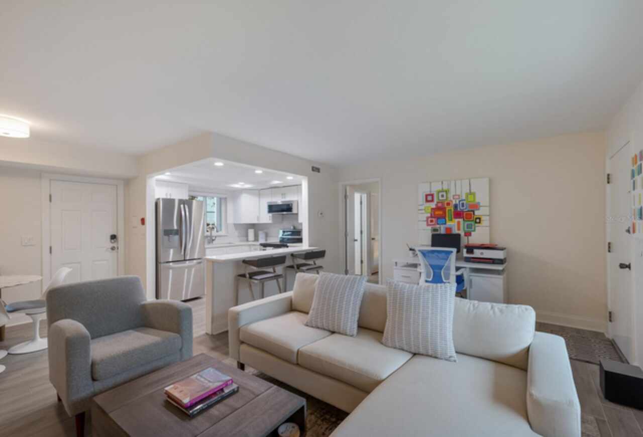 WOW, WOW, WOW! This is a huge surprise. COMPLETELY & BEAUTIFULLY RENOVATED + FULLY FURNISHED, including IMPACT (Hurricane-rated) windows, a GROUND FLOOR quiet hideaway, only steps from Fleming's Steakhouse, Baker and Wife, Rendez-Vous French bakery, Cinebistro movie theaters and a few miles from a Siesta Key Beach and a thriving downtown. You will love how NATURALLY LIGHT, bright and fresh this space is! Remodel completed in 2023, including kitchen with quartz countertops and a breakfast bar, both baths, all flooring, windows and custom window shades. Parking directly outside of your kitchen door. Feet from the Southgate Mall, Florida Studio Theatre, Fleming's Steakhouse, Baker and Wife, Rendez-Vous French bakery, Cinebistro movie theaters and Rick's and Andrea's. A straight shot down Siesta Drive to Siesta Key Village and Beaches and minutes from Sarasota Memorial Hospital + Downtown. The condominium has been lightly used to visit family in town and is NOT IN A FLOOD ZONE. If you're looking for a place for you to live in while you build a home, or need a place for Mom, a fresh new start or a pied a terre, this is IT!