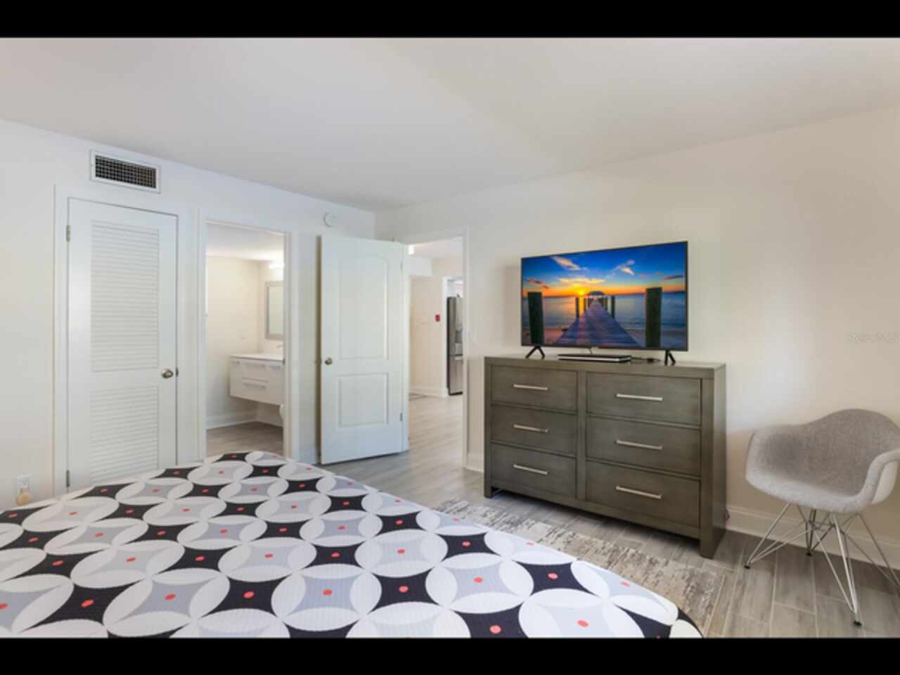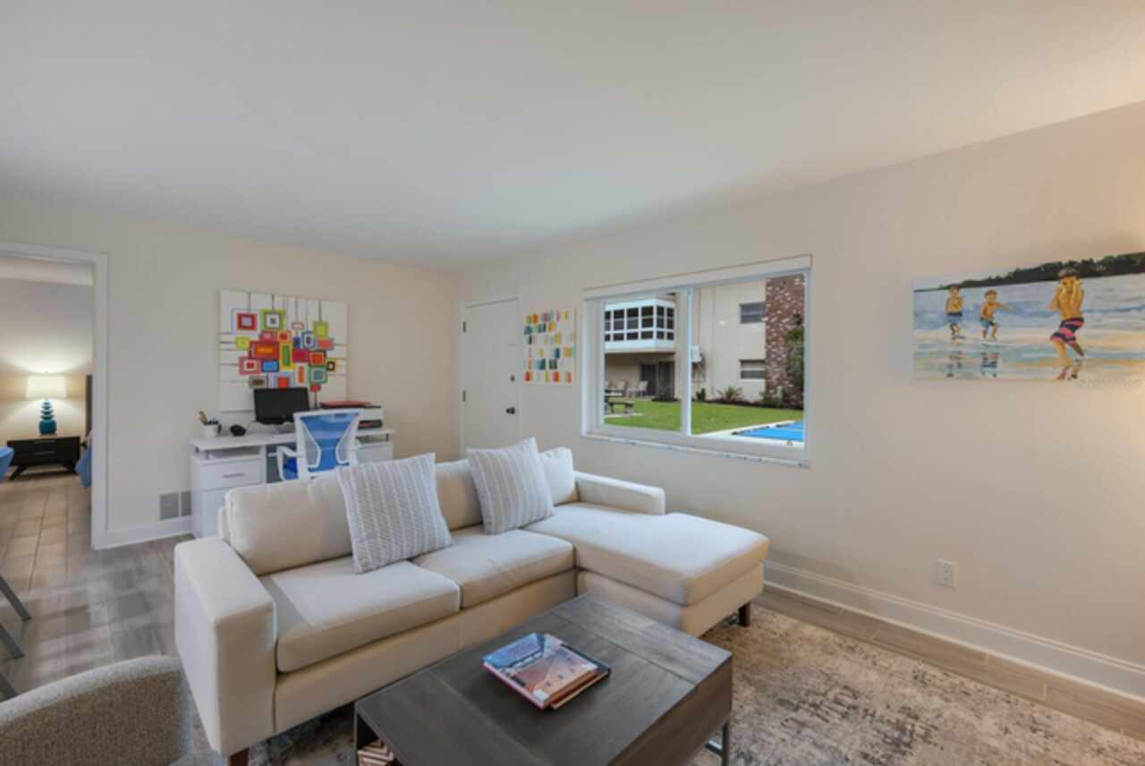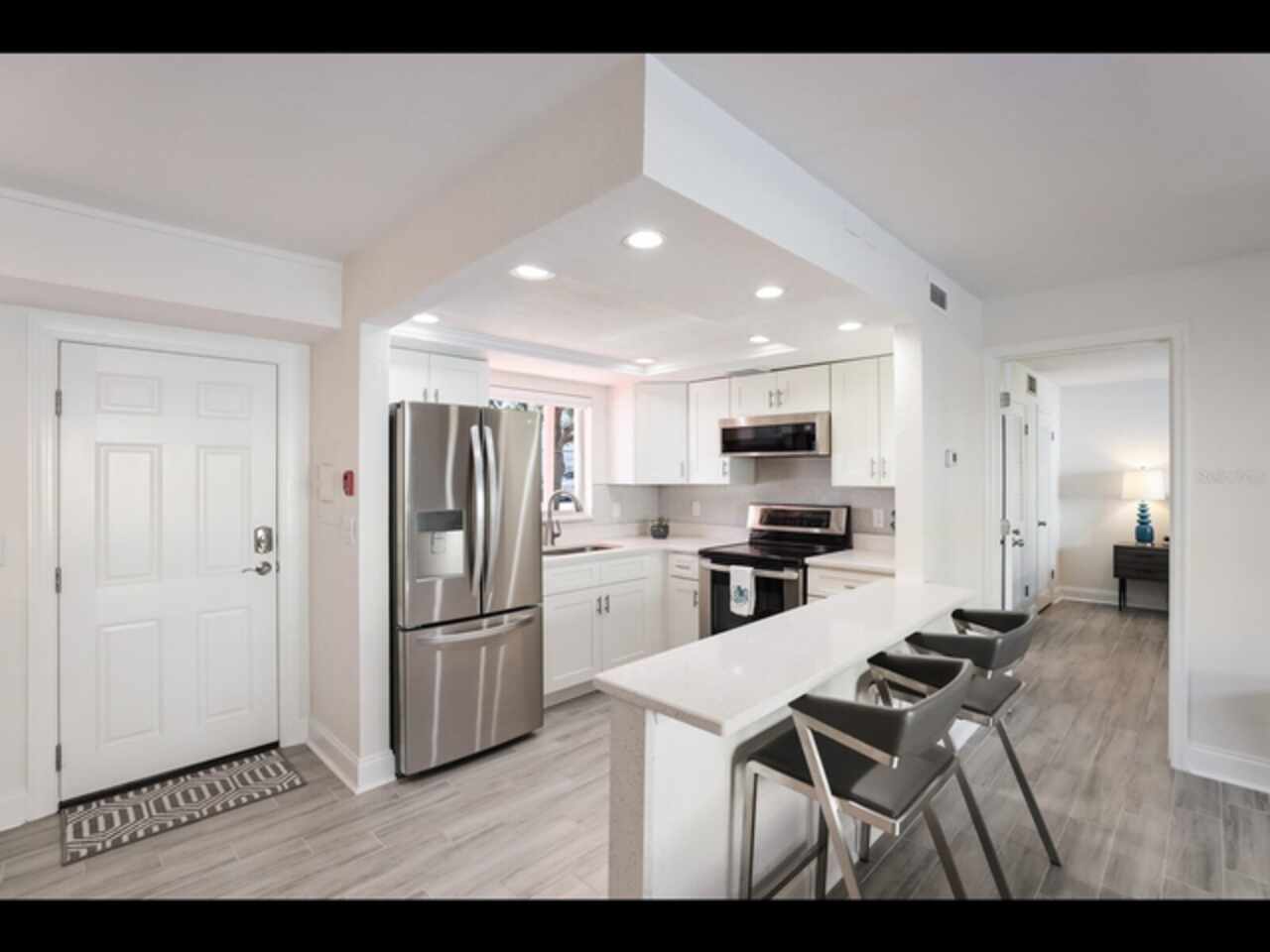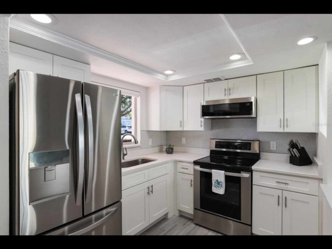 WOW, WOW, WOW! This is a huge surprise. COMPLETELY & BEAUTIFULLY RENOVATED + FULLY FURNISHED, including IMPACT (Hurricane-rated) windows, a GROUND FLOOR quiet hideaway, only steps from Fleming's Steakhouse, Baker and Wife, Rendez-Vous French bakery, Cinebistro movie theaters and a few miles from a Siesta Key Beach and a thriving downtown. You will love how NATURALLY LIGHT, bright and fresh this space is! Remodel completed in 2023, including kitchen with quartz countertops and a breakfast bar, both baths, all flooring, windows and custom window shades. Parking directly outside of your kitchen door. Feet from the Southgate Mall, Florida Studio Theatre, Fleming's Steakhouse, Baker and Wife, Rendez-Vous French bakery, Cinebistro movie theaters and Rick's and Andrea's. A straight shot down Siesta Drive to Siesta Key Village and Beaches and minutes from Sarasota Memorial Hospital + Downtown. The condominium has been lightly used to visit family in town and is NOT IN A FLOOD ZONE. If you're looking for a place for you to live in while you build a home, or need a place for Mom, a fresh new start or a pied a terre, this is IT!