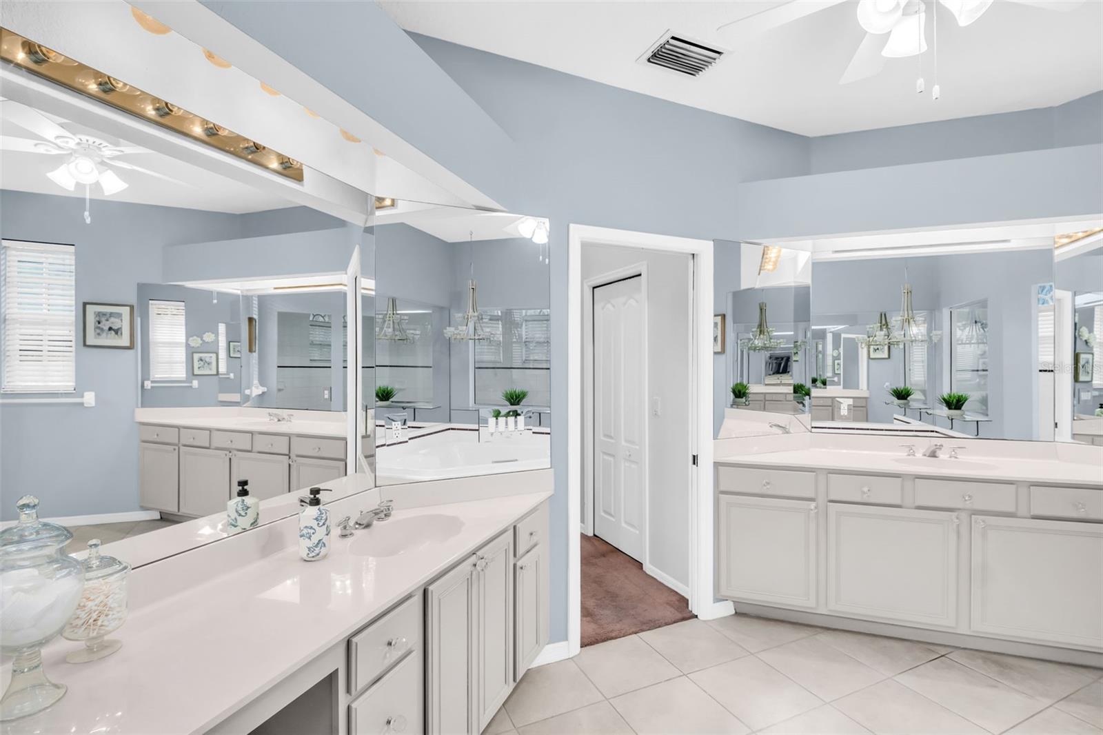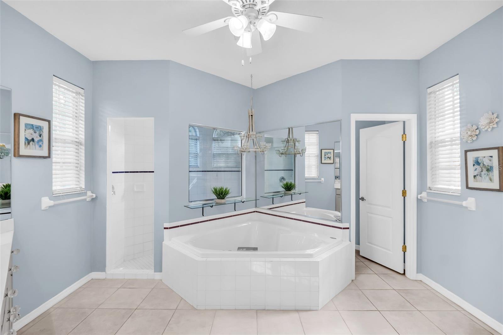 Ceiling Fans(s), Eat-in Kitchen, High Ceilings, Kitchen/Family Room Combo, Living Room/Dining Room Combo, Primary Bedroom Main Floor, Solid Wood Cabinets, Split Bedroom, Stone Counters, Thermostat, Vaulted Ceiling(s), Walk-In Closet(s), Window Treatments