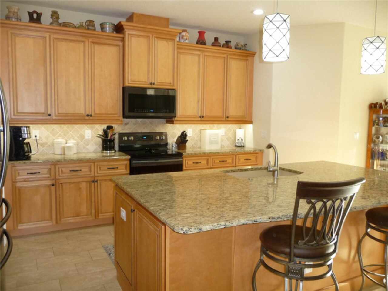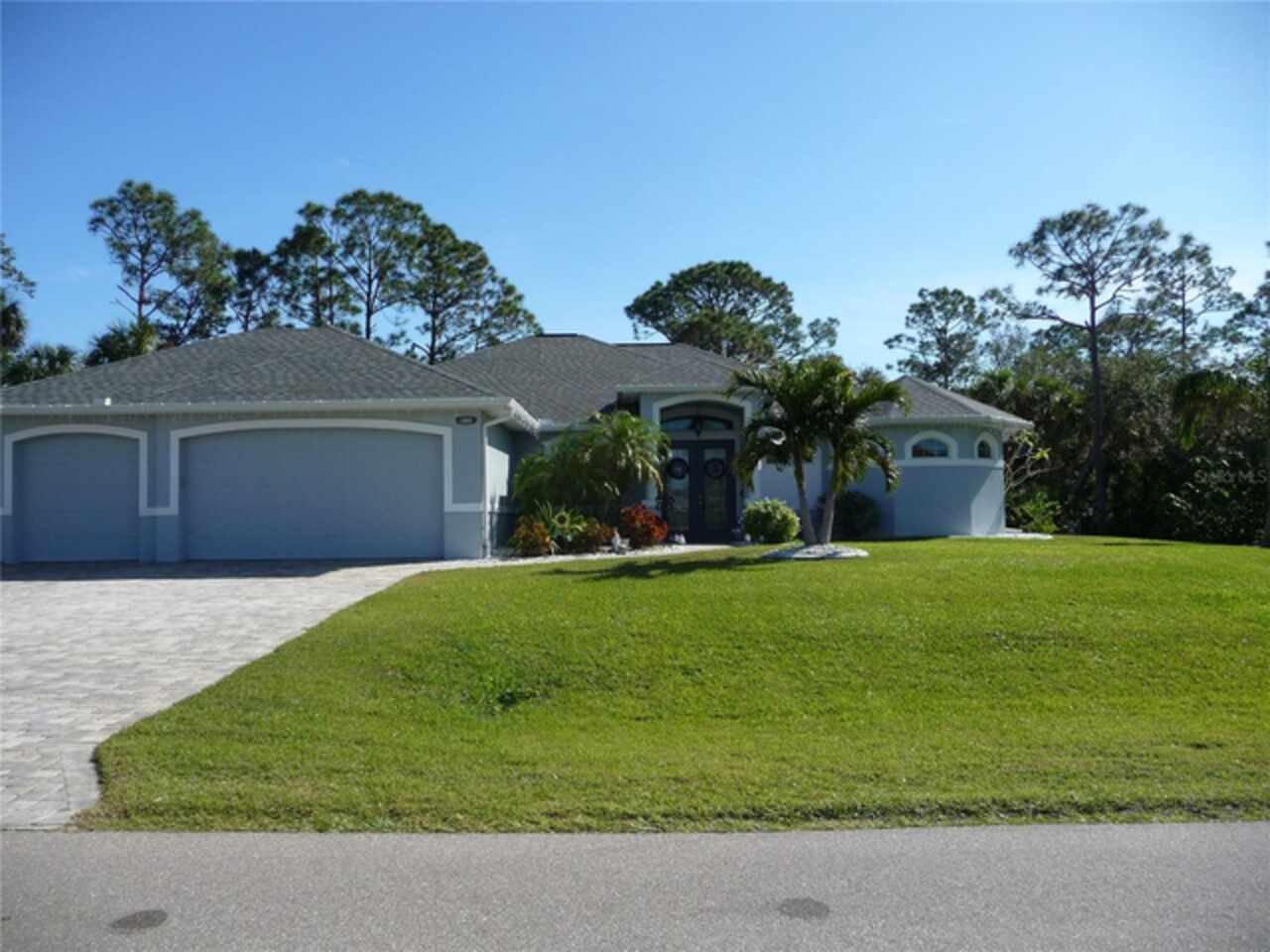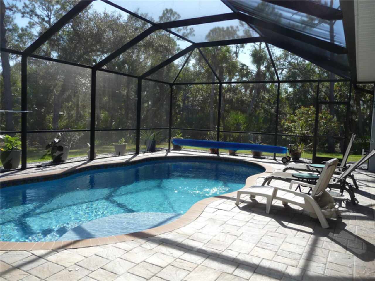 PRETTIEST HOUSE ON THE STREET, according to neighbors, this custom built high-end home will become your Florida dream home. Etched glass double entry front doors welcome you into a large foyer and open floorplan. High ceilings provide lots of light and low utility bills and an open inviting space. Tall pocket sliding glass doors cover one living room wall and dining room wall to completely open the outdoors for entertaining and enjoying the gulf breezes. The great room has a double trayed ceiling and built-in surround sound and lighting for that special ambience. A HUGE island in the kitchen provides lots of room for eating and preparing your gourmet meals. 42" solid wood cabinets have pull-out trays for convenience and are all soft-close. All bedrooms are spacious and have walk-in closets. The primary bedroom comes with an ensuite bathroom, tiled ROMAN SHOWER, separate vanities and private water closet. Outside you will find a large pavered and enclosed lanai. The pool is heated, has a light and is accompanied by an outdoor shower. Last but not least is the 3 car garage and WORK SHOP with air conditioning. Flooring is expoxy for easy clean up and the garage doors are insulated. This lovely home on a double lot is close to great shopping, 5 sparkling beaches, the Atlanta Braves ball park, North Port Aqua Center, disk golf park, walking trails and many fantastic seafood restaurants. Airports are plentiful in Punta Gorda, Sarasota, Ft. Myers and Tampa. Room sizes are approximate. Call the listing agent for more details.