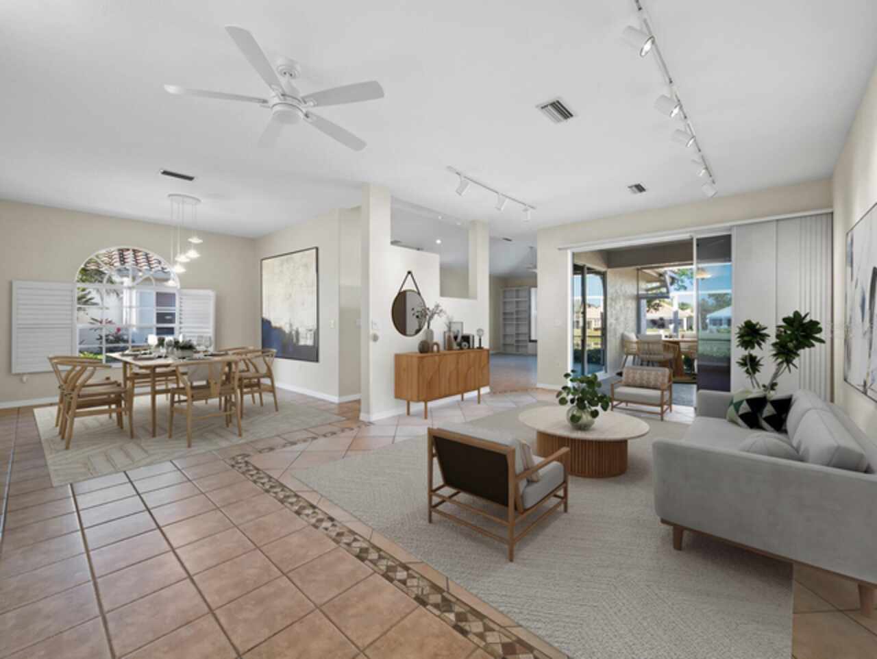 Ceiling Fans(s), High Ceilings, Living Room/Dining Room Combo, Open Floorplan, Primary Bedroom Main Floor, Thermostat, Window Treatments