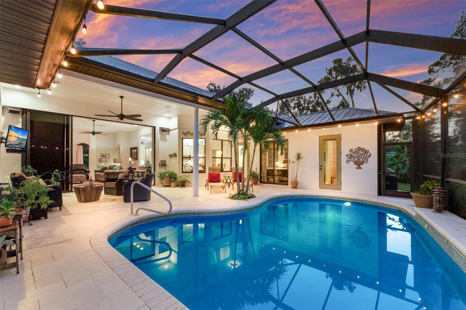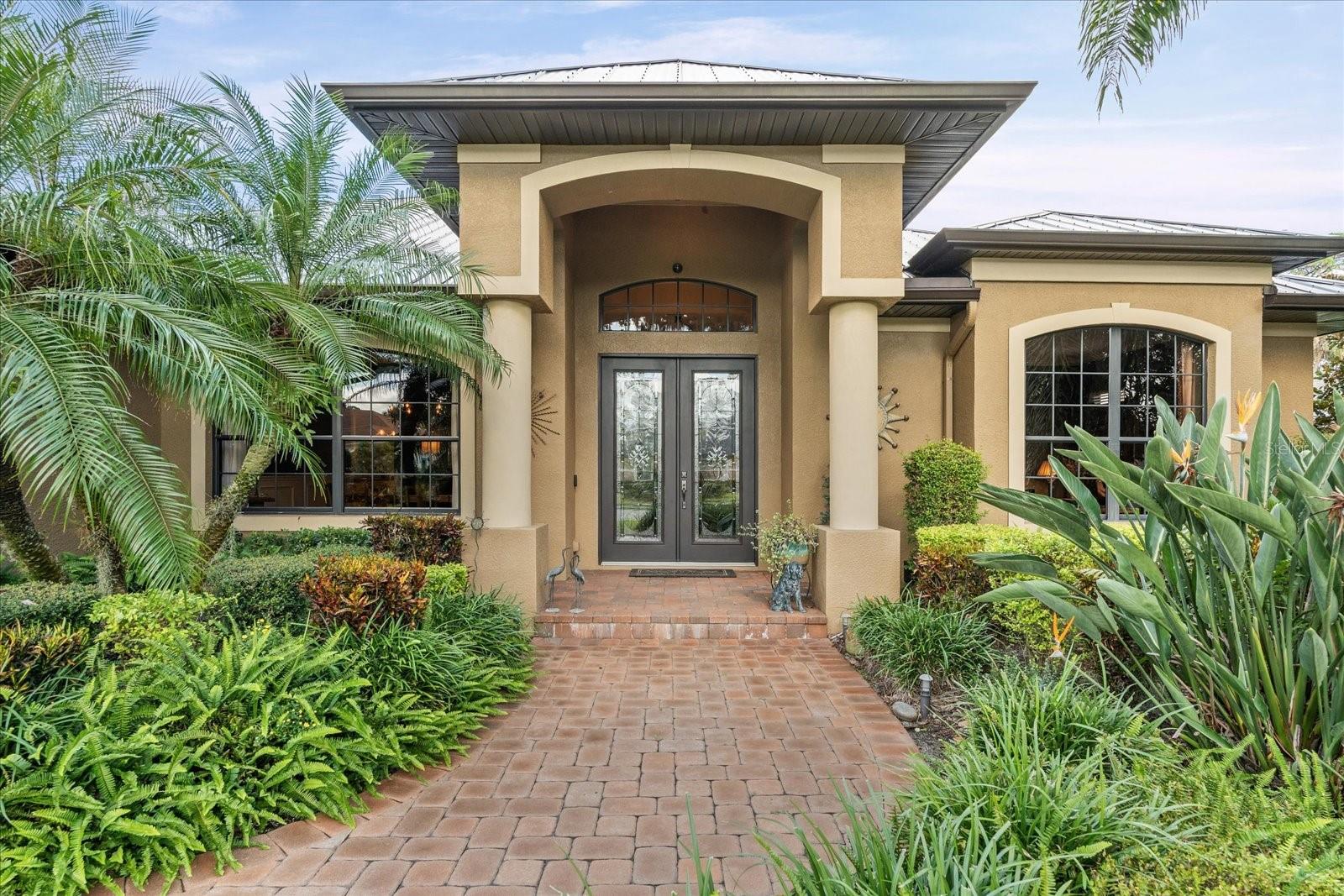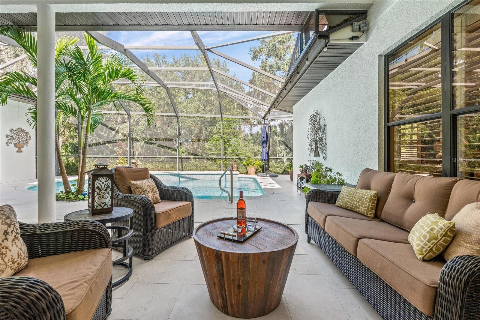 Highly sought-after Twin Rivers is where you’ll find this stunning, custom-built Mark Cahill home — perfectly positioned in a serene, park-like setting surrounded by majestic oaks, swaying palms, and lush lawns. This immaculately maintained residence blends timeless craftsmanship with thoughtful recent upgrades and incredible 'Old Florida' curb appeal. Step through the beautiful glass double doors into the inviting foyer and take in the open, well-designed floor plan. Beyond the wall of disappearing sliders, the private lanai and refreshed pool and decking create a true outdoor oasis framed by the tranquil natural preserve. Boasting 3, 235 sq. ft. of living space, the home includes three bedrooms, three full baths, a spacious great room that flows effortlessly into the kitchen and pool areas, a formal living and dining room, and a dedicated office/den with French doors and built-in shelving — ideal for working from home or nursery. The chef’s kitchen is a showstopper — complete with double ovens, two prep sinks with disposals, granite counters, abundant 42” solid wood cabinetry with crown molding, a separate pantry, and a butler’s pantry with glass-front display cabinets. Ample natural light pours in from solar tubes, while under- and over-cabinet lighting enhances both style and function. The split bedroom floor plan ensures privacy for everyone. The luxurious primary suite offers his-and-her walk-in closets, plantation shutters, dual vanities, an oversized jetted soaking tub, and a fully tiled walk-in shower “room” with dual shower heads. The en-suite guest bedroom features its own large tiled shower and walk-in closet — perfect for extended stays. Throughout the home, you’ll find 6” crown molding and baseboards, upgraded lighting and ceiling fans, complete interior painting including ceilings, and updated fixtures that give the entire home a fresh, sophisticated feel. Outdoor living shines on the private, screened lanai — perfect for lounging by the sparkling pool, entertaining, or relaxing under the café lighting that adds a touch of evening magic. A new (2023) 5V painted metal roof crowns the home for years of beauty and durability. Garages & Storage- Main home: Oversized 612 sq. ft. two-car garage with tall ceilings and built-in storage. Detached garage: Additional 550 sq. ft. air-conditioned two-car garage ideal for hobby space, vehicles, or workshop use — both with pull-down attic storage. And a wide, paver driveway provides ample parking for guests. Additional Opportunity- An adjacent premium lakeside lot is also available under separate contract — ideal for additional privacy or future investment. Community Highlights- Residents enjoy a fishing dock, kayak/canoe launch, playground, basketball and volleyball courts, soccer field, and scenic walk/bike/golf cart-friendly streets throughout this beautiful Twin Rivers community.