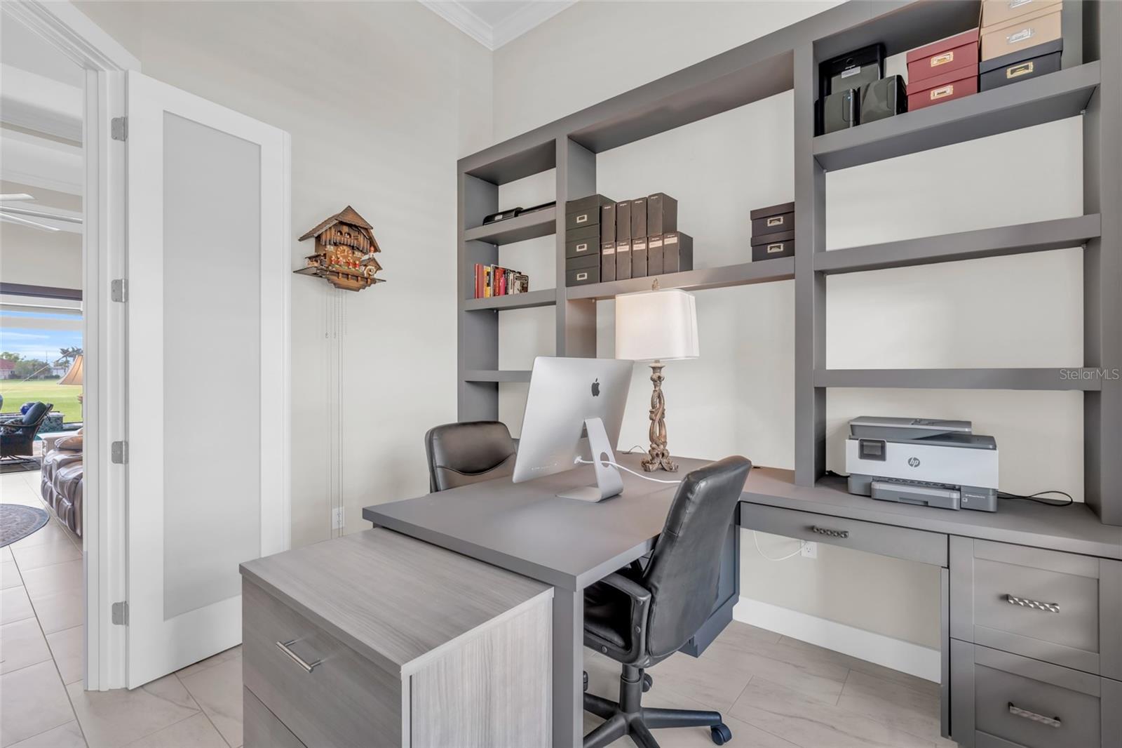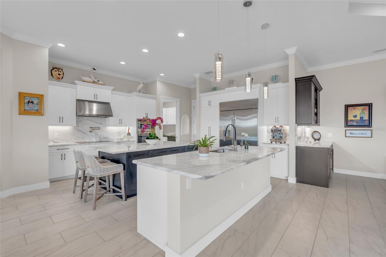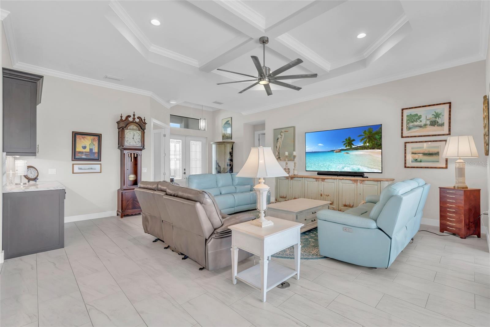 This exceptional residence, situated on the 13th hole of Twin Isles Golf Course, offers a captivating blend of contemporary design, high-end finishes, and picturesque southwestern views for unforgettable sunsets. From the moment you arrive, the expansive paver driveway and walkway, lush landscaping, elegant glass double doors, and Bahamian style accent shutters create a captivating first impression. Boasting a large open floor plan, this 2020-built three bedroom plus den home features impact glass windows and doors, and soaring coffered ceilings with elegant crown molding. A zero-corner slider seamlessly connects the living room to the outdoor oasis, where you will no doubt spend countless evenings unwinding as the sun sets over the large picture window screen enclosure. The expansive outdoor entertaining area features a handsome heated saltwater pool with spillover, Pebble Tec finish, inviting in-pool lounges, plus Pentair controls, all overlooking the expansive golf course. You will love to relax with friends or dine al fresco under the ample covered lanai with convenient pool bath access. The chef’s kitchen is a culinary dream, with abundant work/entertaining surfaces and storage. High end stone counters and backsplash add pizzazz to this killer kitchen, while GE Profile appliances, including a 48” wide refrigerator, cooktop, and built-in double oven support all of your culinary needs. Entertaining is a breeze with a dedicated bar with wine chiller, dual islands with breakfast bar seating, and a hidden oversized walk-in pantry. Throughout the home, you'll find a rich neutral color scheme, light colored plank tile flooring, custom lighting, crown molding, plantation shutters, and solid-core doors. The dedicated office, accessed via French doors, includes an impressive custom built-in office system. Prepare to be blown away by the oversized 22x40 air-conditioned 4 car garage, with epoxy floor and plenty of room for tinkering and storage! The luxurious master suite is a serene retreat featuring tray ceilings, motorized shades, private lanai access, dual walk-in closets, and bonus built in storage. The enticing spa-like bath offers split vanities, large soaking tub, and a custom walk-through shower. The split-bedroom layout ensures privacy for guests, with two generously sized suites…one with direct lanai access and ensuite bath and a second featuring ensuite with a walk-in closet. An impressive utility room completes this incredible home with tremendous storage to keep you organized. Impact windows plus a motorized roll down lanai shutter, installed in 2023, allows you to vacation with peace of mind. Burnt Store Isles is a deed-restricted golf and boating community, offering great proximity to downtown Punta Gorda, Fishermen’s Village, world-class fishing and boating, and beautiful parks.