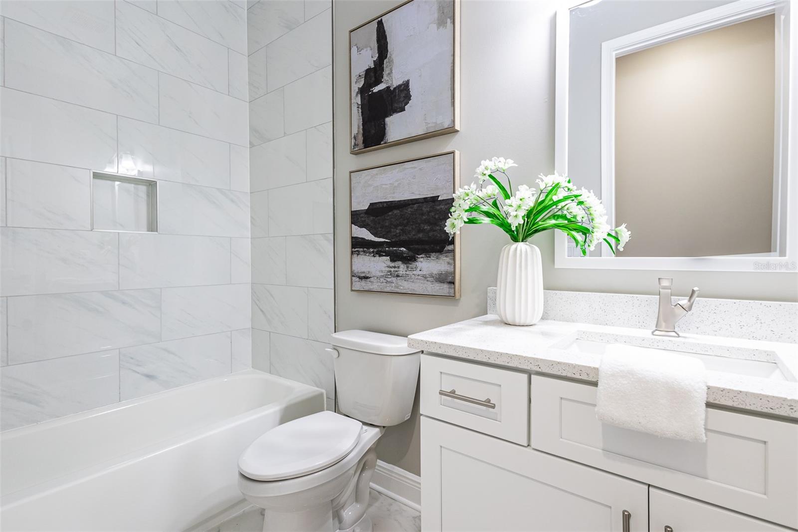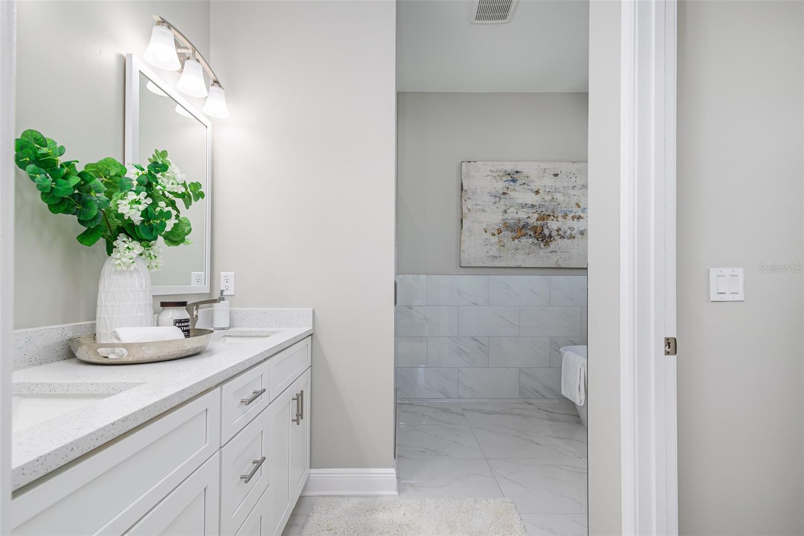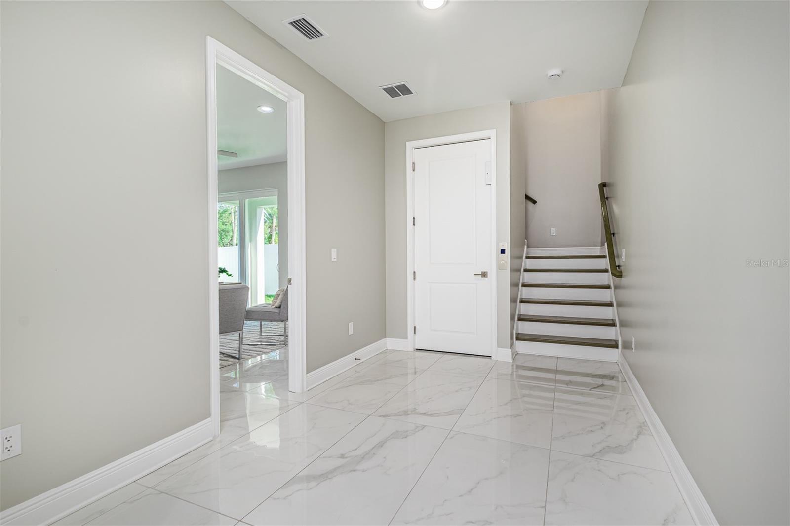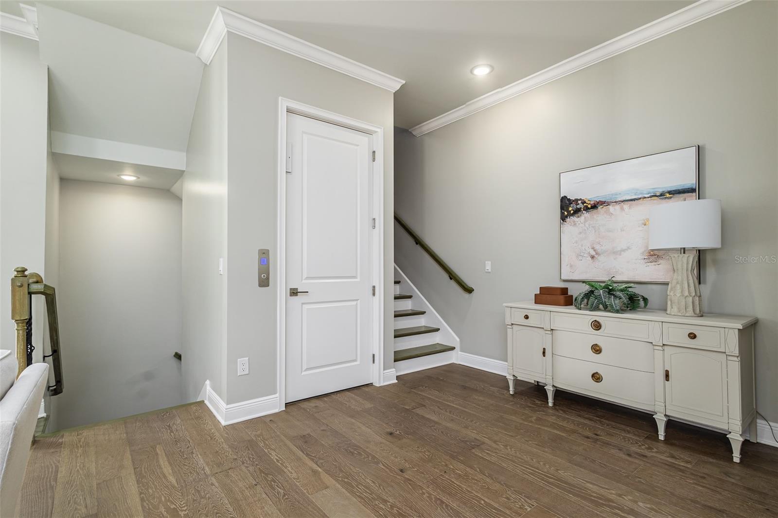 One or more photo(s) has been virtually staged. 2024 END UNIT LUXURY UPGRADED townhome with ELEVATOR that features a large private fenced in back yard with views of nature. This open spacious floor plan with 4 bedrooms (split plan) highlights an open dining/living/kitchen concept, tray ceilings, crown molding, luxury distresses engineered oak hardwood floors (NO CARPET), porcelain large tile, modern ceiling fans, upgraded plumbing & electrical fixtures, TV outlets and cable connections in all bedrooms, high ceilings and 8 ft high doors. Gourmet kitchen upgrades include gas cooktop, wall oven microwave combo, under cabinet lighting, elegant quartz countertops, large kitchen island with eat in kitchen space, wine rack with wine fridge and walk in pantry. Spacious primary suite bedroom includes walk- in closet, an additional closet, spacious bathroom with a dual vanity sink, luxury rainfall shower head and a free-standing tub with rainfall water faucet. First floor en-suite bedroom is great for in-laws or can be used for an office complete with its own bathroom and walk in closet. Interior floor designed with upgraded engineered hard wood floor in main living area, upstairs bedrooms and luxury tile in all wet areas. Home is complete with plenty of storage closets, tankless gas water heater and a two car garage. Enjoy wonderful view of nature from your upscale balcony or enjoy relaxing outside in your covered patio area or nice size fenced in back yard. Townhome community features a total of eight units. Finishes and layout are similar in each unit. Staged photos are from the model unit that sold. This LOW HOA fees and No Flood insurance required townhome is conveniently located near shopping malls, fine dining, sport venues, entertainment, MacDill AF base, airports and more. Growing neighborhood with lots of new construction.