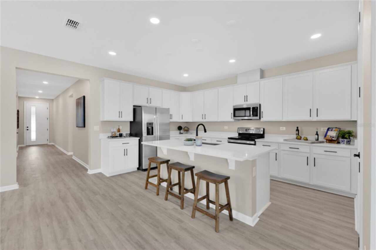 Under contract-accepting backup offers. ***Down payment and closing cost assistance may be available for qualified homebuyers! VA Assumable Loan for eligible buyers!*** What an incredible value—move in just in time for the holidays! Discover your dream home in this beautifully crafted, newer-construction residence on a premium lot in the heart of St. Cloud. This spacious single-story home offers 4 bedrooms, 3 full bathrooms, a 2-car garage, and 2, 077 sq. ft. of thoughtfully designed living space. At the front of the home, a private guest or in-law suite with its own en-suite bath provides a perfect retreat for visitors or multi-generational living. Step inside to find soaring 9-foot ceilings, 8-foot doors, and lovely luxury vinyl plank flooring throughout. The open-concept floor plan flows effortlessly from living to dining—ideal for both entertaining and everyday comfort. The modern kitchen is a chef’s delight, featuring 42-inch cabinets with stylish hardware, a walk-in pantry, quartz countertops, a central island, breakfast bar, and abundant prep and storage space. Retreat to the expansive primary suite, your private sanctuary complete with tranquil pond and fountain views. The spa-like en-suite bathroom offers a garden tub, separate walk-in shower, dual sinks, a private water closet, and a generous walk-in closet. Two additional bedrooms share a well-appointed third bathroom. Enjoy the Florida lifestyle with a screened front entryway, a screened-in lanai, and lush landscaping that enhances the home’s inviting curb appeal. The fully fenced backyard features serene water views through a decorative see-through vinyl fence—perfect for relaxing evenings or weekend gatherings. Located just a short stroll from community amenities—including a pool, two playgrounds, and scenic ponds—this home offers excellent value with low HOA fees and no CDD. Ideally situated with easy access to the Florida Turnpike and Highway 192, you’re minutes from shopping, dining, golf, and medical facilities. Conveniently located approximately 22–25 minutes from Medical City, Lake Nona, and Orlando International Airport, and within 30 minutes of major attractions like Walt Disney World, Universal Studios, and SeaWorld. Port Canaveral, Cocoa Beach, and Satellite Beach are just about an hour’s drive away.