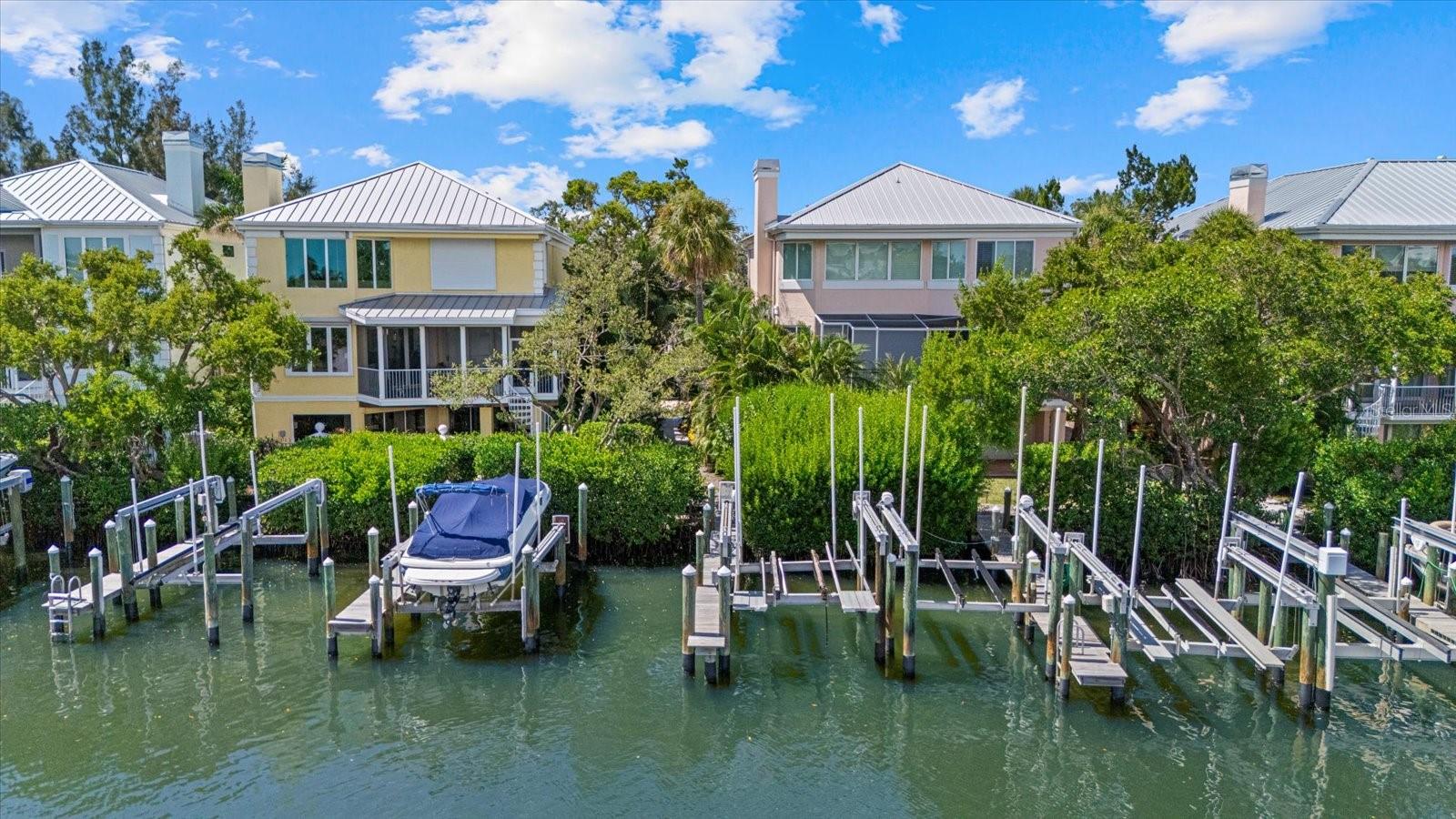 Enter a coastal residence where architectural vision, designer finishes and direct access to the water create an exceptional lifestyle on Siesta Key. In the gated waterfront community of Hamilton Club, this fully reimagined home includes a private deeded dock on deep water, offering instant access to the Intracoastal, Sarasota Bay and the Gulf. Inside, the renovation reflects thoughtful design and custom craftsmanship throughout. The great room makes a dramatic impression with 20-foot ceilings, a floor-to-ceiling quartz feature wall with fireplace, floating wet bar, and glass sliders opening to a screened balcony overlooking the pool and pond. The kitchen was completely redesigned with imported cabinetry, premium appliances by Miele, Bosch, GE and KitchenAid, granite counters, and lighting that elevates function and style. An oversized two-car garage with additional golf cart space and additional storage adds a level of convenience rarely found in a coastal property. The residence offers three en-suite bedrooms and a loft, including two separate primary suites. The main floor suite features its balcony and spa-style bath. Upstairs, the primary suite includes a custom fireplace accent wall, walk in closet, and a travertine wrapped bath with freestanding tub, glass enclosed shower and extensive cabinetry. A third guest suite and spacious loft with custom iron railing complete the upper level. On the ground floor, a large climate-controlled bonus room with a half-bath opens to the lanai and offers flexible space for recreation, hobbies or fitness. Impact-rated windows, custom railings, hardwood floors, Nest thermostats, and central vac contribute to a lock and leave lifestyle with comfort of a single-family home. Hamilton Club is a private enclave of just 18 residences with a heated pool and tennis court, minutes from Siesta Village, Shell Road beach access and sugar sand shoreline of Siesta Beach. This is a rare opportunity to enjoy boating, privacy and elegant coastal living in an intimate, gated setting.