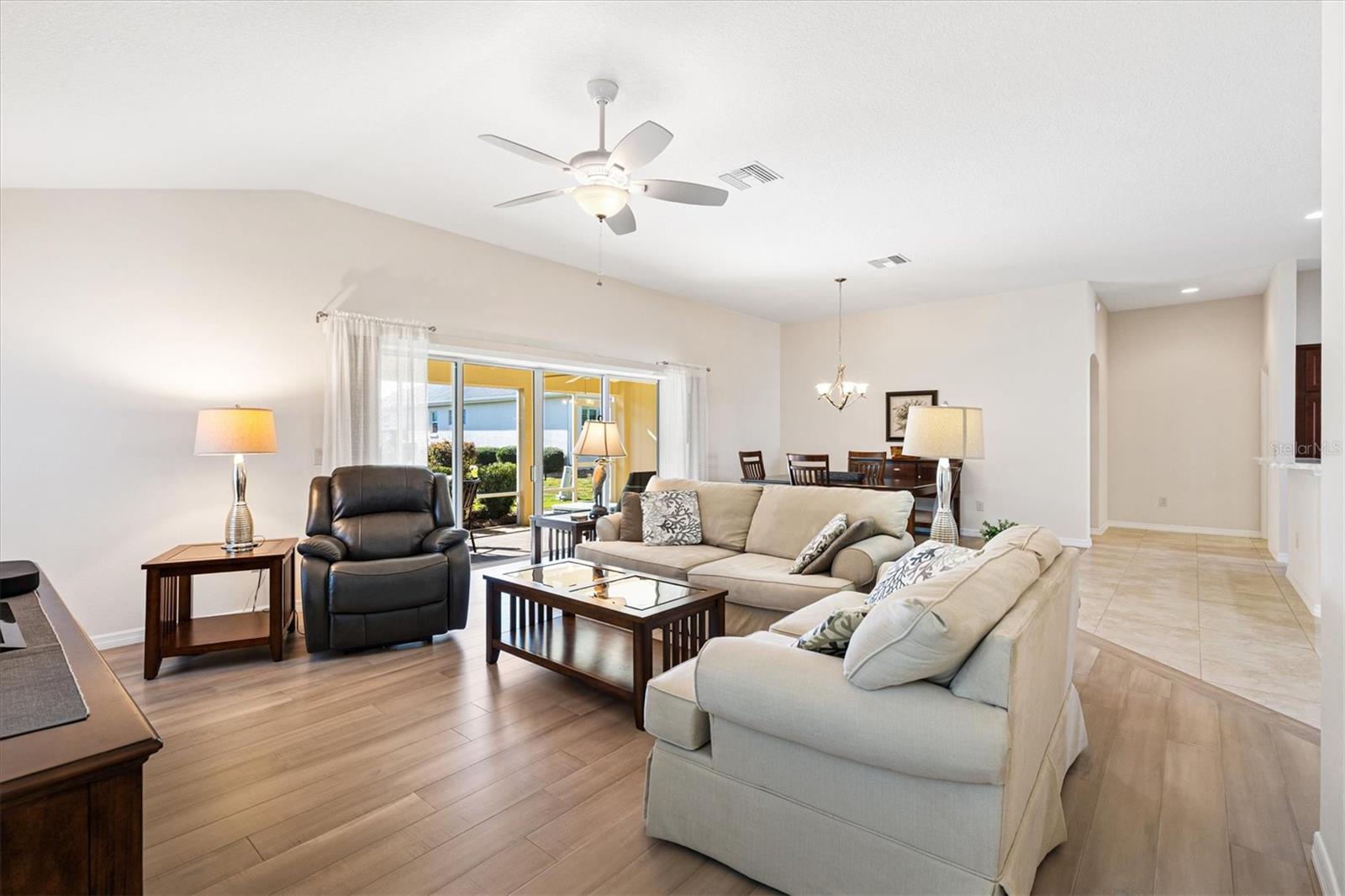 >Nestled in VILLAGE OF LAKE DEATON, this lovely home has great curb appeal with Florida plants and a peek-a-boo of the pond. Step inside to an OPEN CONCEPT floor plan with CERAMIC TILE flooring in the kitchen and wet areas with BEAUTIFUL ENGINEERED HARDWOOD FLOORING throughout the rest of the home! NO TRANSITION STRIP between tile and engineered hardwood flooring. The kitchen has stair stepped cabinetry, high definition laminate counters and STAINLESS STEEL appliances (NEW OVEN). The dining and living room open out to a 27 x 10 screened lanai. The spacious primary suite has 2 WALK-IN closets an EN-SUITE bath w/a tiled ROMAN SHOWER, dual vanities and a separate water closet. The guest bedrooms are on the other side of the home and have a shared guest bath with laminate countertops and a tub/shower combo. LAKE DEATON is one of The Villages most sought-after locations, situated just north of Highway 44 and close to BROWNWOOD PADDOCK SQUARE, where you’ll enjoy GOLF, shopping, dining, and nightly ENTERTAINMENT. This home has been meticulously maintained and barely lived in....Don't walk....RUN...Make your appointment to see this home today! Roof (2014) HVAC (2014) Water Heater (2014). Bond balance is $16, 850.14.RATIO Current Price By Calculated SqFt