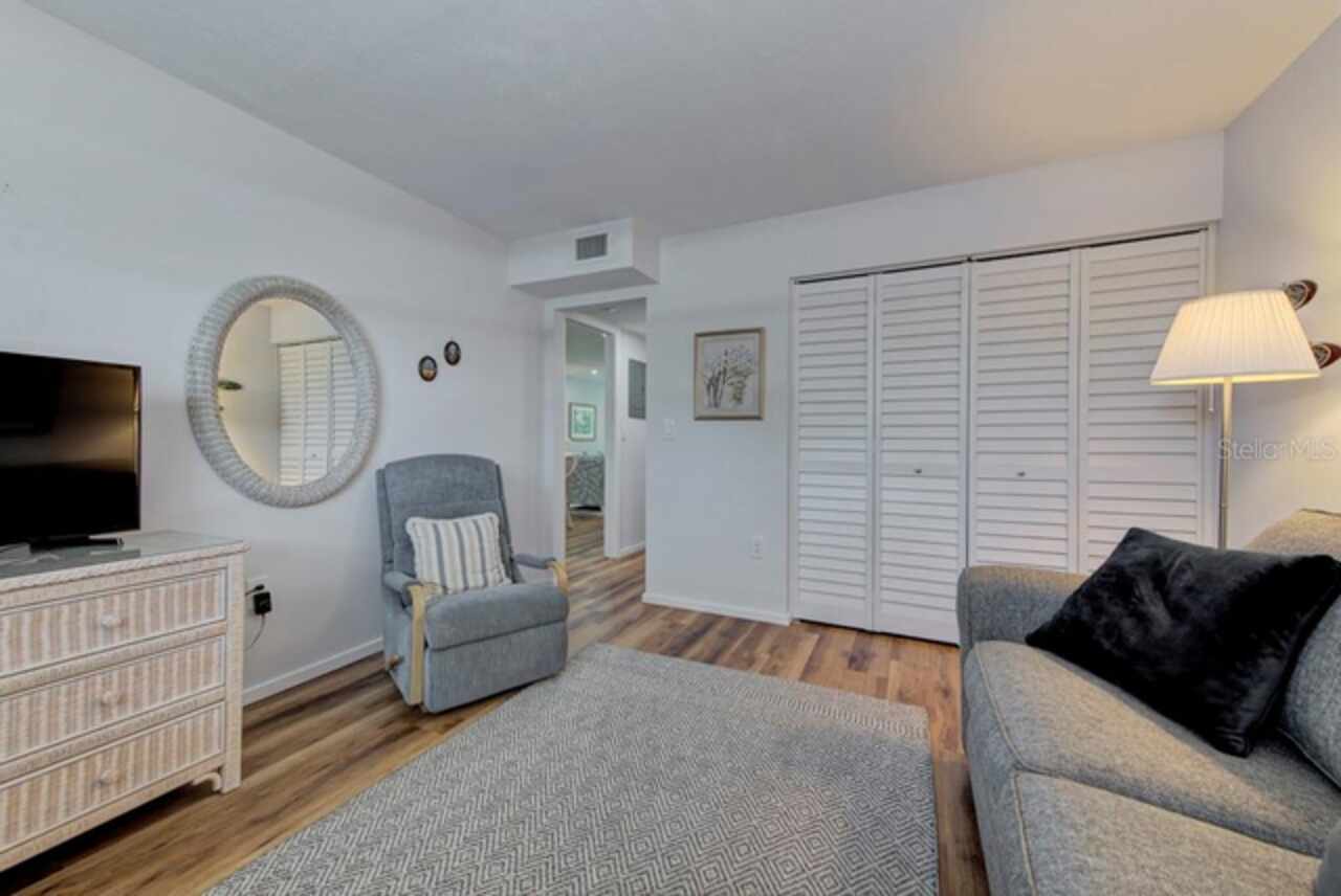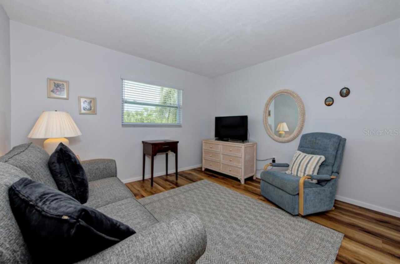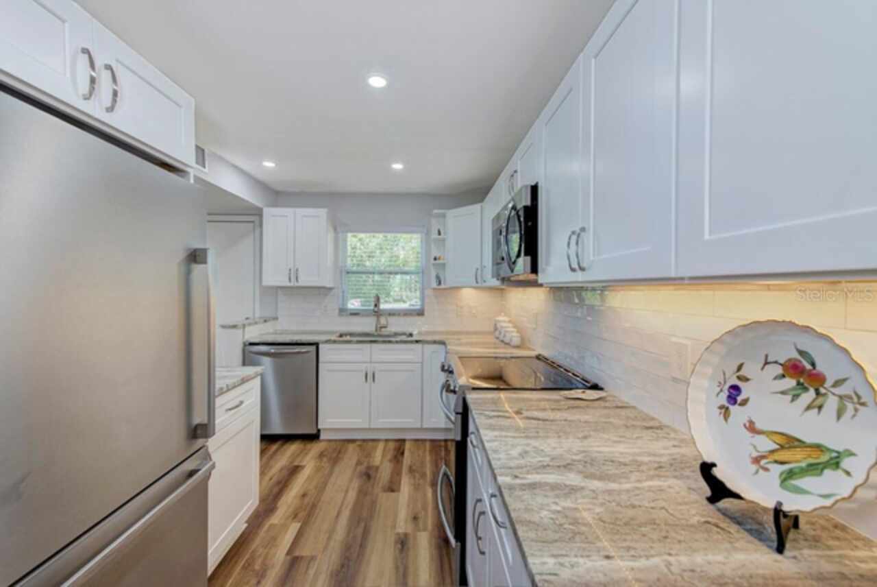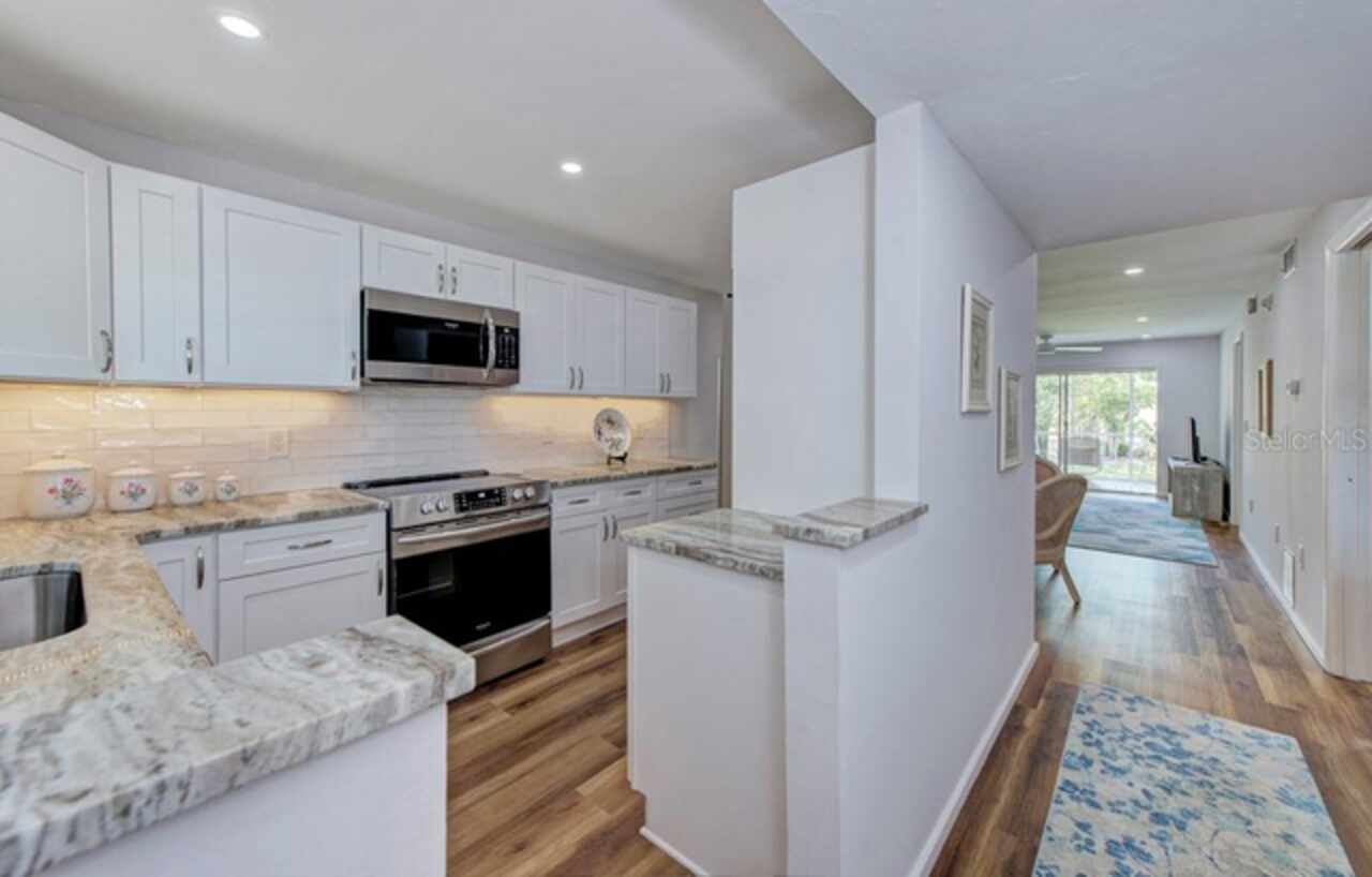 Under $200, 000 in Sarasota!! Newly renovated 2/2 second floor condo facing the pool and greenbelt for wonderful privacy and views. Almost 1, 000 square feet with new luxury vinyl flooring throughout. Quartz countertops in both baths and kitchen, new subway tile backsplash and in showers. Interior impact windows, recessed lighting with new electrical panel, all new stainless steel appliances including Bosch stackable washer and dryer. Enjoy a tiled and glassed in peaceful lanai. Save money, there is no need to own a car. Location is walkable to public transportation, restaurant, Publix, shopping, Starbucks and more. And, it is minutes to a golf course and the beautiful beaches. All buildings have elevators, and this 55 plus friendly community boasts a beautiful swimming pool, gas grills and clubhouse. HOA fees include grounds maintenance, private road, Internet and cable t.v., sewer, trash and water. AC 2016 and Water Heater 2017. New Roof - 2021 and no assessments.