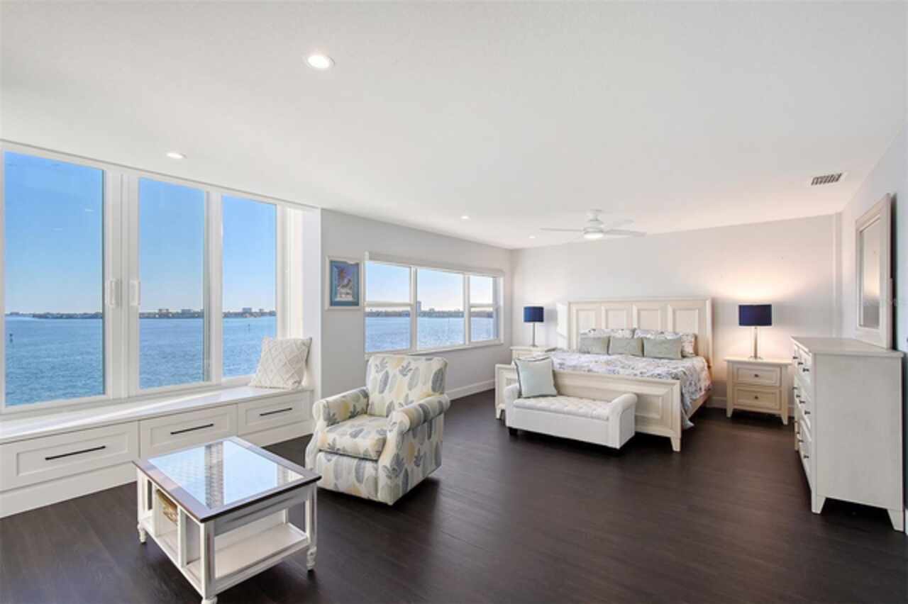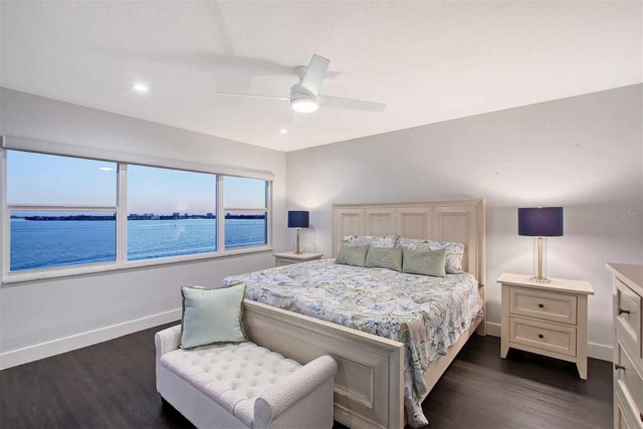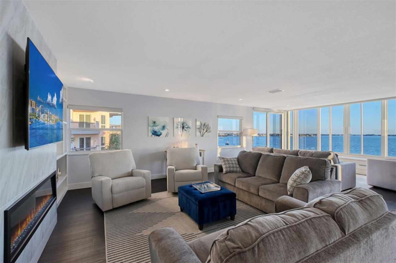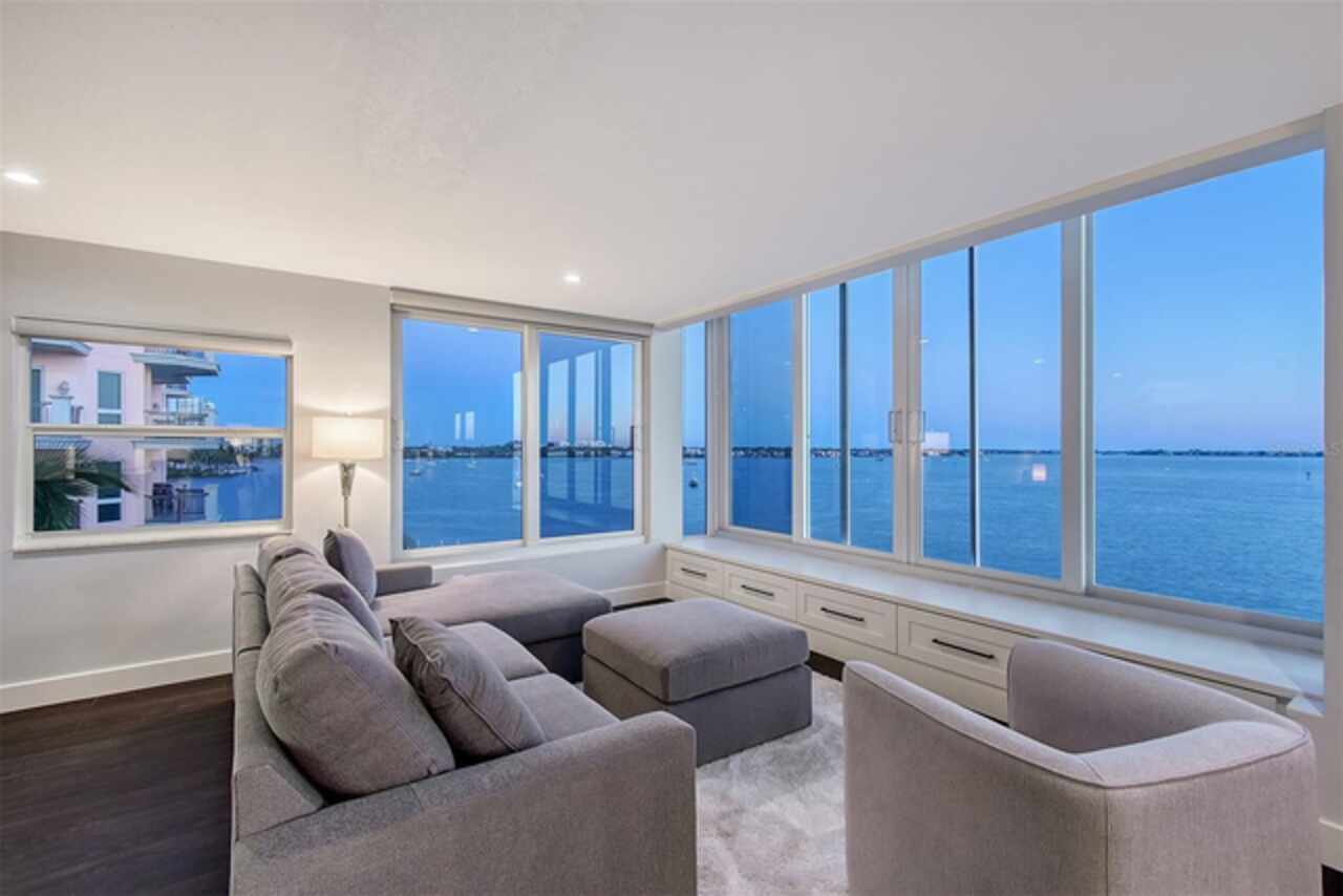One of the most unique waterfront penthouses on Golden Gate Point in downtown Sarasota, this fully renovated condo was combined from two units and designed with an open floor plan to maximize the best views in the community. At the tip of Golden Gate Point, you will enjoy 180-degree panoramic views from the city to the marina, to the Ringling Bridge with sunrises, sunsets, marine life and boating activity. With nearly 3, 000 square feet and 75 linear feet of living space, there is plenty of room for relaxing or entertaining while enjoying the amazing views of the bay from the floor-to-ceiling windows. With three bedrooms and three-and-a-half baths, this is the condominium for families or for hosting guests. The main bedroom suite features waterfront views and includes a large closet with built-ins and an upgraded bath with dual vanities, soaking tub and shower. The gourmet kitchen features an expansive granite island with Bosch appliances and looks out toward the dining area with windows providing endless water views. A split floor plan, the other side of the condominium features an en-suite bedroom, second guest bedroom, full bath, half bath, laundry and utility room. The spacious front porch is a great place to enjoy the outside with convenient access to the elevator. Two parking spaces with a storage closet come with this condominium and are conveniently under the building. The location doesn't get much better than this, just a few minutes to Marina Jacks and downtown Sarasota and less than 10 minutes to St. Armands Circle and Lido Beach. Don't miss this opportunity to own a one-of-a-kind modern renovated condominium with some of the best views on Golden Gate Point.