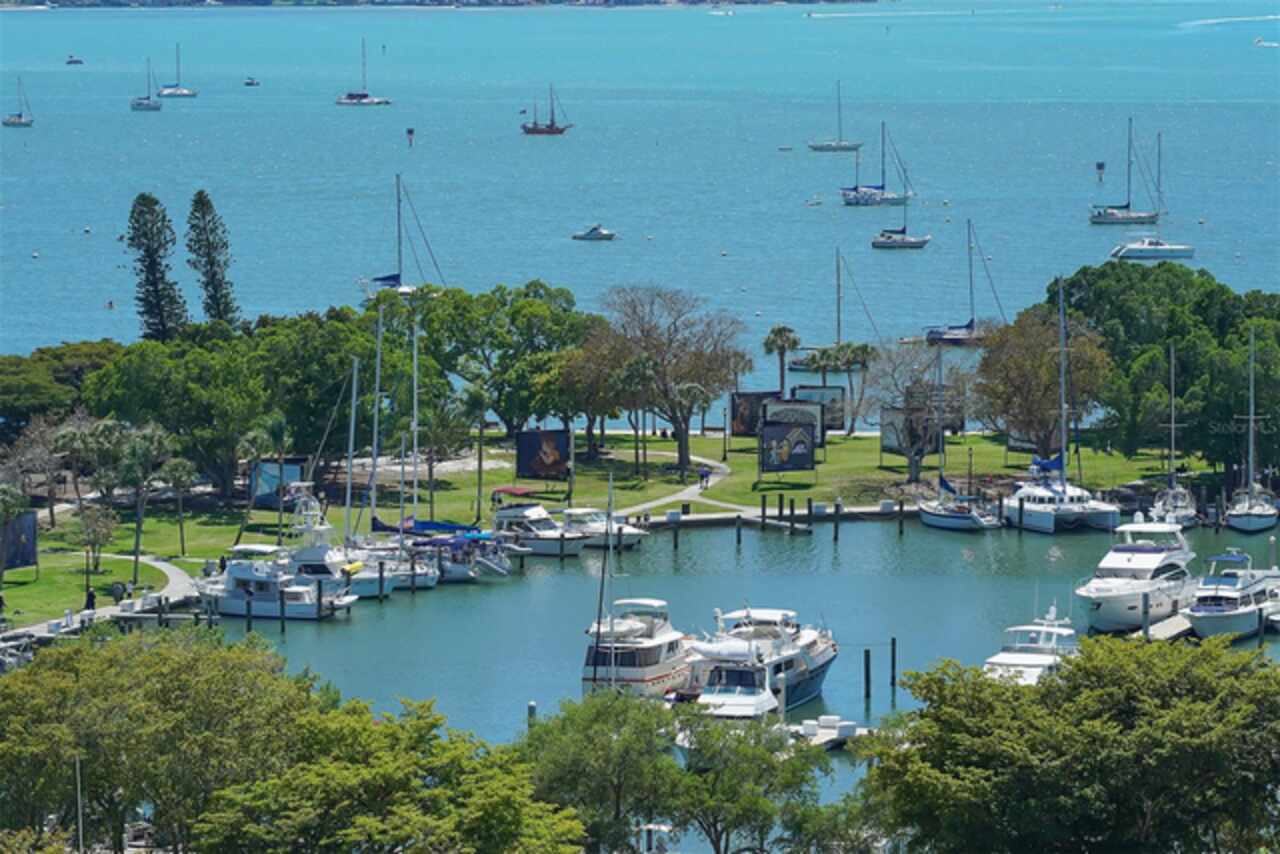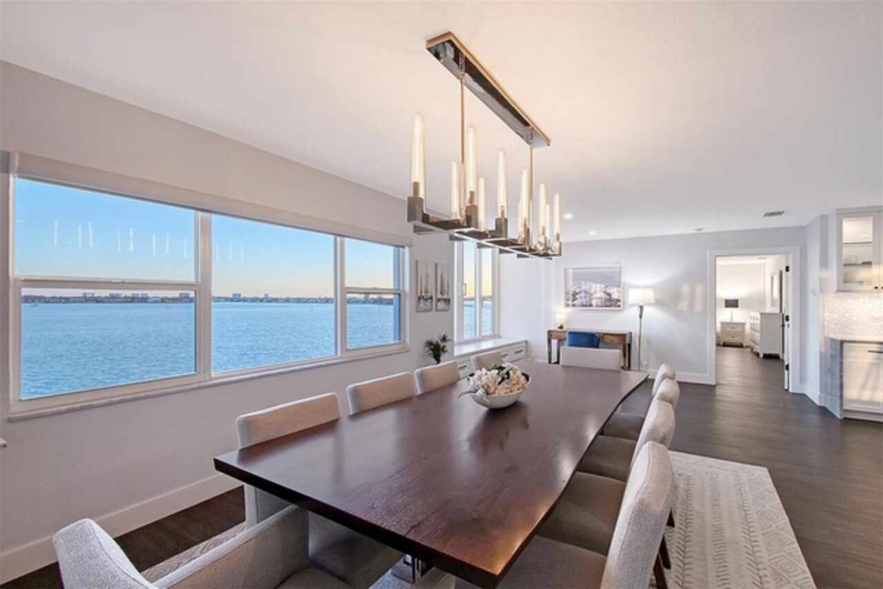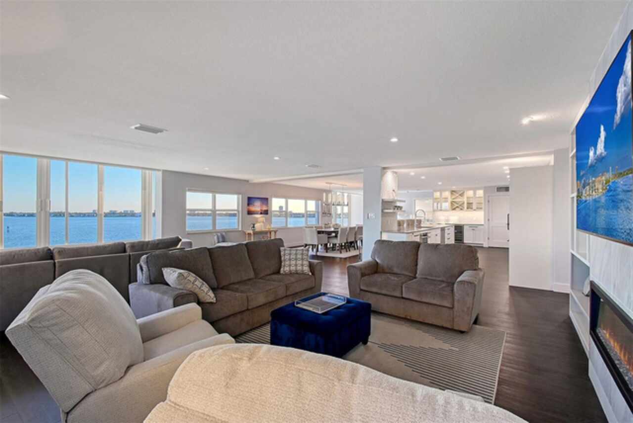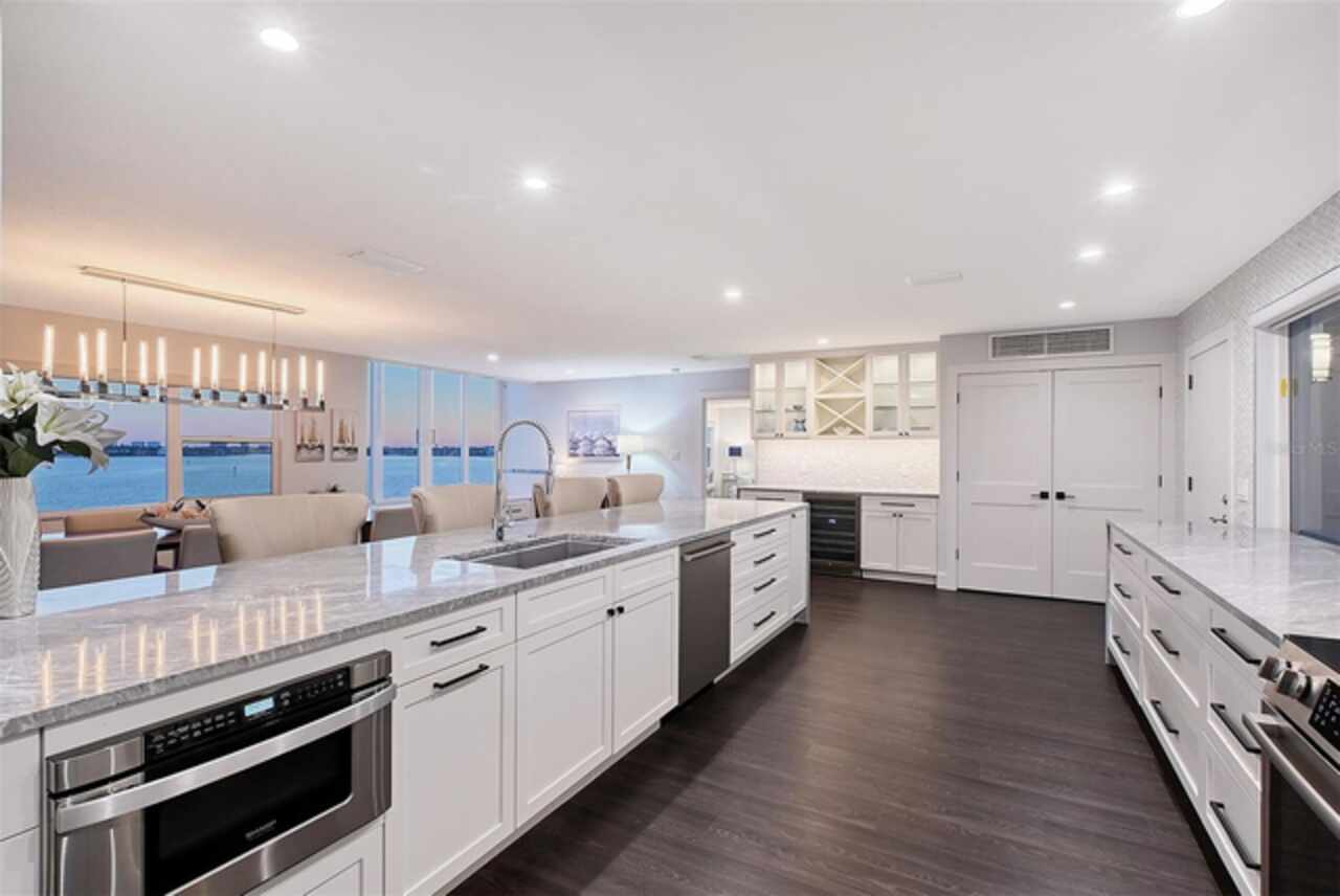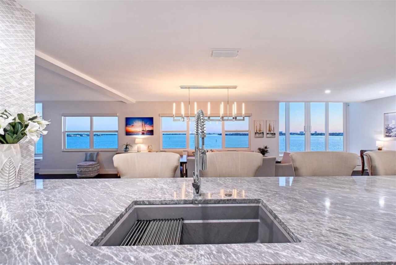One of the most unique waterfront penthouses on Golden Gate Point in downtown Sarasota, this fully renovated condo was combined from two units and designed with an open floor plan to maximize the best views in the community. At the tip of Golden Gate Point, you will enjoy 180-degree panoramic views from the city to the marina, to the Ringling Bridge with sunrises, sunsets, marine life and boating activity. With nearly 3, 000 square feet and 75 linear feet of living space, there is plenty of room for relaxing or entertaining while enjoying the amazing views of the bay from the floor-to-ceiling windows. With three bedrooms and three-and-a-half baths, this is the condominium for families or for hosting guests. The main bedroom suite features waterfront views and includes a large closet with built-ins and an upgraded bath with dual vanities, soaking tub and shower. The gourmet kitchen features an expansive granite island with Bosch appliances and looks out toward the dining area with windows providing endless water views. A split floor plan, the other side of the condominium features an en-suite bedroom, second guest bedroom, full bath, half bath, laundry and utility room. The spacious front porch is a great place to enjoy the outside with convenient access to the elevator. Two parking spaces with a storage closet come with this condominium and are conveniently under the building. The location doesn't get much better than this, just a few minutes to Marina Jacks and downtown Sarasota and less than 10 minutes to St. Armands Circle and Lido Beach. Don't miss this opportunity to own a one-of-a-kind modern renovated condominium with some of the best views on Golden Gate Point.