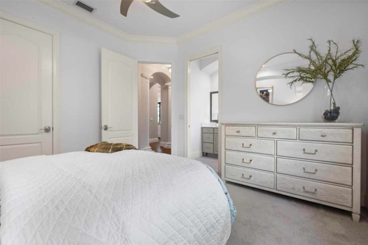 Ceiling Fans(s), Central Vaccum, Crown Molding, Eat-in Kitchen, High Ceilings, In Wall Pest System, Open Floorplan, Primary Bedroom Main Floor, Solid Wood Cabinets, Split Bedroom, Stone Counters, Thermostat