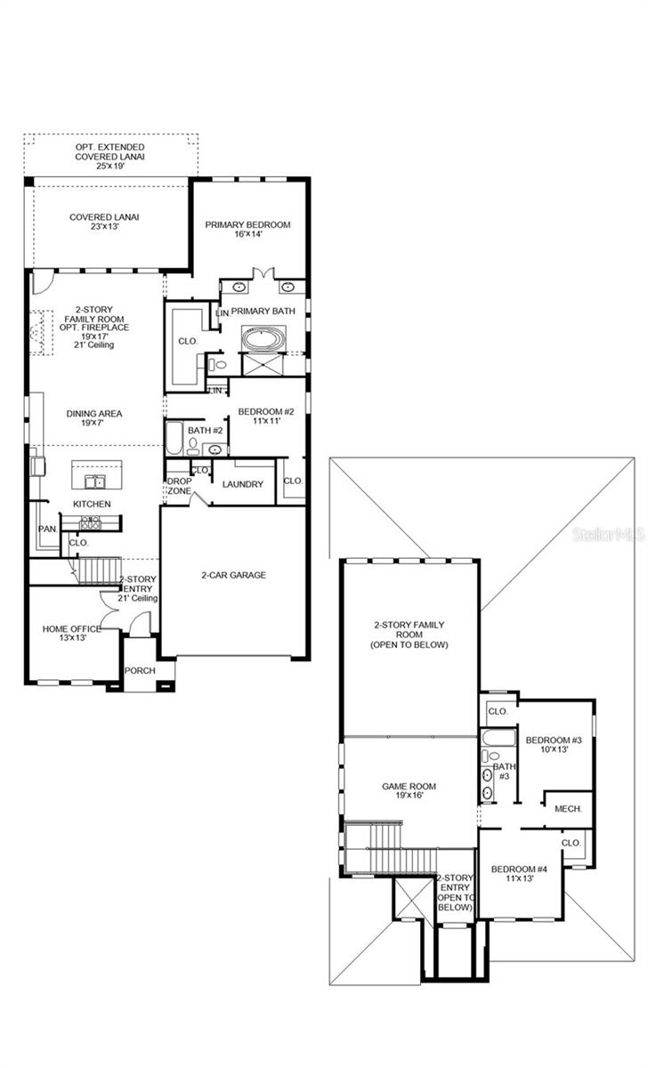 Under Construction. Front porch opens into a two-story entryway that is embraced by French doors that welcome you into the secluded home office. Past the staircase you enter the kitchen space which features an island with built-in seating and an oversized walk-in pantry. The dining area connects the space to the family room with extended ceilings and a sliding glass door that gives access to the backyard covered lanai. The primary bedrooms boasts three large windows. Double doors lead into the primary bathroom which features dual vanities, a freestanding tub, glass enclosed shower, and large walk-in closet. A secluded guest suite with a full bathroom is located across the dining area. Upstairs you are greeted by a large game room overlooking the first floor. Two secondary bedrooms and a full bathroom complete the second level. Ample storage space throughout the home along with a conveniently located laundry room off the drop zone. Two-car garage.