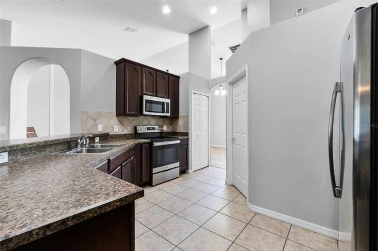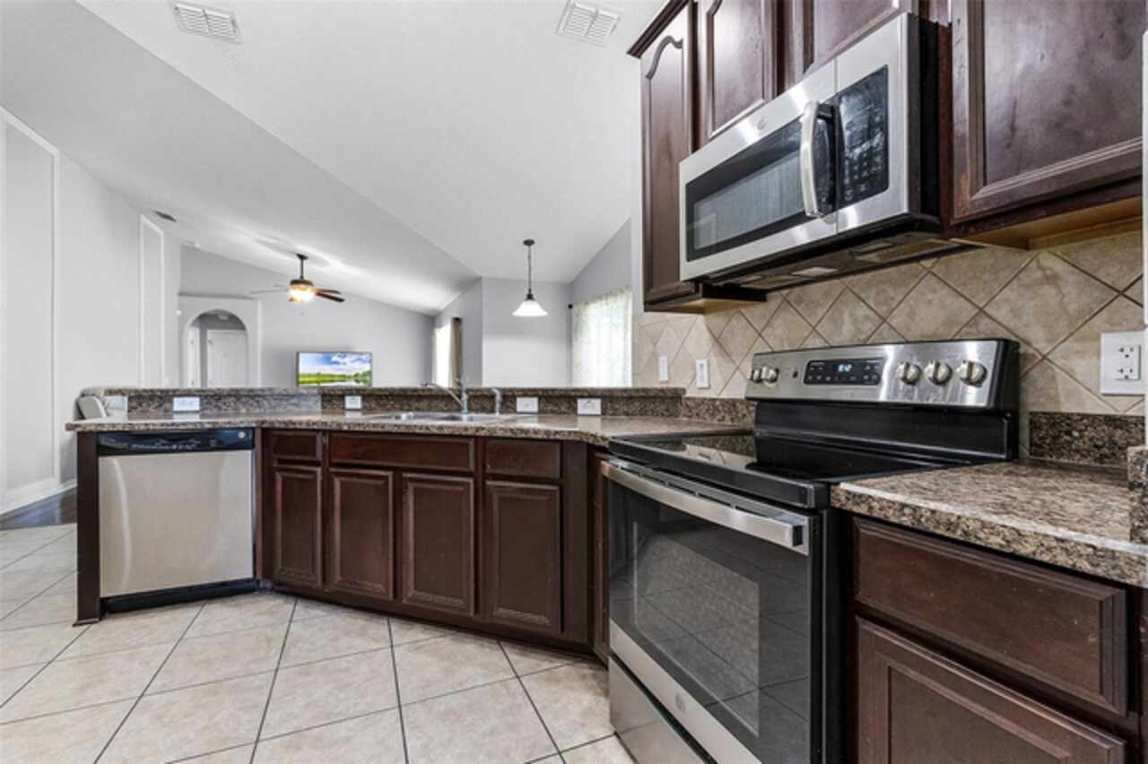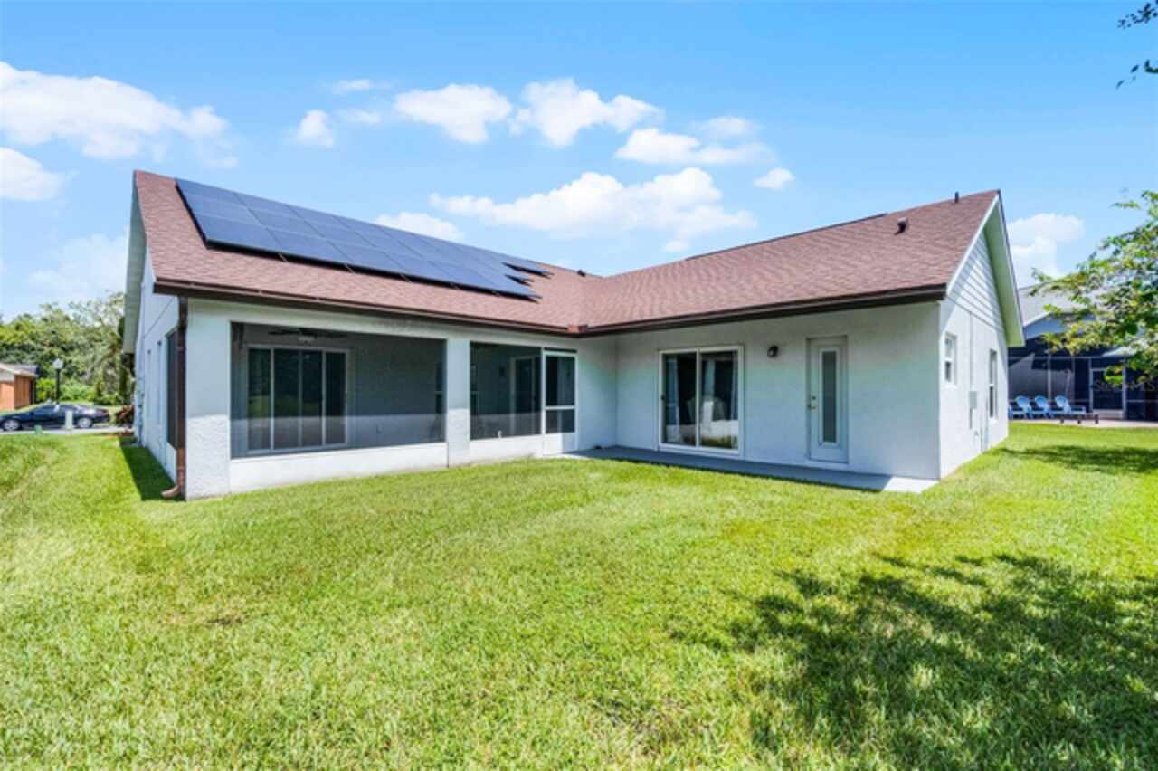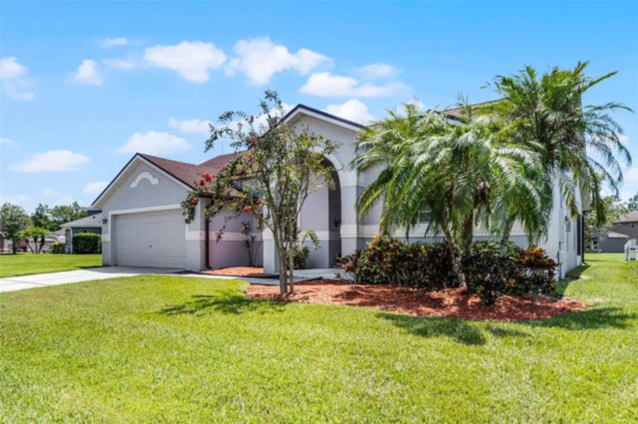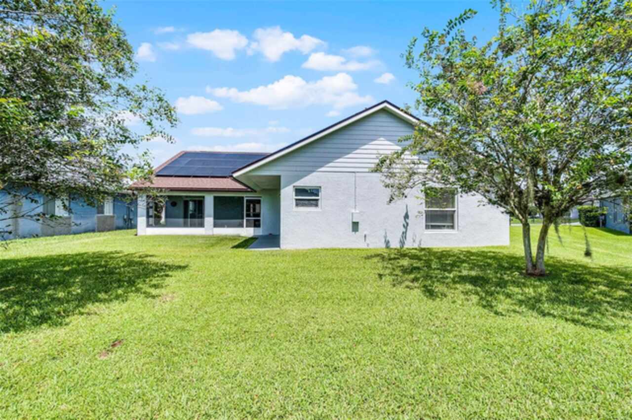 Amazingly Updated Bathrooms! Fully paid off solar! New roof in 2023! HVAC- 2021! New tankless water heater- 2024! Newly installed insulation and gutters. Welcome to this turn-key 4 bedroom, 3 bathroom, 2-car garage home. Step inside, into the foyer with vaulted ceiling and into your dining room which flows into your living room. As you walk past the dining room, you will be greeted by the kitchen which features stainless steel appliances and a beautiful cherry wood cabinets. The family room and breakfast nook are off of the kitchen, making it the perfect home for entertaining. A split floorpan is ideal and offers a private retreat for you and your family or guests. Step into your primary suite with sliding glass doors that lead out to your covered lanai, vaulted ceilings, and an ensuite bathroom with dual sinks, an elegant freestanding tub, and a beautifully renovated, walk-in shower. On the opposite side of the home, you will find the 3 additional bedrooms, and two freshly renovated bathrooms. Step outside onto your covered and screen-enclosed outdoor lanai and enjoy the beautiful views of the pond. The spacious backyard is a great addition and offers plenty of space for play and entertainment. The paid off solar allows for very low electric bills and is energy efficient! Sellers are also providing a home warranty plan for 1 year! Within the Indian Lakes community, you will find a large outdoor pool with public restrooms, a tennis court, sidewalks throughout, and a shaded playground area. In close proximity to Florida’s Turnpike for easy commutes and only 35 minute drive to Disney, 30 minute drive to Universal, this home is in an ideal location. Make this move-in ready home your forever home! Schedule a showing today!