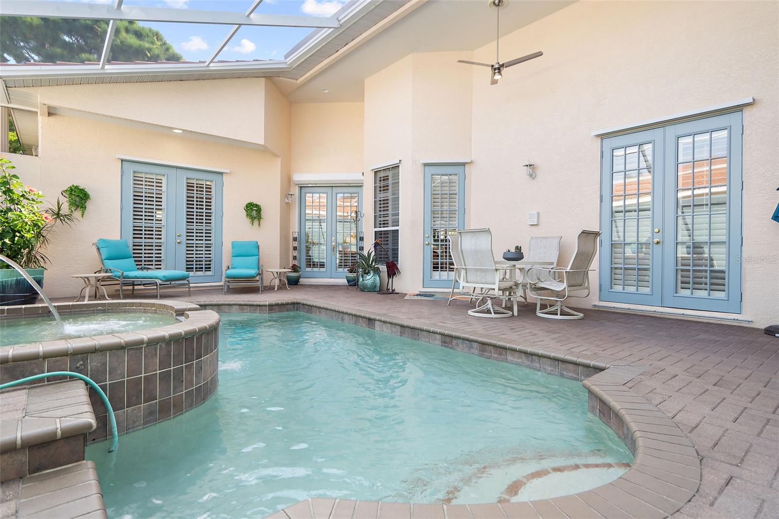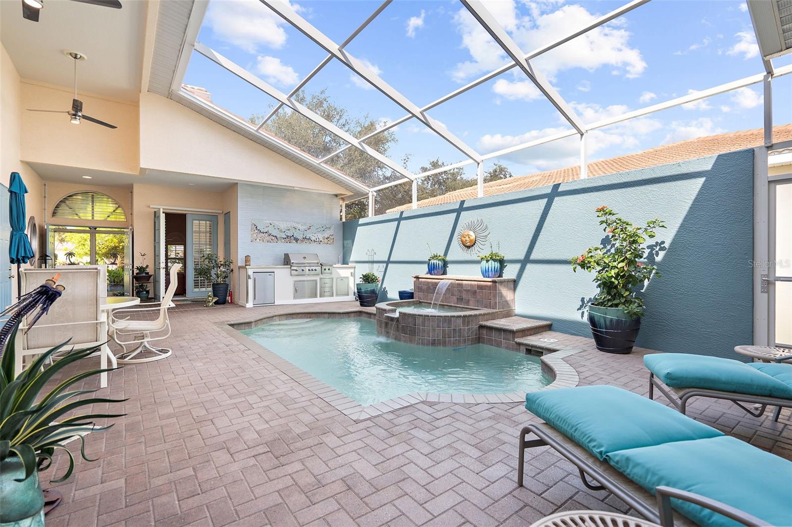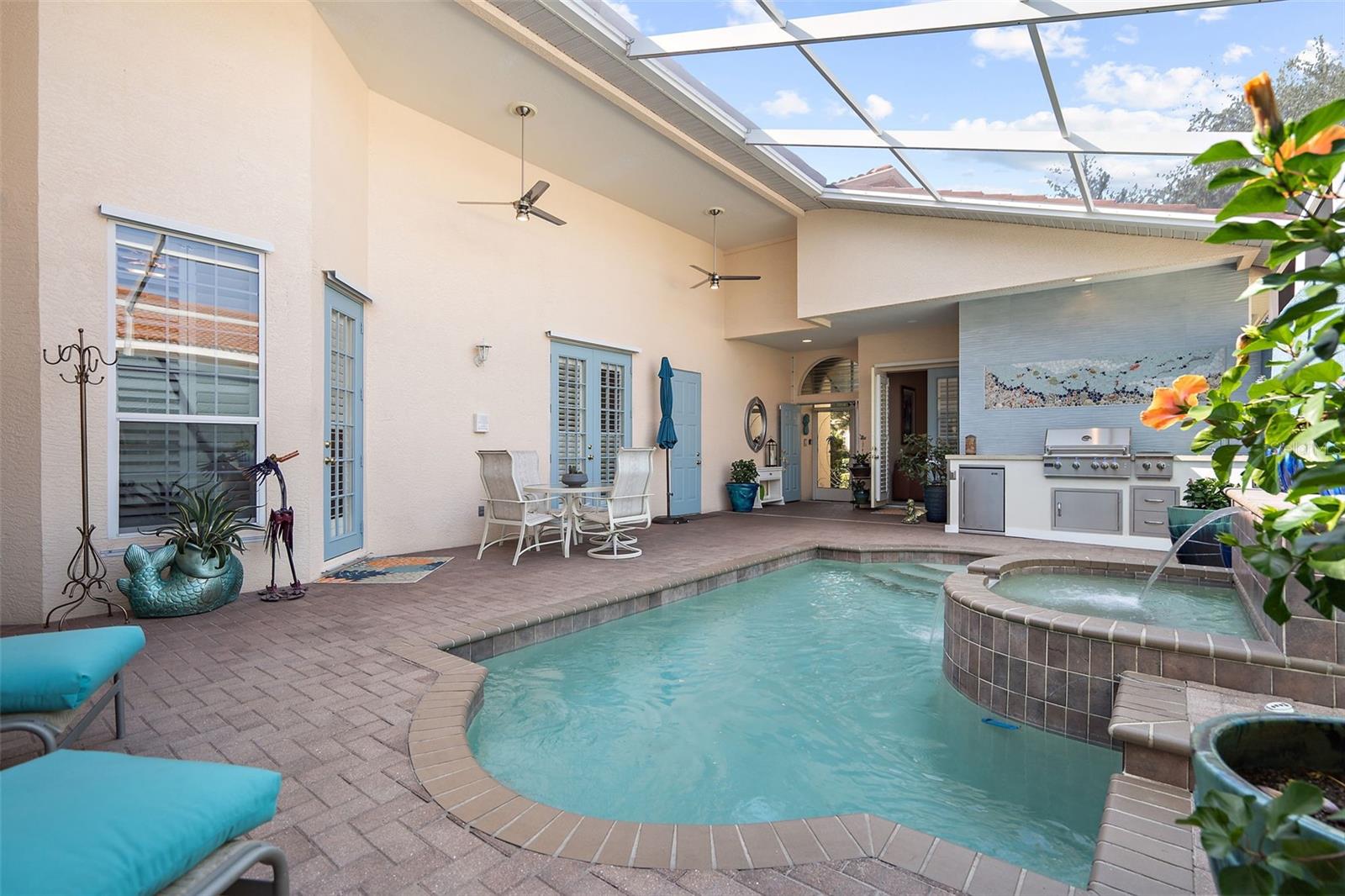New Roof! Seize the chance to own a home on one of the higher elevations on Venice Island! You’ll be greeted with lush bright tropical landscaping as you walk through the front door of the screened entryway. Step inside to find an incredible courtyard featuring a waterfall pool with spa and an outdoor kitchen with a backdrop of a custom coastal-designed tiled wall. Within this fabulous outdoor paradise, you will discover a unique separate Casita, perfect for guests or use as a private office or studio, complete with its own bathroom and dual closets. Continue through the courtyard to the main entrance, leading you into an open floorplan living area with high tray ceilings. What an amazingly well-taken care of home! Here, the Living and Dining Rooms, Kitchen, and Dinette flow together seamlessly, ideal for entertaining and everyday living. The very spacious upgraded Kitchen will surprise you with a wine fridge, gas range, and beautiful granite countertops. The solid wood cabinetry has pullout drawers and spice rack. This split bedroom design will find the spacious Primary Suite to the left, while the Guest Bedroom, Bath, and Laundry are conveniently located to your right. This one-owner home is filled with special extras at every turn. Tile and new luxury plank flooring will be seen throughout. Stylish crown molding at the ceilings and plantation shutters on the windows. A home that is truly special and unique, offering a blend of luxury and comfort in every detail. Water heater Fall 2024, Pool heater Summer 2025. Bellagio is a gated community of 144 single-family, maintenance-free Mediterranean-style homes located at one of the highest points on the island and set within mature, beautiful tropical landscapes. Desirable amenities include a clubhouse, pool, and tennis courts. You will feel like you’re living a life of ease and luxury. Enjoy direct access to the Venetian Waterway Park, which runs along the Intracoastal Waterway. Here on Historic Venice Island, you’ll find Publix, Walgreens, and a hardware store, along with a multitude of small independent retail businesses, art, theatre, restaurants, and nightlife. Attend one of the many events at the Venice Airport Festival Grounds, visit Brohard Dog Paw Park for your four-legged friends, hunt for shark teeth at Casperson Beach, or explore the Venice Fishing Pier after dining at Sharky’s or Fins on the Gulf of Mexico.