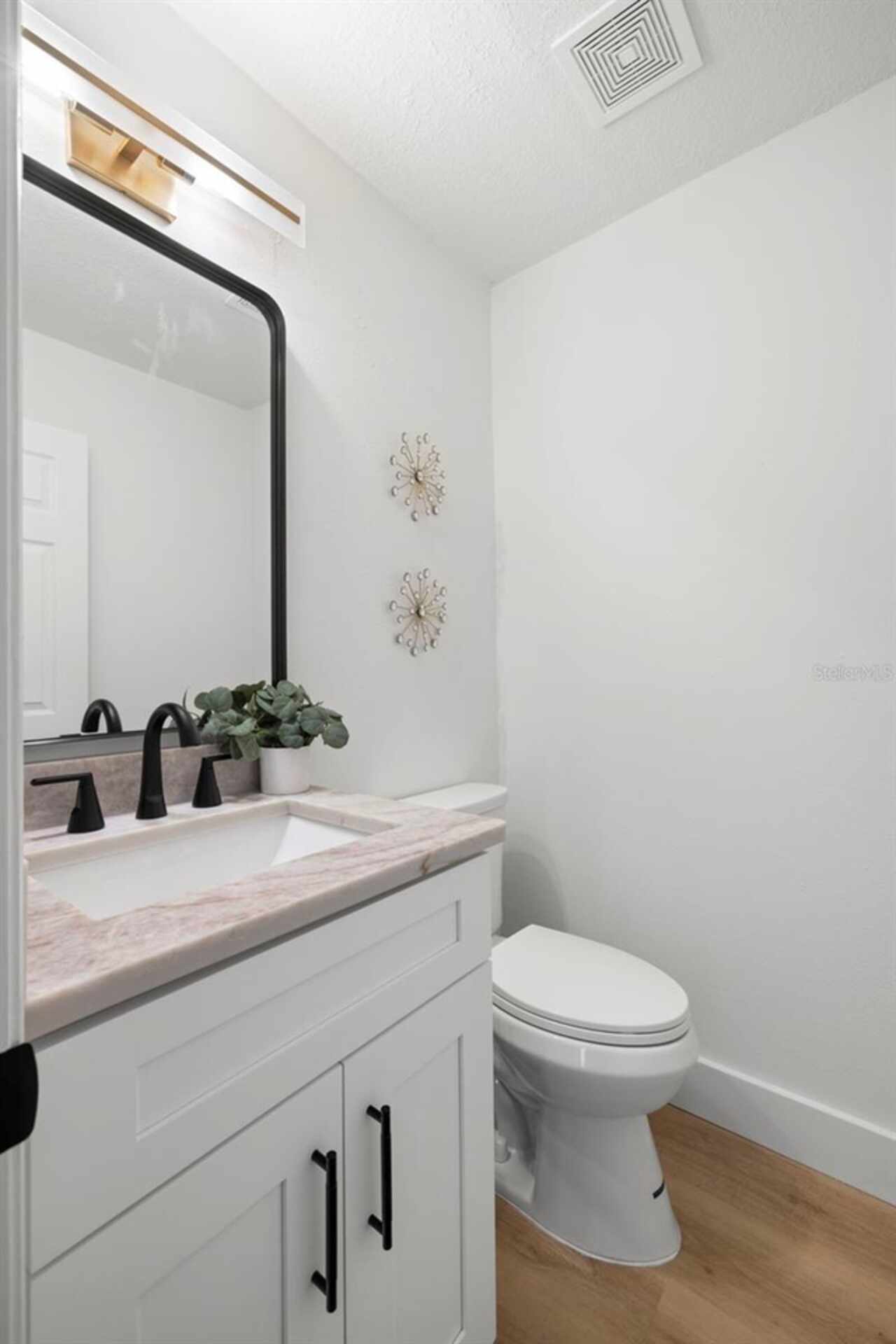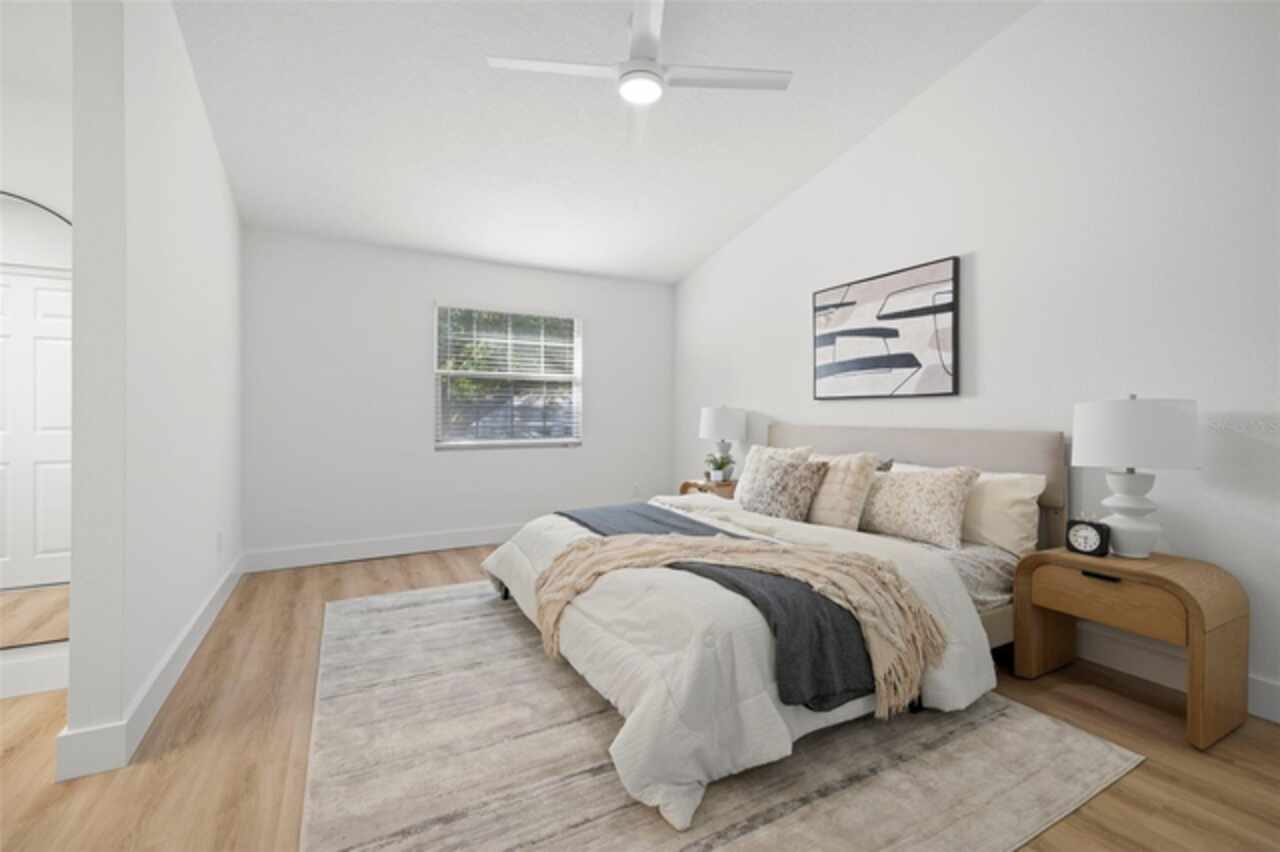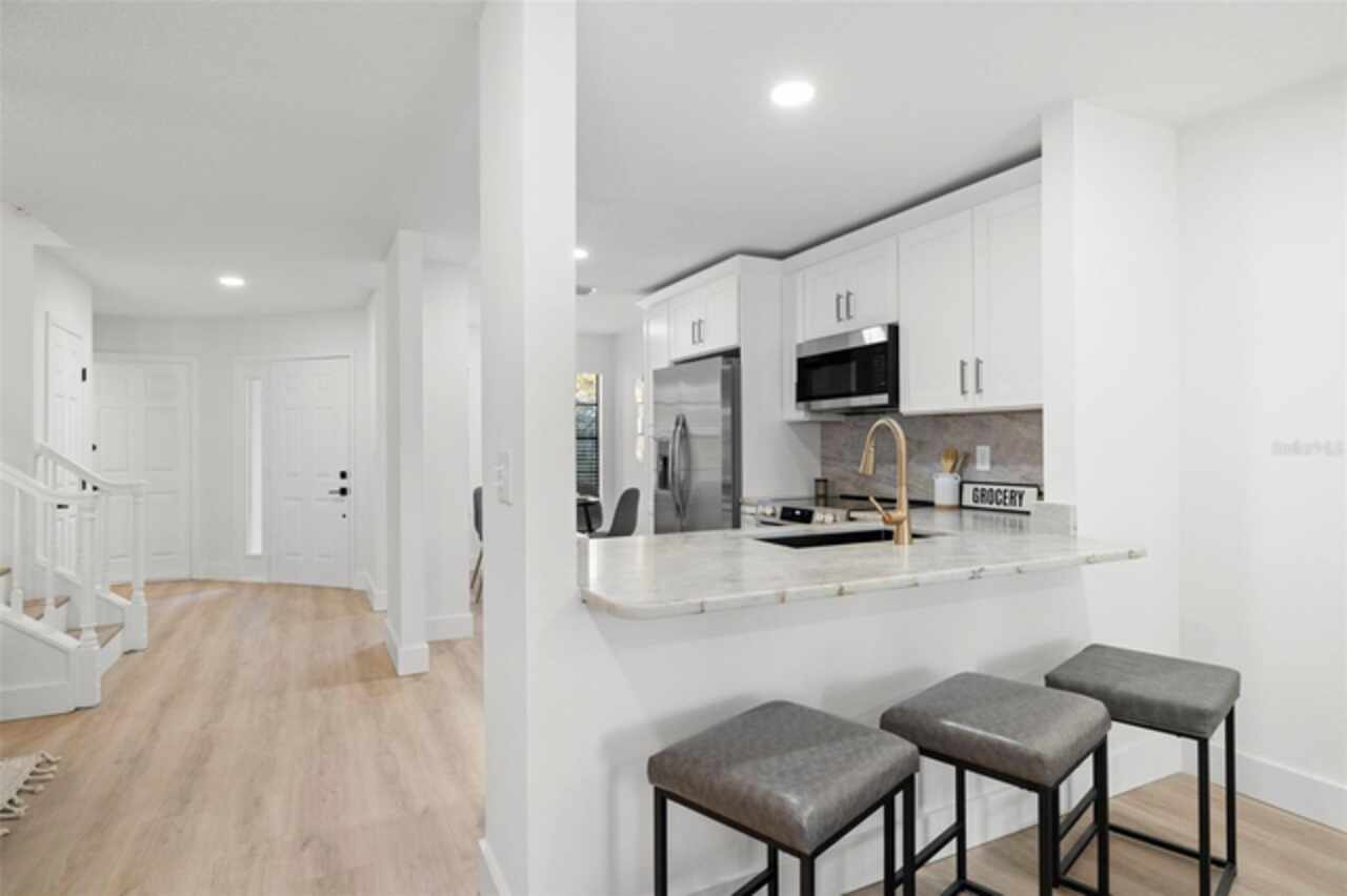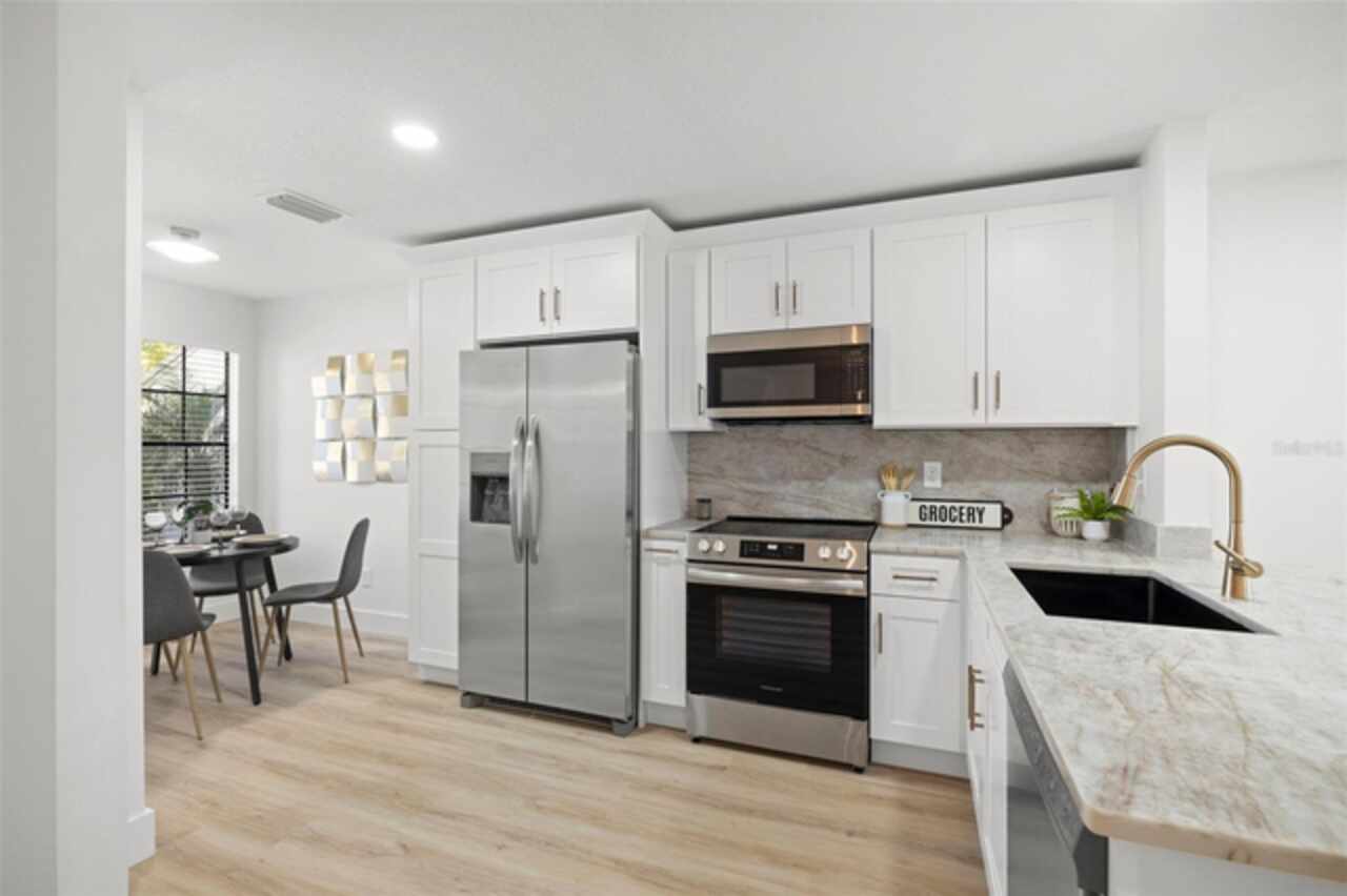 Welcome to your dream home! This beautifully fully remodeled 2-bedroom, 2.5-bathroom townhome in the highly sought-after Brentwood Park community is a true gem. As you approach the townhouse, you'll be greeted by a charming turfed courtyard, creating an inviting first impression. Step inside to discover a modern kitchen designed for both style and functionality, featuring elegant quartz countertops, crisp white cabinets with ample storage, stainless steel appliances, and completed with a cozy breakfast nook. The kitchen seamlessly connects to the dining room and inviting living area, creating the perfect space for entertaining. Retreat to the upstairs master suite, where vaulted ceilings and a spacious walk-in closet with built-ins provide a luxurious feel. The en suite bathroom boasts dual sinks and a standalone shower, offering a serene escape. You’ll find two additional guest bedrooms and a well-appointed guest bathroom upstairs as well, ensuring comfort for family and friends. The 2nd guest bedroom can easily double as an office or media room if needed. The main level features a convenient powder bathroom, while two sets of French doors lead from the living room to a screened-in patio overlooking a tranquil pond—ideal for enjoying morning coffee or evening sunsets. Additional highlights include a one-car garage, luxury vinyl flooring throughout, fresh interior paint, a brand-new water heater, and stylish new lighting and fans. Don’t miss the opportunity to make this exquisite townhome yours! Schedule a showing today and experience the perfect blend of modern living and serene surroundings.