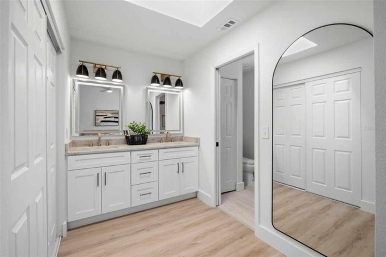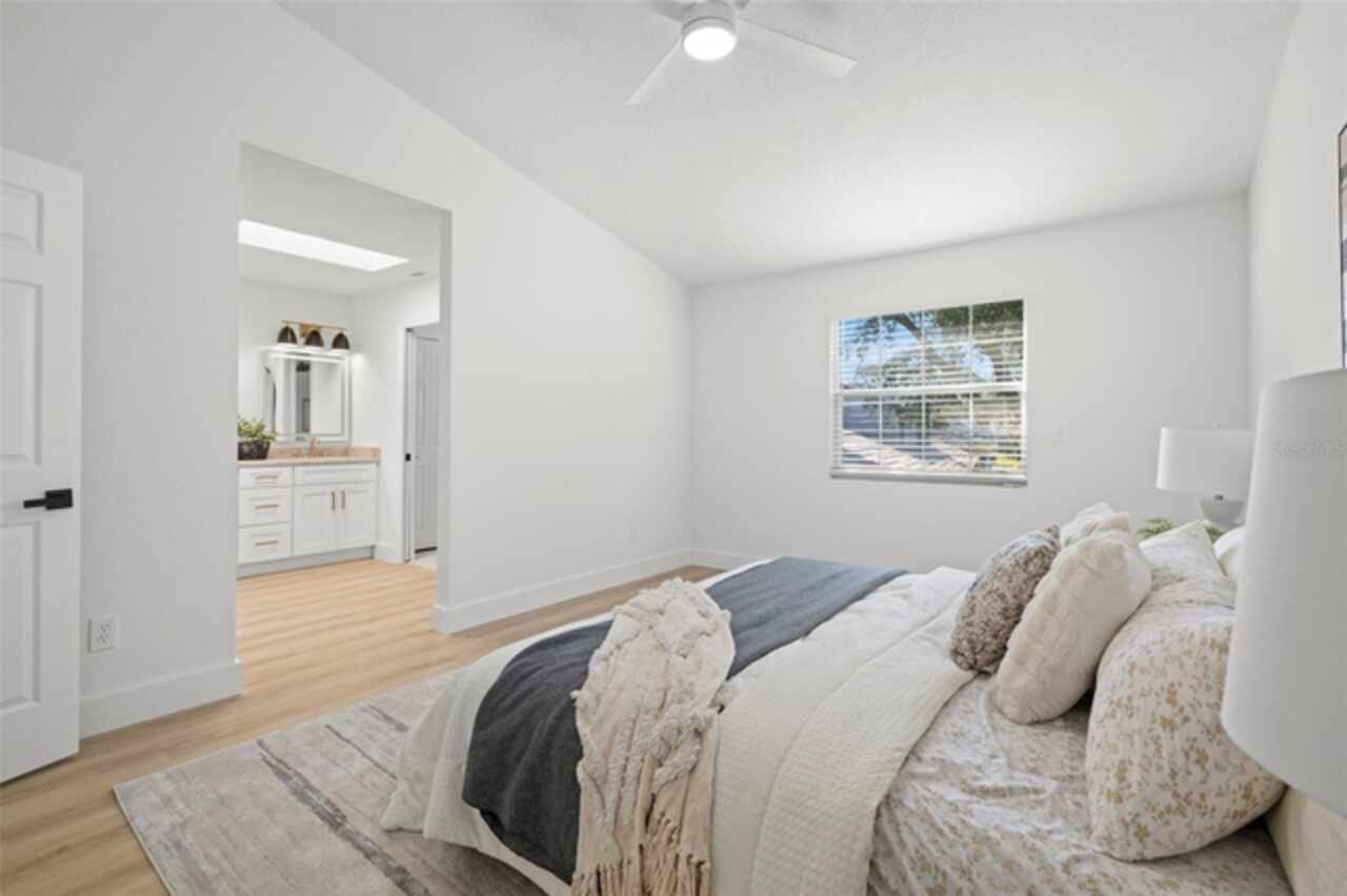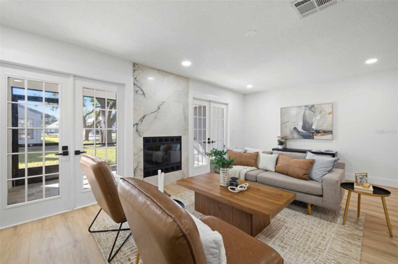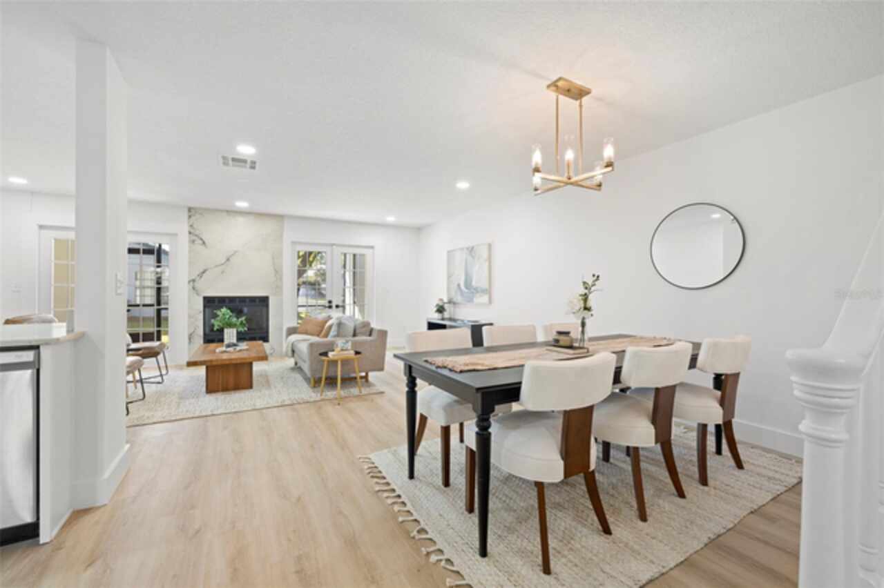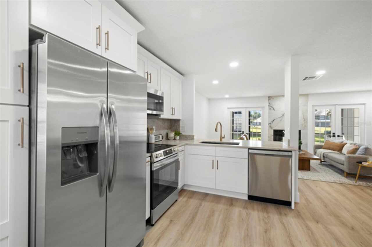 Welcome to your dream home! This beautifully fully remodeled 2-bedroom, 2.5-bathroom townhome in the highly sought-after Brentwood Park community is a true gem. As you approach the townhouse, you'll be greeted by a charming turfed courtyard, creating an inviting first impression. Step inside to discover a modern kitchen designed for both style and functionality, featuring elegant quartz countertops, crisp white cabinets with ample storage, stainless steel appliances, and completed with a cozy breakfast nook. The kitchen seamlessly connects to the dining room and inviting living area, creating the perfect space for entertaining. Retreat to the upstairs master suite, where vaulted ceilings and a spacious walk-in closet with built-ins provide a luxurious feel. The en suite bathroom boasts dual sinks and a standalone shower, offering a serene escape. You’ll find two additional guest bedrooms and a well-appointed guest bathroom upstairs as well, ensuring comfort for family and friends. The 2nd guest bedroom can easily double as an office or media room if needed. The main level features a convenient powder bathroom, while two sets of French doors lead from the living room to a screened-in patio overlooking a tranquil pond—ideal for enjoying morning coffee or evening sunsets. Additional highlights include a one-car garage, luxury vinyl flooring throughout, fresh interior paint, a brand-new water heater, and stylish new lighting and fans. Don’t miss the opportunity to make this exquisite townhome yours! Schedule a showing today and experience the perfect blend of modern living and serene surroundings.