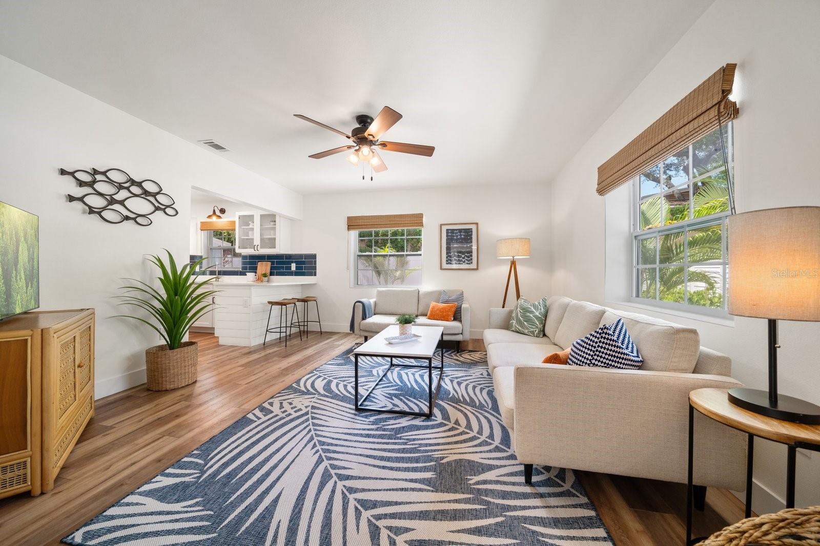 Ceiling Fans(s), Kitchen/Family Room Combo, Open Floorplan, Split Bedroom, Window Treatments