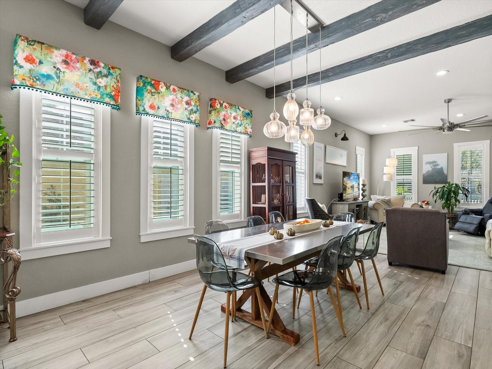 Ceiling Fans(s), Crown Molding, Eat-in Kitchen, High Ceilings, Living Room/Dining Room Combo, Open Floorplan, Primary Bedroom Main Floor, Solid Surface Counters, Thermostat, Walk-In Closet(s), Window Treatments