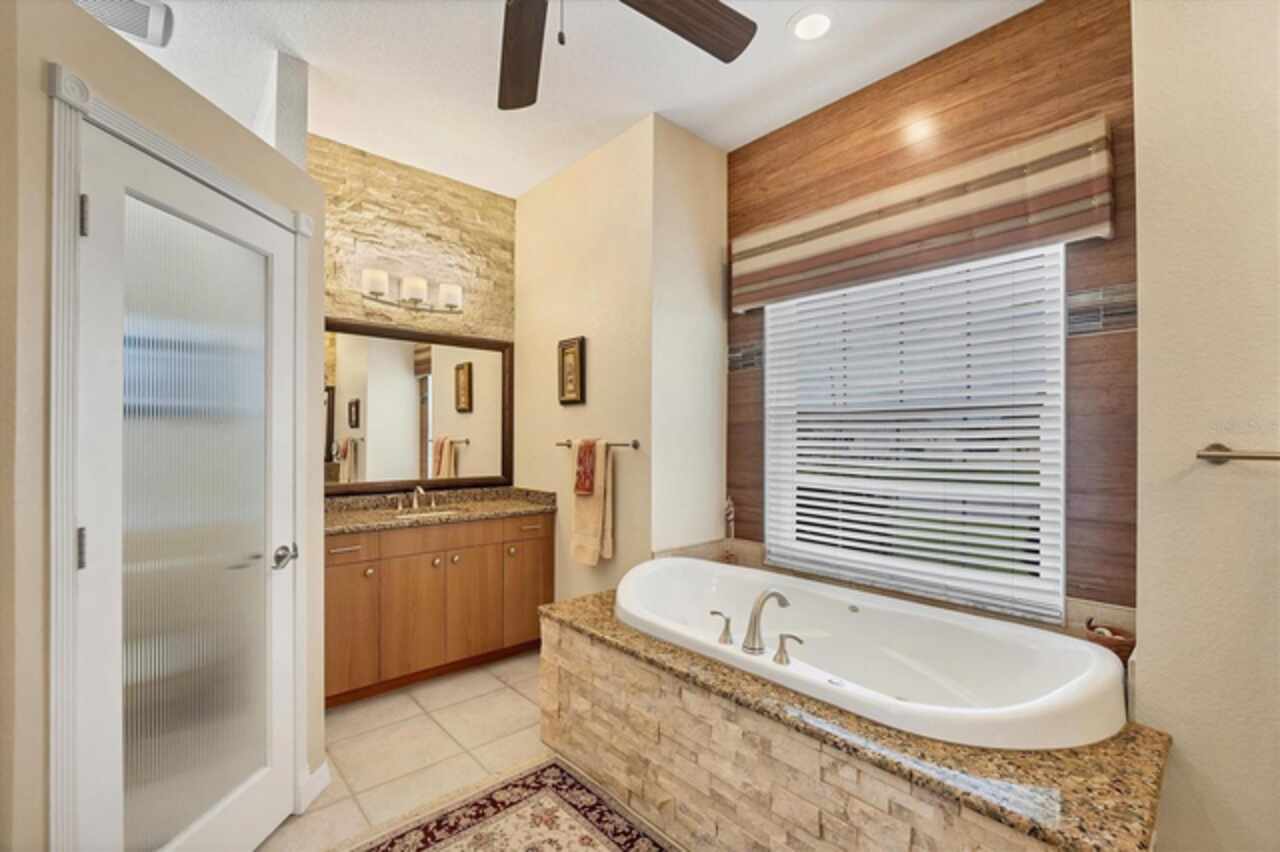 Built-in Features, Ceiling Fans(s), Coffered Ceiling(s), Crown Molding, Eat-in Kitchen, High Ceilings, Kitchen/Family Room Combo, Living Room/Dining Room Combo, Open Floorplan, Primary Bedroom Main Floor, Solid Surface Counters, Solid Wood Cabinets, Split Bedroom, Stone Counters, Thermostat, Tray Ceiling(s), Walk-In Closet(s), Window Treatments