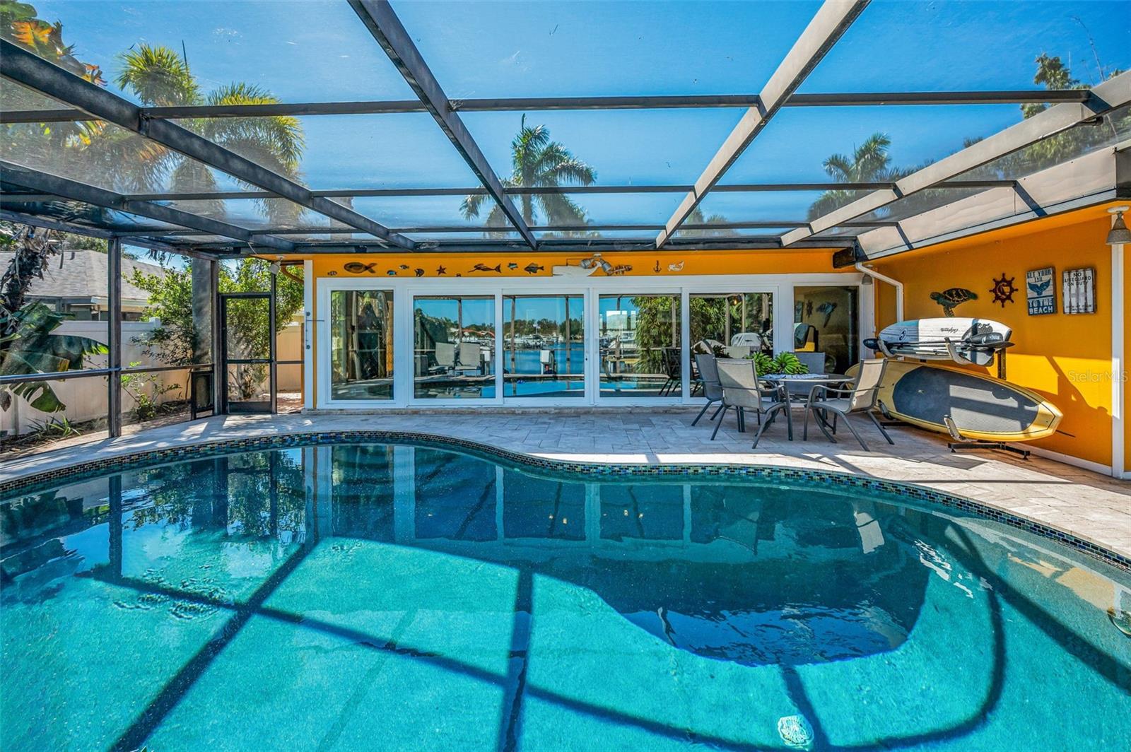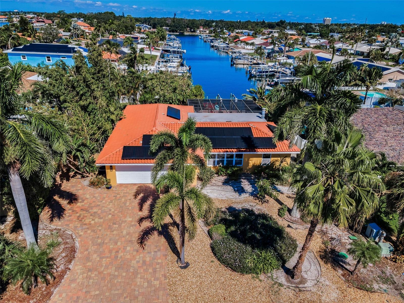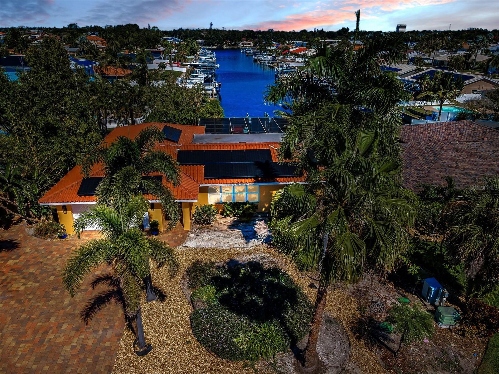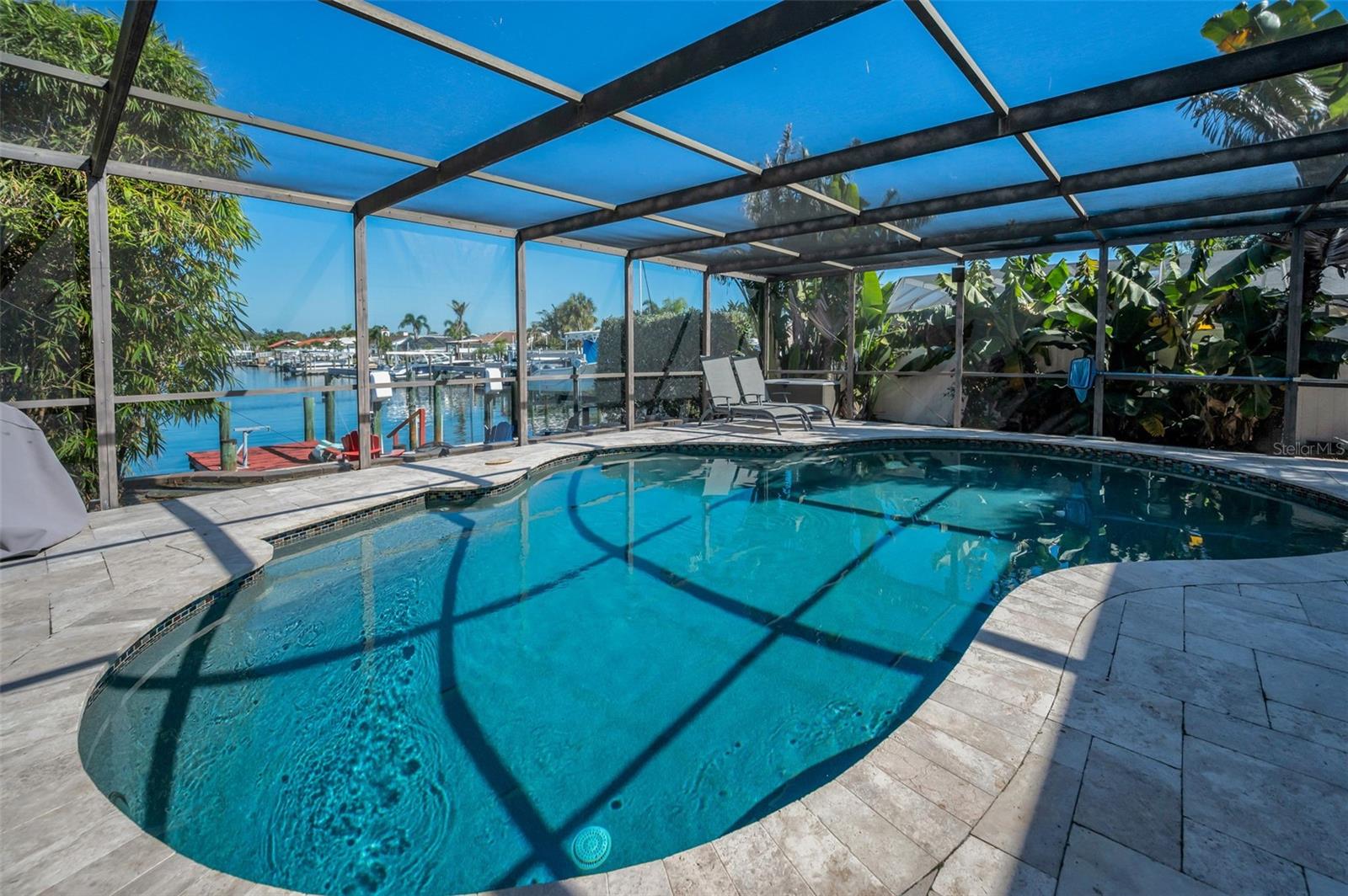 Broadwater. Extremely well maintained waterfront pool home. The base area is over 9ft above sea level protecting it from any flooding. No damage from either storm. Three bedrooms, two baths, 2, 262sq.ft. of living area, and a two car garage. Open floor plan with living/dining area, family room, and a large Florida room overlooking the newly renovated pool and water. Newly installed hurricane impact sliders all the way across the back facing the water. Other features: Large private maintenance free Xeriscaped property with beautiful brick pavers in front, side, and backyard areas. Pool completely refurbished in 2020 with Travertine decking and new pebble sheen finish, new primary bedroom vanity, new A/C in 2017, new hot water heater in 2017, new electrical service panel in 2017, large inside laundry area, natural gas, reclaimed water, lush landscaping, rear fire pit patio overlooking the water and more. New owner to reap the benefits of Solar panels that were installed in 2019 slashing power bills! Excellent overall location with easy access to shopping, dining, I-275, Tampa, and Sarasota. Wonderful well kept waterfront community. Be sure to view the beautiful virtual tour.