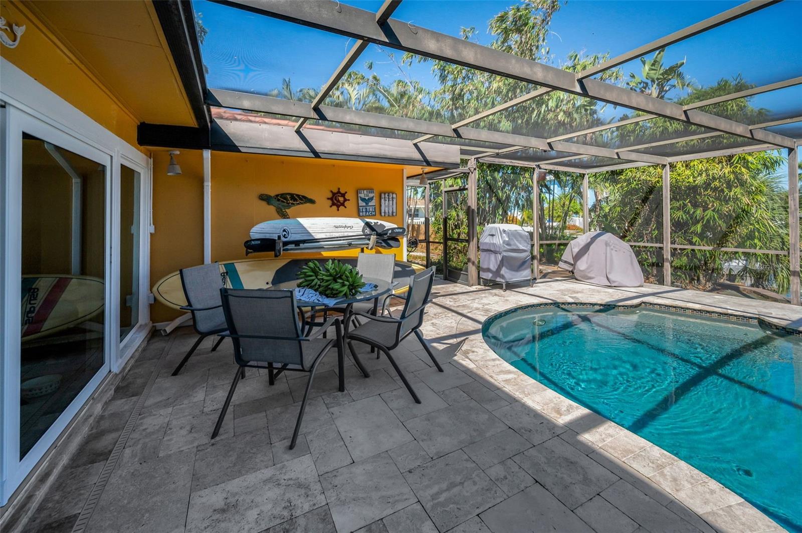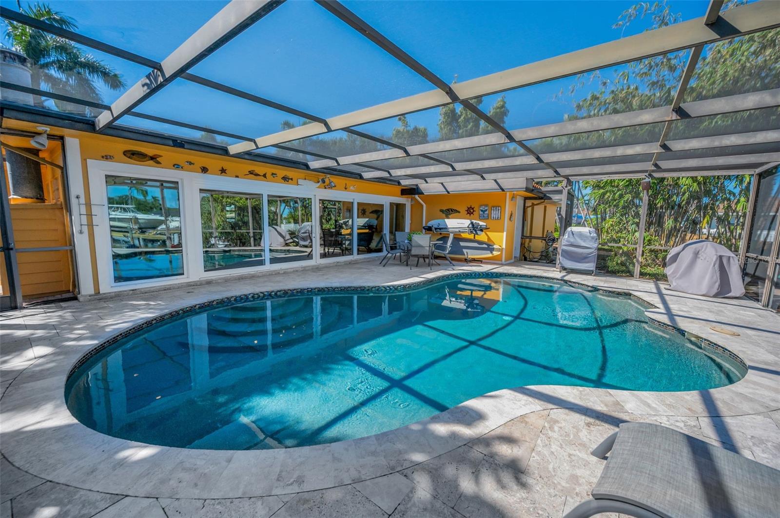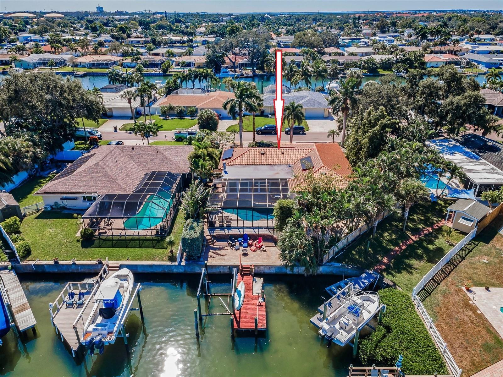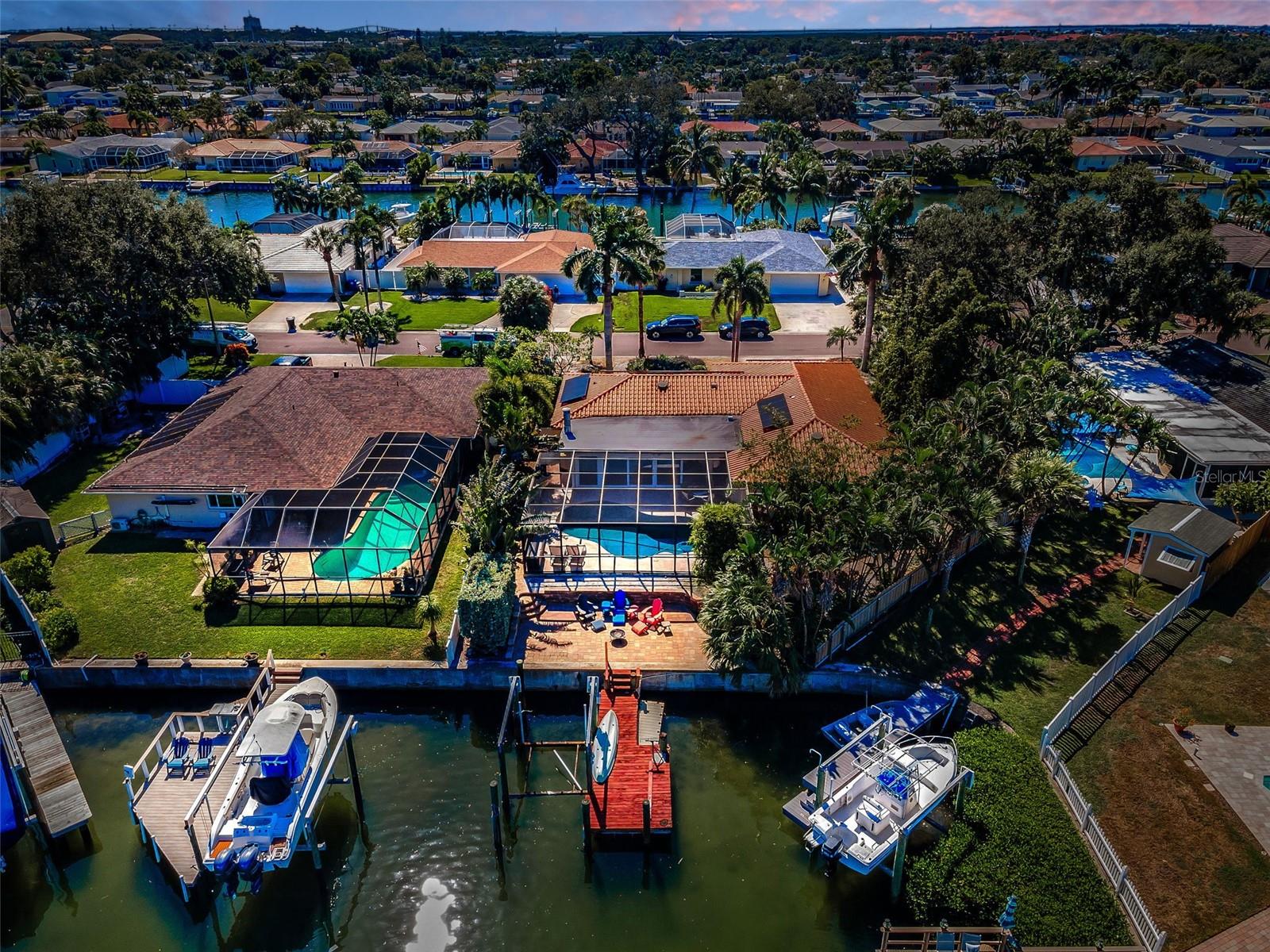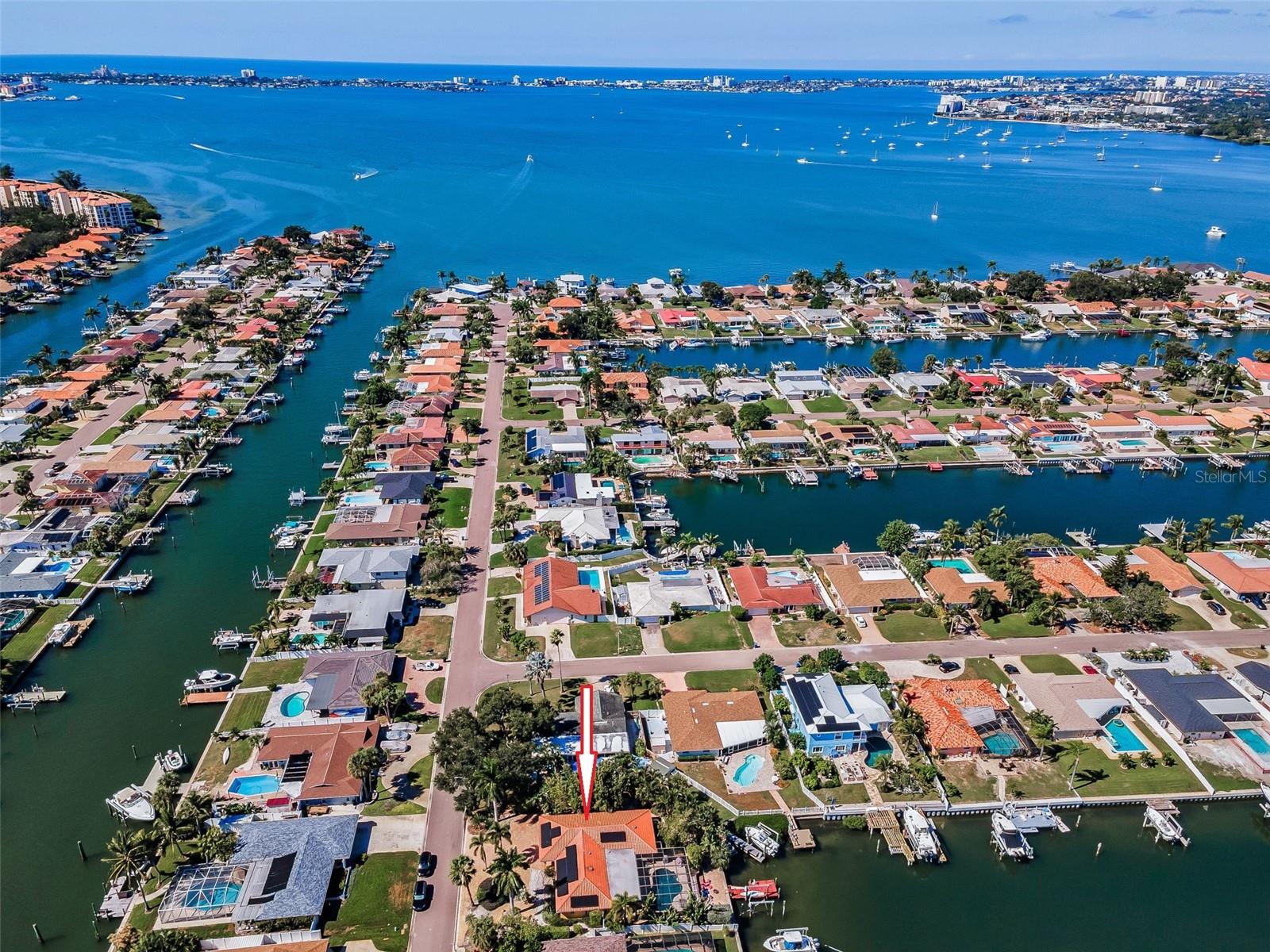 Broadwater. Extremely well maintained waterfront pool home. The base area is over 9ft above sea level protecting it from any flooding. No damage from either storm. Three bedrooms, two baths, 2, 262sq.ft. of living area, and a two car garage. Open floor plan with living/dining area, family room, and a large Florida room overlooking the newly renovated pool and water. Newly installed hurricane impact sliders all the way across the back facing the water. Other features: Large private maintenance free Xeriscaped property with beautiful brick pavers in front, side, and backyard areas. Pool completely refurbished in 2020 with Travertine decking and new pebble sheen finish, new primary bedroom vanity, new A/C in 2017, new hot water heater in 2017, new electrical service panel in 2017, large inside laundry area, natural gas, reclaimed water, lush landscaping, rear fire pit patio overlooking the water and more. New owner to reap the benefits of Solar panels that were installed in 2019 slashing power bills! Excellent overall location with easy access to shopping, dining, I-275, Tampa, and Sarasota. Wonderful well kept waterfront community. Be sure to view the beautiful virtual tour.