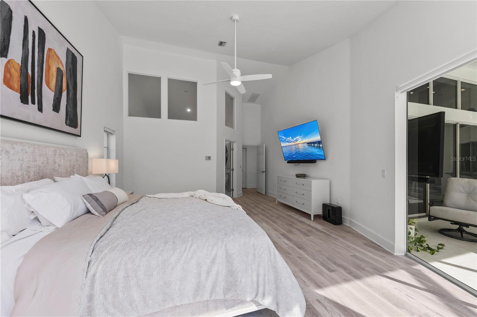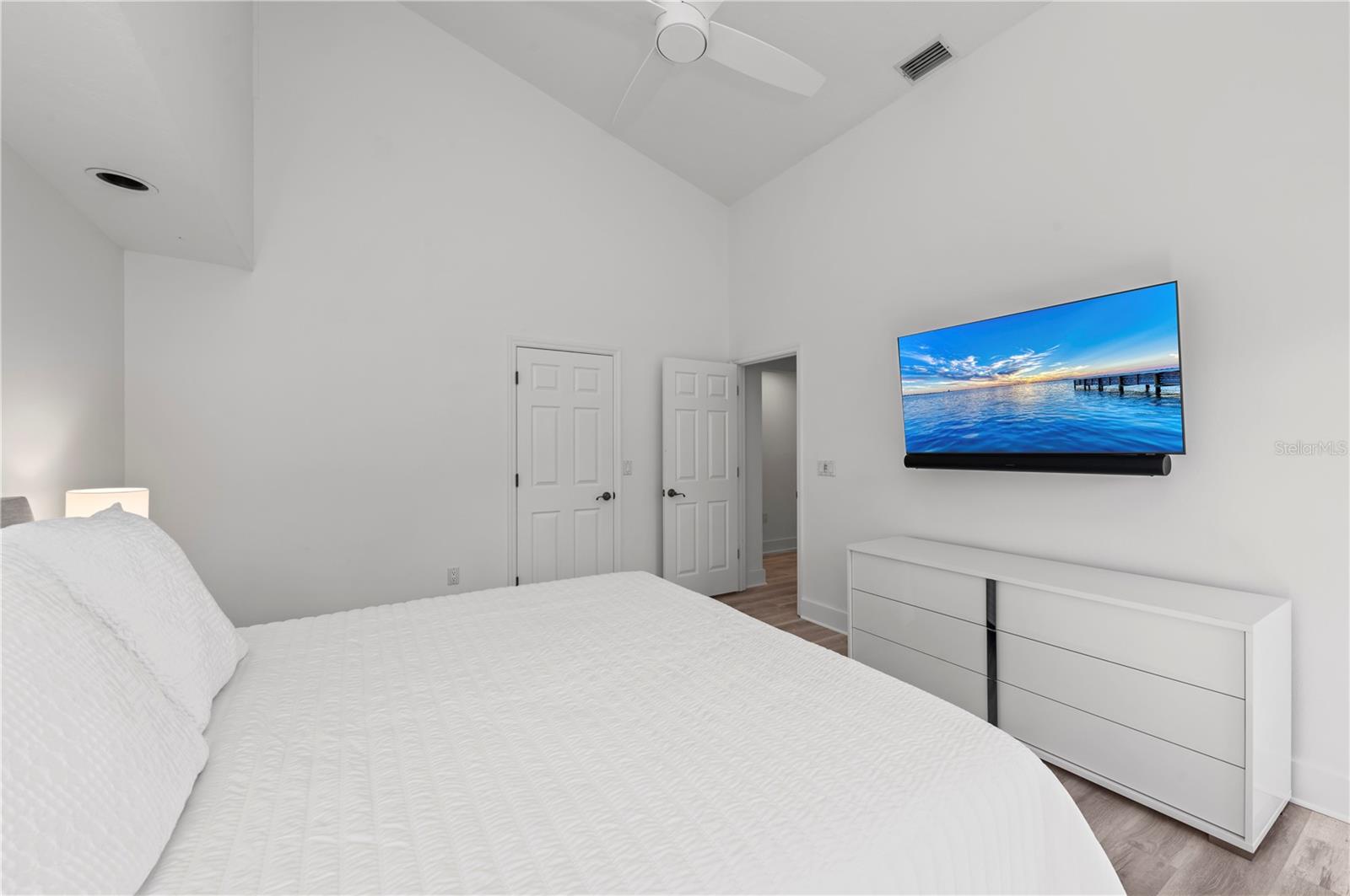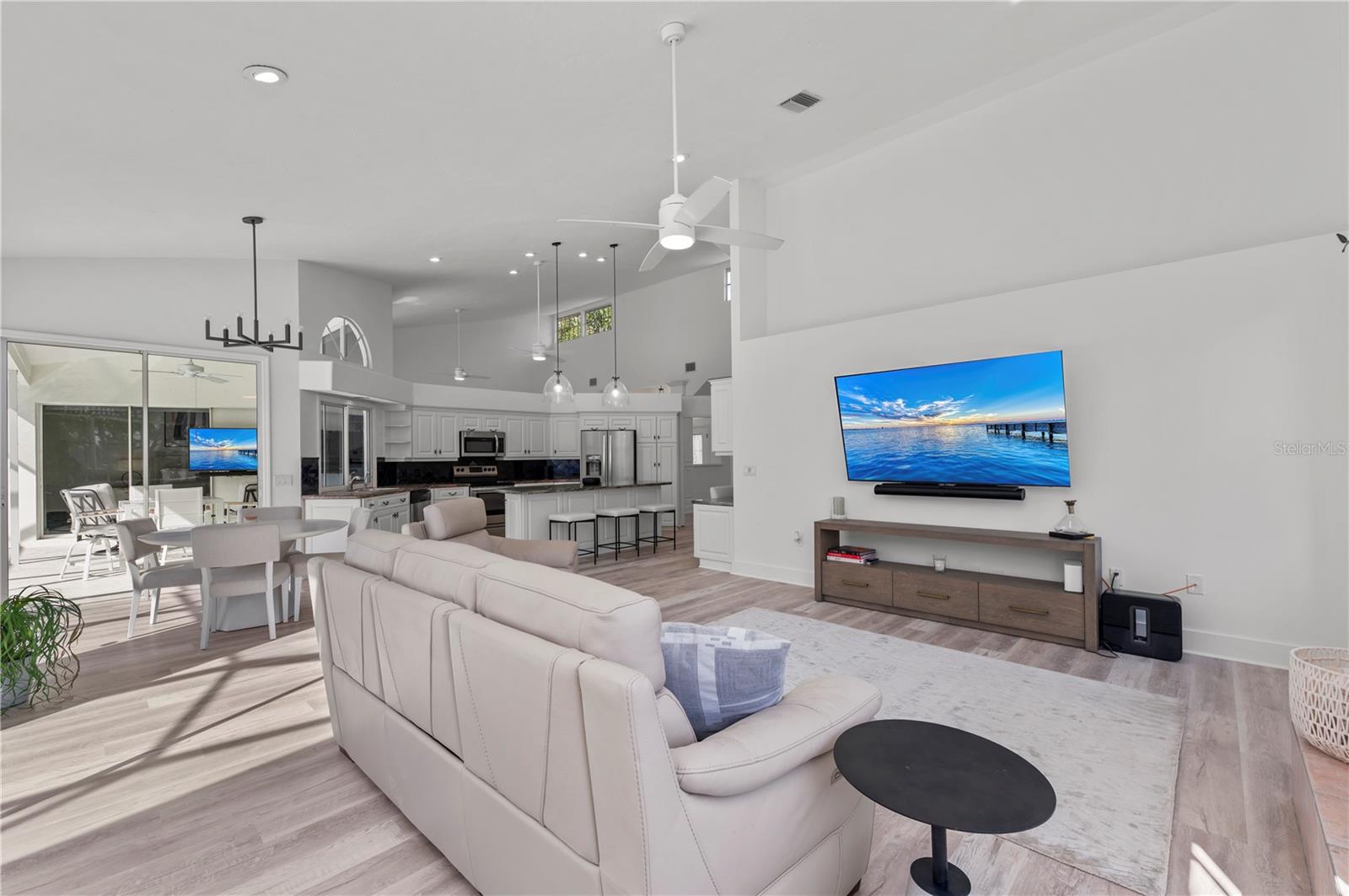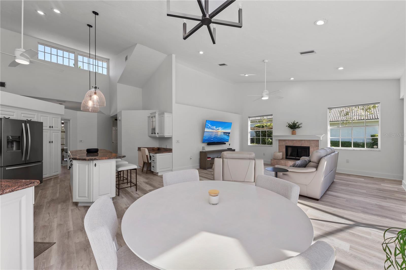 Ceiling Fans(s), Eat-in Kitchen, High Ceilings, Kitchen/Family Room Combo, Living Room/Dining Room Combo, Open Floorplan, Primary Bedroom Main Floor, Solid Surface Counters, Solid Wood Cabinets, Split Bedroom, Stone Counters, Thermostat, Vaulted Ceiling(s), Walk-In Closet(s), Window Treatments