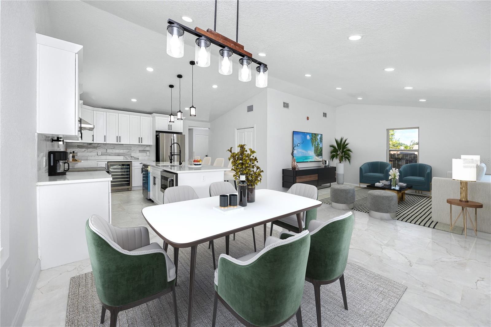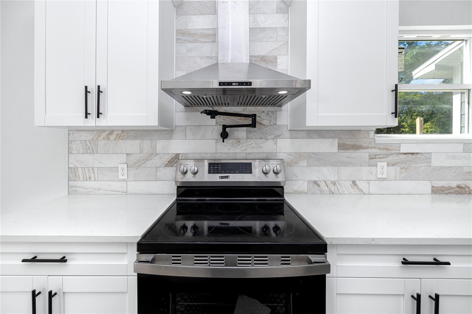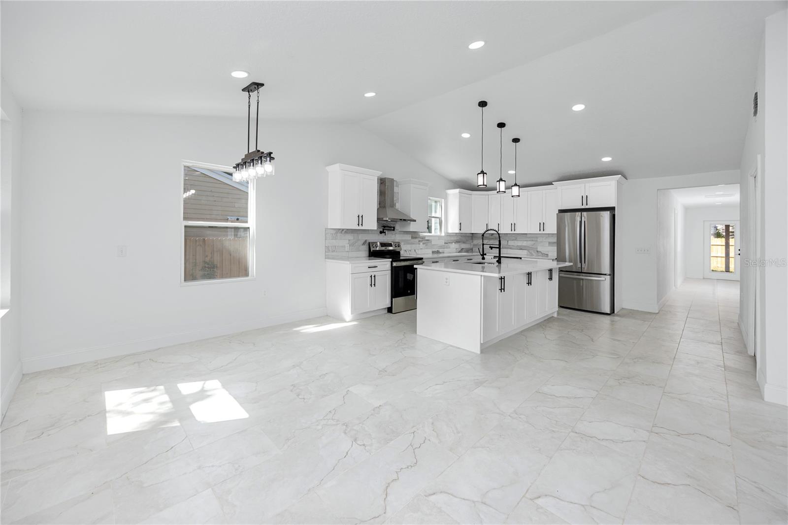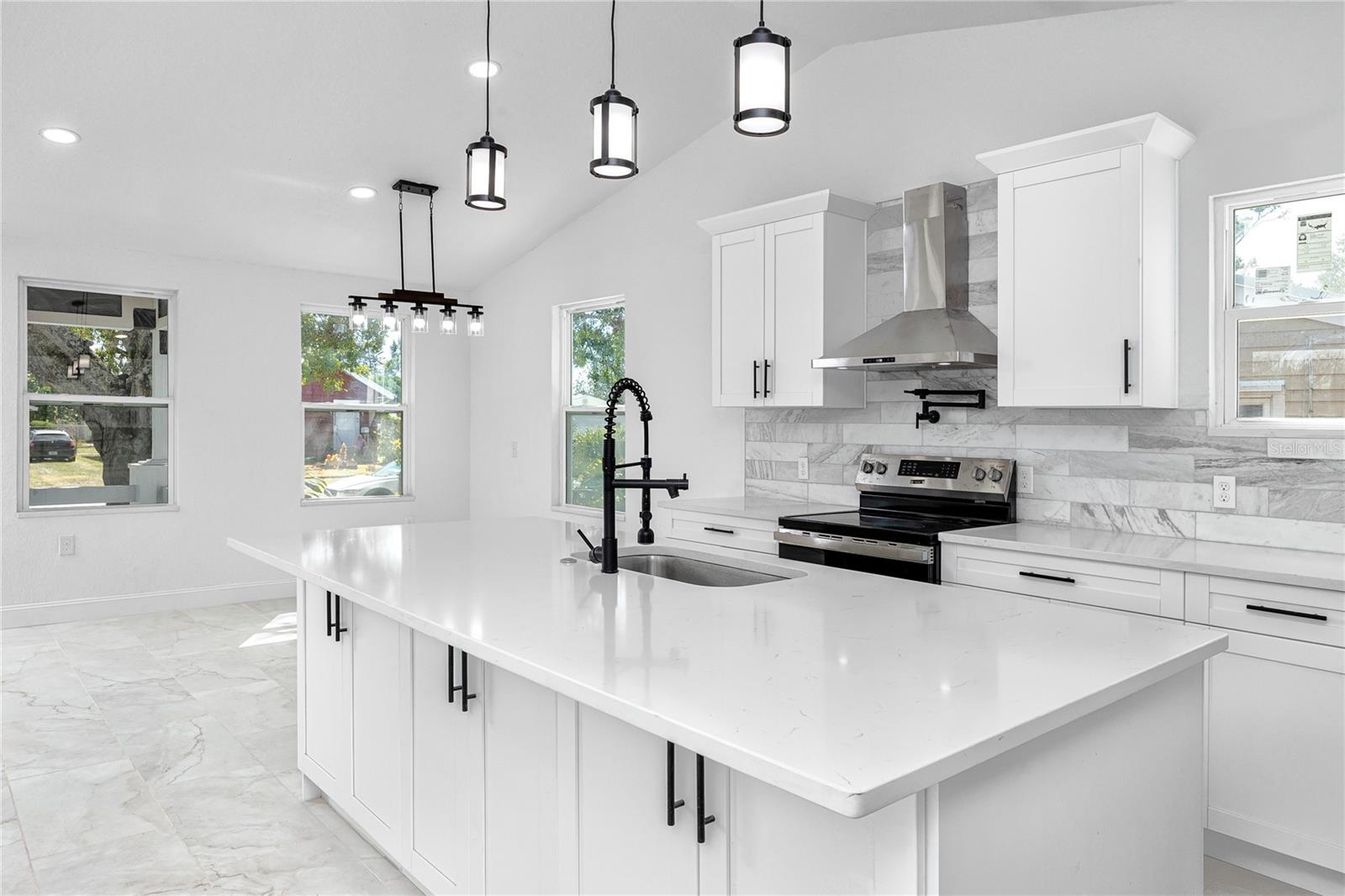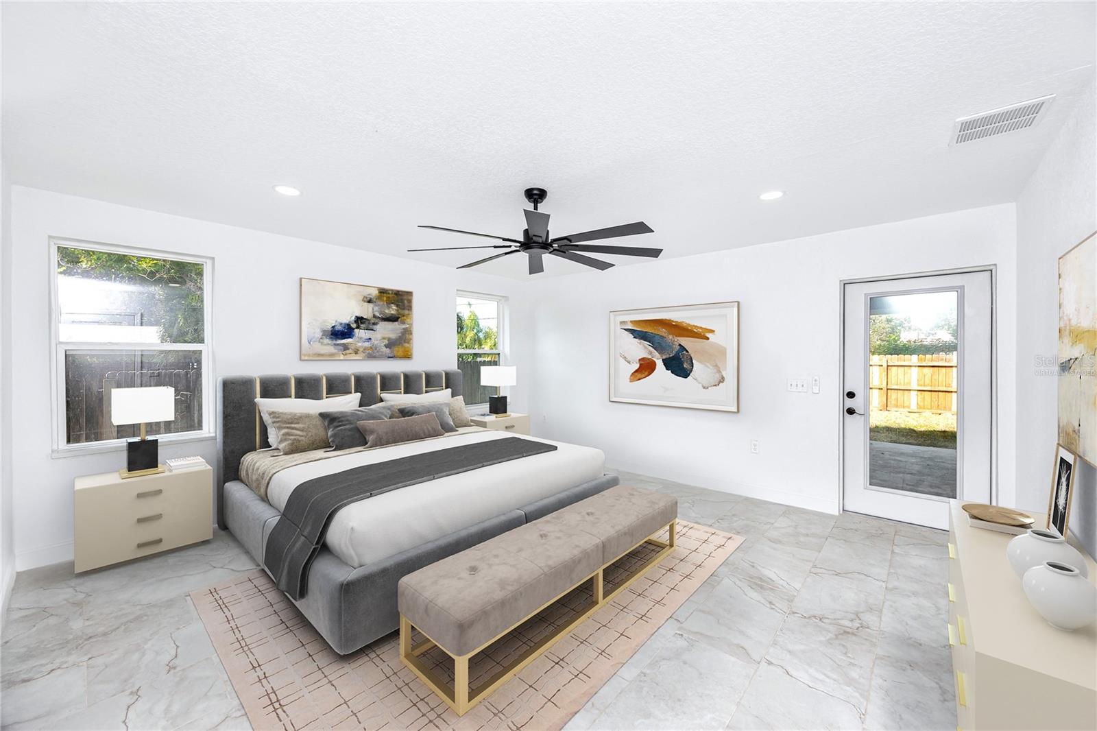 Fully remodeled and move-in ready, this charming North St. Petersburg bungalow blends modern luxury with timeless character—ideal for homeowners or investors seeking a turnkey property. Shaded by mature oaks, the freshly painted exterior welcomes you with a large covered front porch and brand-new driveway. Inside, soaring vaulted ceilings and an open split-bedroom floor plan create a bright, airy flow, enhanced by low-maintenance tile flooring and stylish new fixtures throughout. The chef-inspired kitchen features an expansive island with breakfast bar, quartz countertops and backsplash, solid wood cabinetry, brand-new GE stainless steel appliances including a built-in wine fridge and range hood, plus dual pot fillers for ultimate convenience. The primary suite offers private backyard access and a spa-like ensuite bath with a dual-sink vanity, water closet, and custom-tiled walk-in shower featuring both rain and handheld showerheads. The secondary bathroom mirrors the same elevated design with a new vanity, fixtures, and tub accented by the quartz tile work. Additional highlights include an interior laundry room with utility sink, a storage closet, and washer/dryer alcoves. Outside, enjoy an oversized covered back porch with recessed lighting and dual ceiling fans—perfect for entertaining or adding a hot tub—overlooking a fully fenced yard with alley access. Recent updates include a full electrical panel upgrade, ensuring peace of mind for years to come. Located in a quiet North St. Pete neighborhood just minutes from Tyrone Square, Northwest Park, and I-275, this home offers quick access to Downtown St. Pete, award-winning Gulf beaches, and top dining and shopping destinations. Whether you’re looking for a personal residence or a high-demand investment opportunity, this beautifully updated home delivers the best of Florida living in one of St. Petersburg’s most convenient and desirable locations.